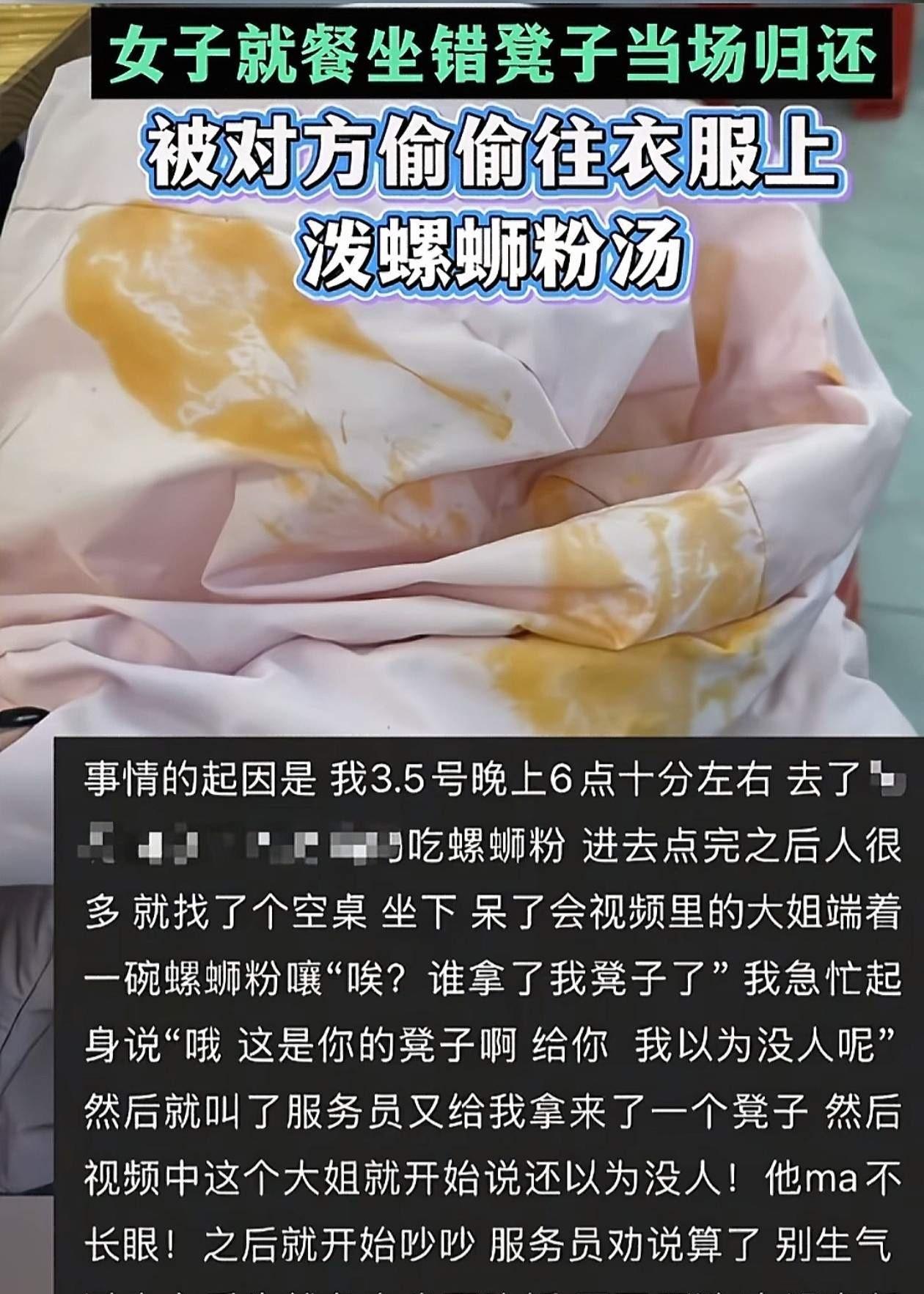 太坏了!估计她自己也没有想到,自己只是坐错一个位置就被人用螺蛳粉汤算计,好在人已经找到! 女子当时去店内吃螺蛳粉,因为人多,就随便找了个位置落座,谁也不知道这个原来有人 原本这个座位的人过来之后,女子也及时起身还给对方的板凳,但是对方依旧骂骂咧咧,咬着不放手那样的 过了一会儿,女子正低头嗦粉,没想到对方竟然悄摸往自己帽子里舀螺蛳粉的汤,自己还毫无察觉 我平时碰到别人一下都要说对不起,像这样做事儿的,我是万万没想到,不用说,这个女子不仅要对方道歉,衣服肯定也是要赔偿的