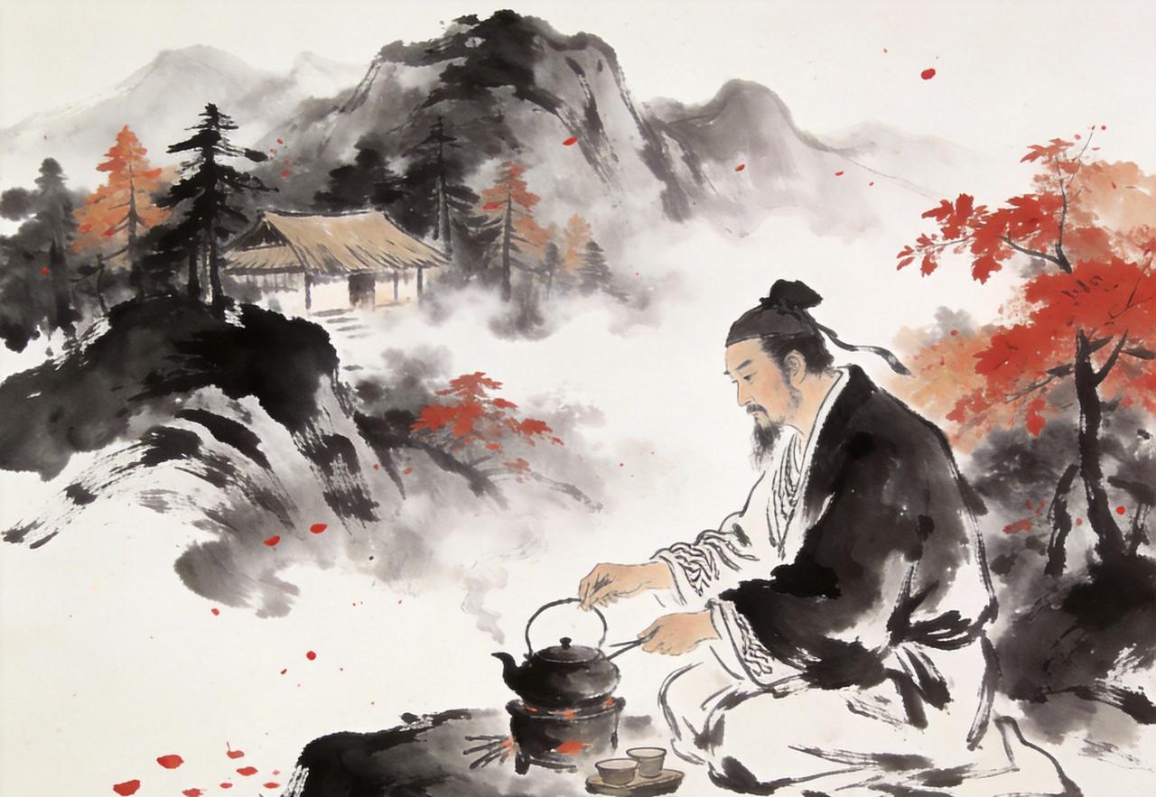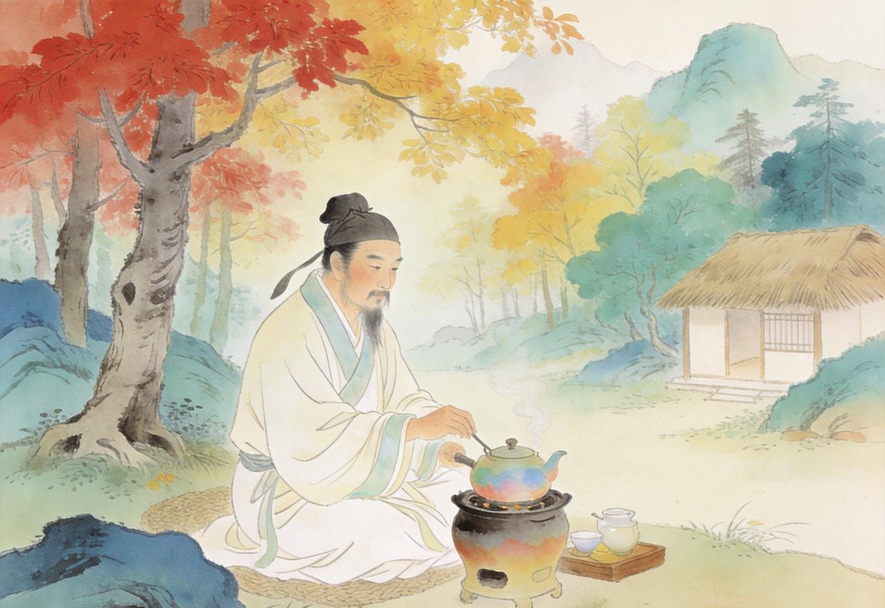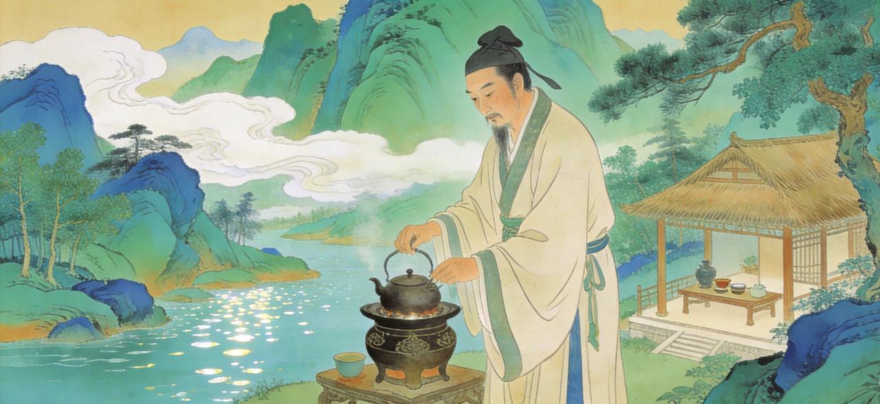 陆羽煮茶图 陆羽煮茶图的系列创作,涵盖工笔重彩、水墨写意、青绿山水、工笔淡彩四种艺术风格,以及山林茅舍、寺院禅房、文人书斋三个经典场景。作品融合唐代茶器、服饰与建筑特征,生动展现茶圣陆羽的隐逸情怀、禅茶精神与著书专注,传承茶道文化精髓。陆羽
