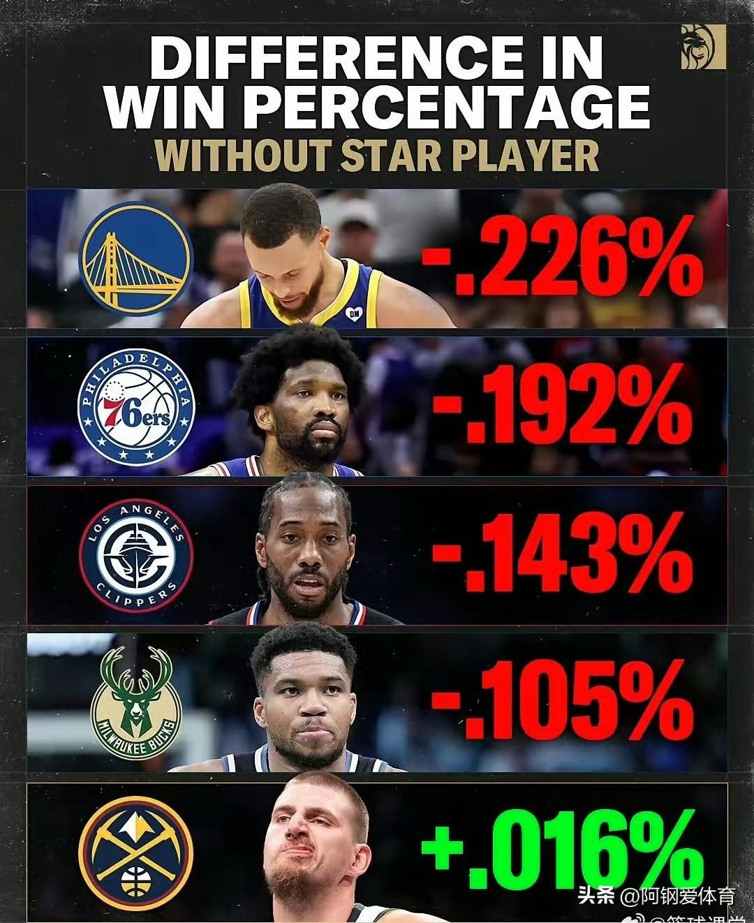NBA球星缺阵时,球队胜率的变化幅度: —— 库里(勇士):胜率下降 22.6% —— 恩比德(76人):胜率下降 19.2% —— 伦纳德(快船):胜率下降 14.3% —— 字母哥(雄鹿):胜率下降 10.5% —— 约基奇(掘金):胜率反而提升 0.16% 从这些数据中能看出各位球星对于球队的影响力有着显著差异。像库里,他缺阵时勇士胜率下降22.6%,这足以说明库里在勇士体系中的核心地位。库里那无解的三分球和出色的组织能力,能为队友创造出大量得分机会,他不在场时,球队进攻火力明显不足,防守端也少了一份压迫力。 恩比德缺阵时76人胜率下降19.2%,恩比德作为内线巨无霸,进攻手段丰富,篮板和护框能力也很强。他的缺阵让76人在内线攻防两端都陷入被动,战术体系也会大打折扣。 伦纳德缺阵时快船胜率下降14.3%,伦纳德是攻防一体的巨星,他在场上时能给对手极大的牵制。进攻端他的单打能力出色,防守端能限制对手的核心球员,他的缺席让快船在关键比赛中的竞争力下降。 字母哥缺阵时雄鹿胜率下降10.5%,字母哥的冲击力和统治力是雄鹿的重要依仗。他的突破能撕开对手防线,为队友创造机会,他不在场时,雄鹿的进攻节奏和内线优势都会受到影响。 而约基奇缺阵时掘金胜率反而提升0.16%,这可能是因为掘金的团队篮球体系非常完善。当约基奇不在场时,其他球员有了更多的球权和发挥空间,球队的进攻变得更加流畅,球员之间的配合也更加默契。不过这也只是暂时的现象,约基奇作为联盟顶级中锋,他的全面性和组织能力对掘金的长远发展至关重要。