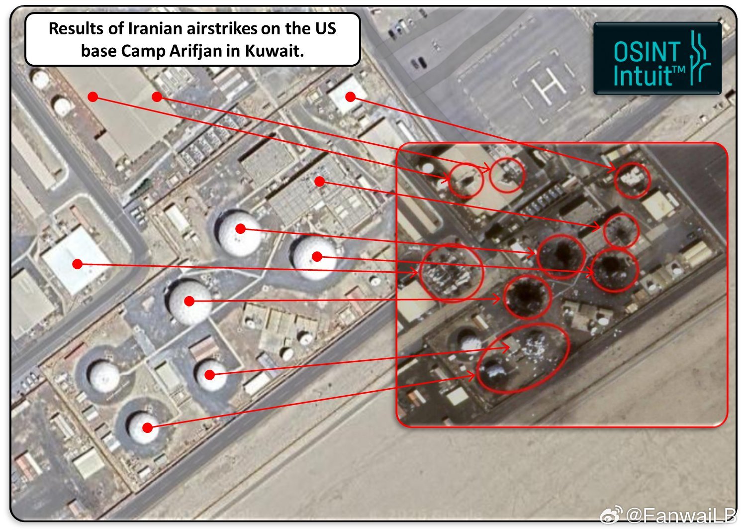 • 科威特舒艾巴港:该民用港口的战术作战中心遭到直接袭击。3月1日,六名美军士兵在此地遭无人机袭击身亡。该地点与阿里夫詹营地不同。