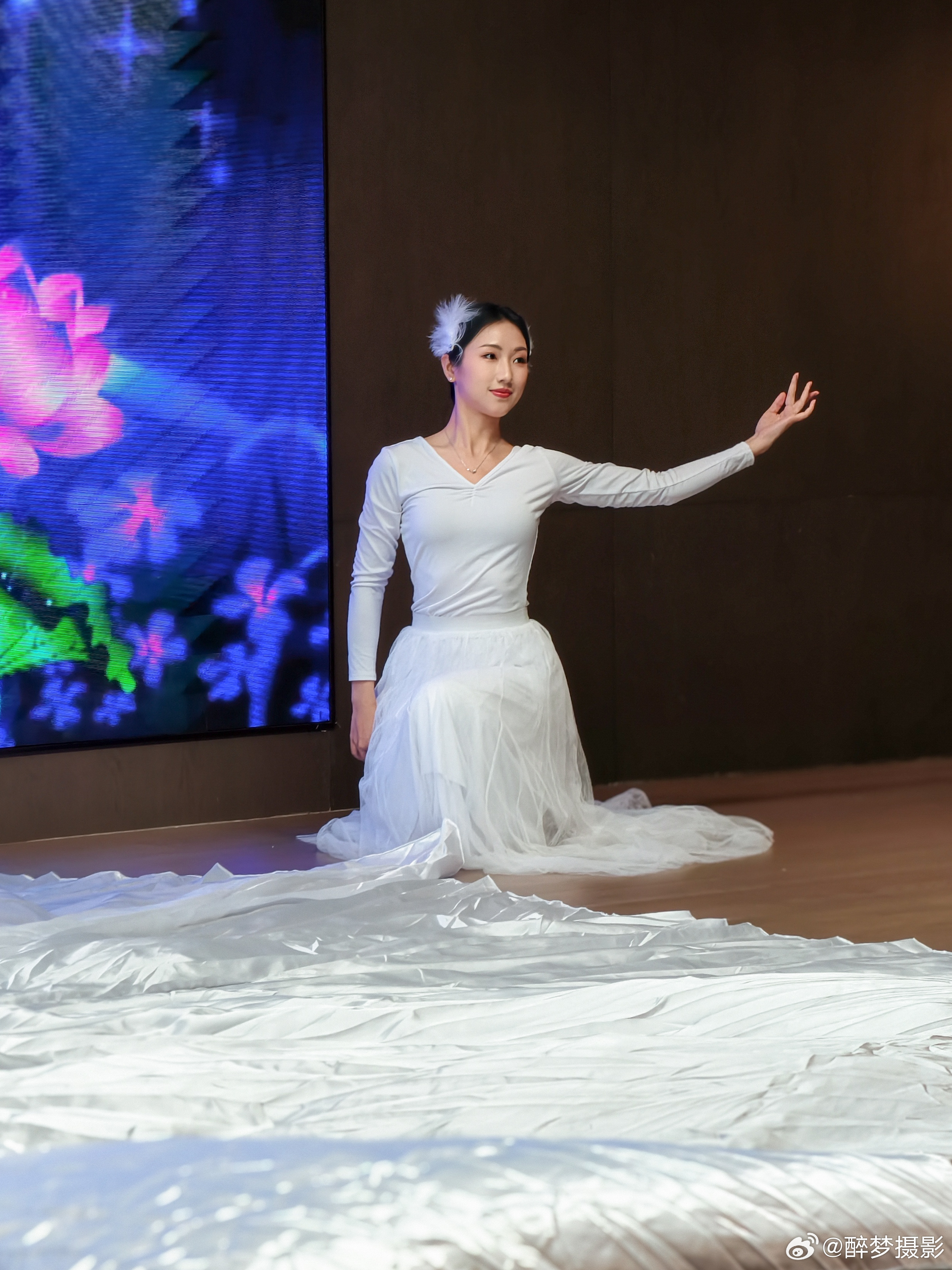 🌊《海洋精灵》舞动时刻 白衣翩跹如浪花,发间羽饰似海风轻拂。在梦幻蓝屏与莲花