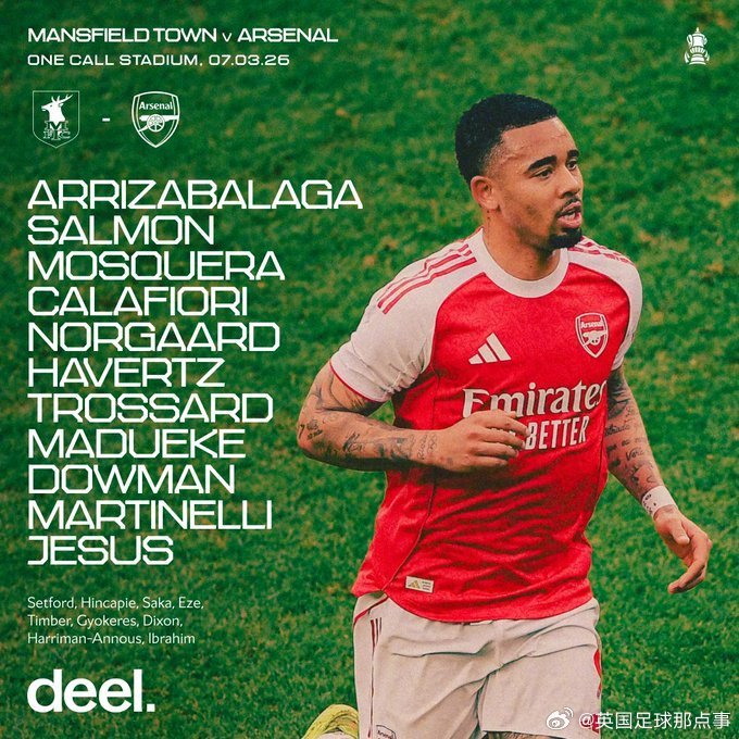 阿森纳首发:13-凯帕、89-萨尔蒙、3-莫斯克拉、33-卡拉菲奥里、16-诺尔高、19-特罗萨德、56-道曼、20-马杜埃凯、29-哈弗茨、11-马丁内利、9-热苏斯