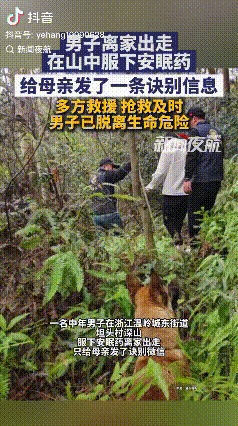 人到中年还这么不懂事,一个人带着药罐跑去山中轻生,家中的老母亲急得不行。近日,浙江台州有一名中年男子,离家独自上山后,给母亲发去了一条短信,大意是在山中服了安眠药,跟母亲最后诀别。 当地义警救援收到通知后,立马带着警犬奔赴事发地,在几位民警的安排下,9人分成了三批。 第一队人马直接深入核心地点,争取第一时间找到男子, 第二队人马沿着山路迂回往里面,避免和第一队的搜救重合,在可控能力下尽量去扩大搜救范围。 第三队人马是无人机热成像,来回穿插在一队和二队的中间区域,尽可能给两队提供线索。 三队人马形成网状搜救覆盖,希望能找到男子,当天的下午14点,搜救队已经进入了半山腰的位置,越往上走草越高,越不好走,沿途只能用手劈开草堆才能前进。 好在功夫不负有心人,14点10分左右,第二队中的警犬似乎有了重大发现,迅速往上面的陡坡跑去。 搜救队员黄金国也在附近发现了似乎有人踩过脚的痕迹,接着就向其他两队报道最新情况,让大家都朝这边赶来。 仅仅10分钟,警犬就停滞不前,并大声狂吠,黄金国过来一看,见有一人躺在地上不动,旁边还有安眠药和一瓶饮料,依据家属提供的衣服等相关信息,基本确定就是要找的男子。 男子当时已经昏睡,因为不清楚男子的服药时间,但好在气息还在,必须立马进行急救。 增援力量赶到后,众人才将男子抬下山,并送去了医院。 没多久,好消息传来,男子已经脱离生命危险。如果没有这么多搜救队员第一时间进山,男子结局几乎可以预知。 男子被救下来,除了要感谢他的母亲第一时间报警外,更要感谢参与救援的这些义警,另外幸好是在下午,如果晚上的话,找起来还不会这么顺利。 成年人的世界里,没有容易二字。 虽然不清楚男子到底经历了什么,但这也说明有些人表面平静,内心或许早已千疮百孔。 家里还有老母亲要赡养,男子却选择轻生遮天不归路,实属不应该,死亡不是痛苦的结束,却把这无尽的绝望,留给了最爱你的人,真的忍心吗? 另外,9 名义警带着警犬,加上无人机、热成像,不顾一切地进山,是这些好心人在和时间赛跑,他们愿意为一个陌生人拼命!值得点赞和褒奖。 但愿,经过这起事件后,这位台州男子可以明白,连死都不怕,还怕活着?就凭那些营救你的人,你都值得再活一次!