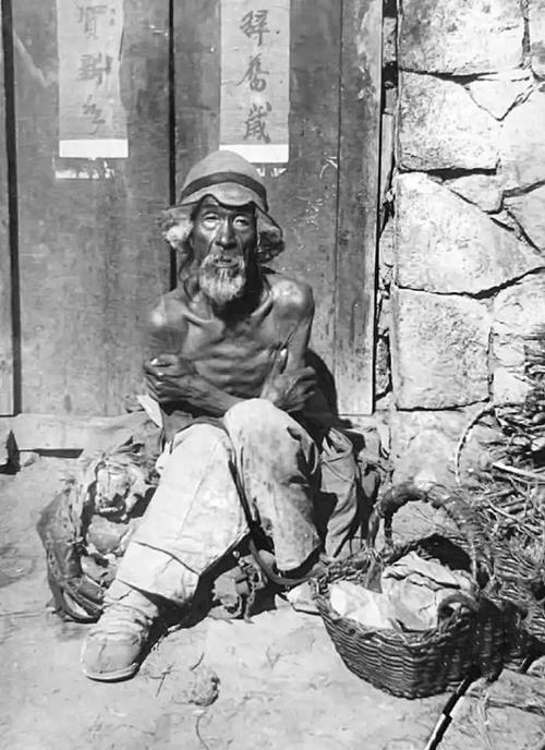 这张照片拍摄于晚清的春节前后,一个万家团圆的节日里,一位无家可归的老年乞丐瘦骨嶙峋,几乎衣不蔽体,双臂紧紧抱在胸前,试图在凛冽的寒风中取暖。 有资料指出,摄影师可能为了突出他的悲惨处境,让他脱掉了原本就破旧不堪的棉衣,刻意展示其骨瘦如柴的身体。他身旁的竹篮,可能是他乞讨的工具,他坐在一户人家的门口,身后象征着团圆与温暖的春联,而他自己却无家可归,这种强烈的反差,更凸显了他的孤独与绝望。