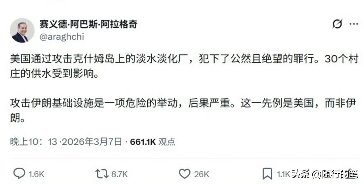 伊朗外长发文指责美国袭击伊朗格什姆岛上的海水淡化厂,伊朗外长一语双关表示美国开了袭击基础设施的先例。 这意味着接下来如果伊朗为了对等报复,袭击以色列境内的基础设施也就没有思想包袱了。要知道以色列面积很小,人口密集,水厂的位置很容易被伊朗的导弹定位,如果伊朗下定决心要攻击以色列境内的水厂,根本没有难度。这样一来,必定会导致以色列内部民众的生活产生严重影响,进而对以色列与美国对伊朗这场战争更加反感。所以,接下来伊朗接如果袭击以色列,可以一举两得,既起到报复的目的,也让以色列内部民心动荡。坦白说,美国袭击伊朗基础设施这个决定,既没有人道精神,也给伊朗找到了袭击以色列境内基础设施的理由,反而让以色列会付出惨痛的代价。