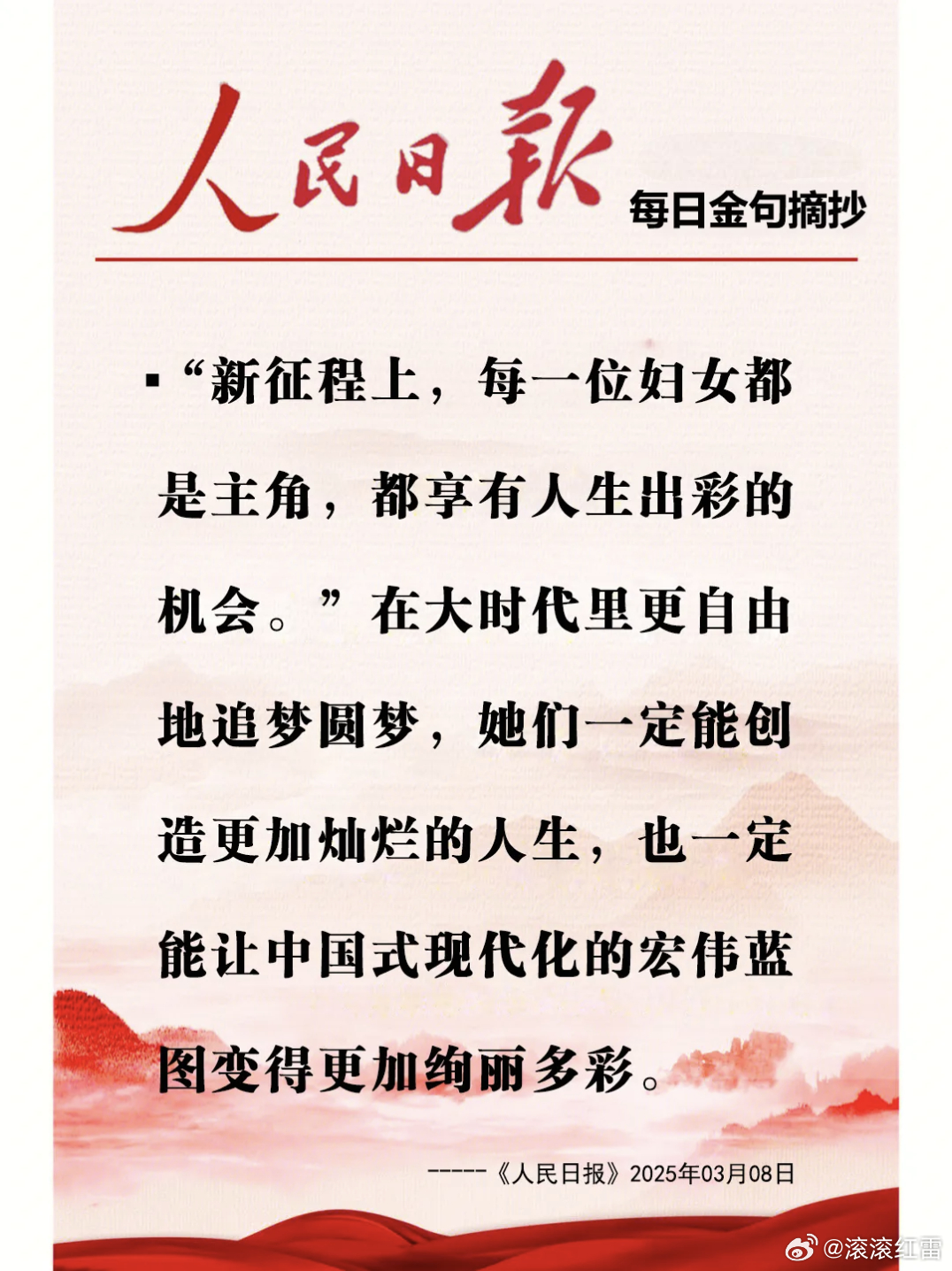 【每日金句积累学金句】“新征程上,每一位妇女都是主角,都享有人生出彩的机会。”在大时代里更自由地追梦圆梦,她们一定能创造更加灿烂的人生,也一定能让中国式现代化的宏伟蓝图变得更加绚丽多彩。三八妇女节女神节快乐