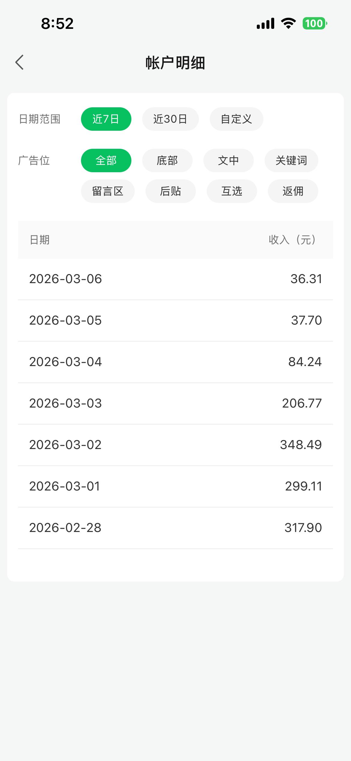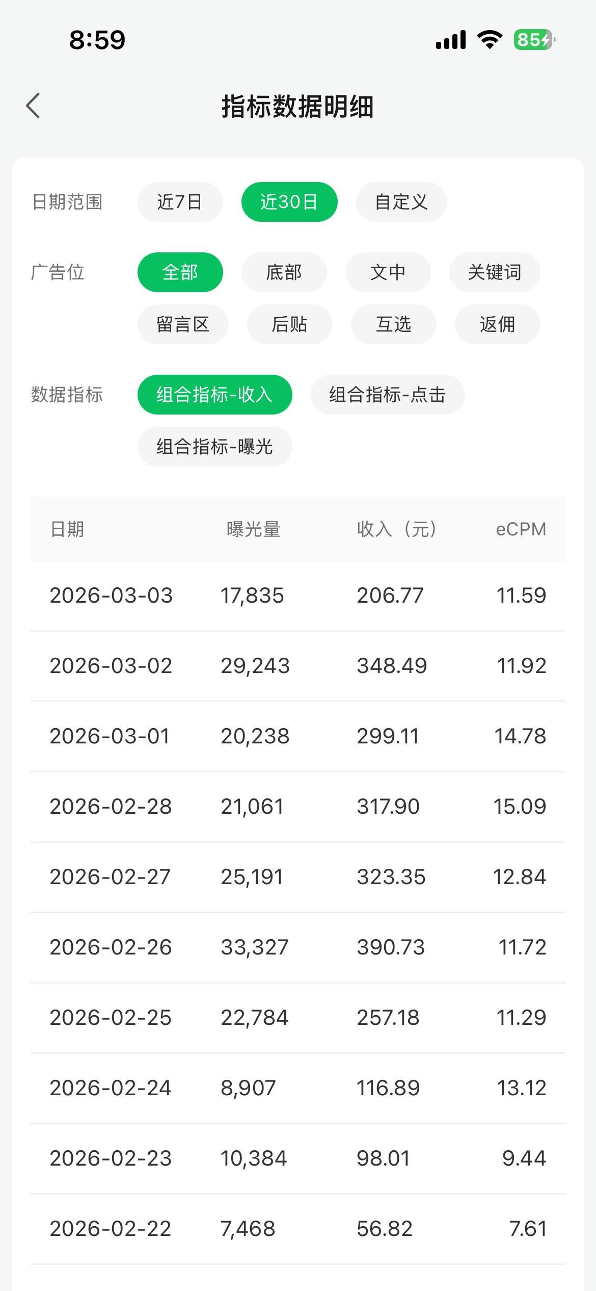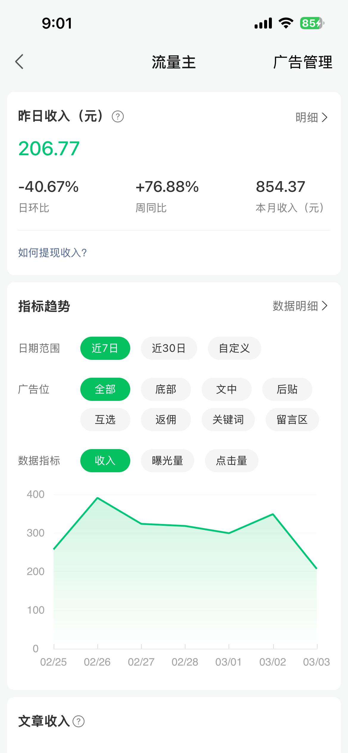 公众号前一阵每天收益都是维持到300元至400元之间,这两天的收益只有30多元,是不是前一阵少了90%以上,也就是说只有前一阵收益的百分之十。 为什么前一阵收益那么高?就是因为有一篇是爆款阅读量现在停止到127.59万,流量池就不再推荐了。 这篇文章从2月25号开始写的,平台一直强劲的推荐到了3月5号,这个时候平台推荐就不怎么动了。 昨天晚上又抓紧写了一篇,其实这篇文章已经在脑海里酝酿了一天,昨天晚上睡觉前才发的,今天早晨起来一看阅读量又是两万多,希望这篇文章再开启我的爆款之路。 最好是一篇接一篇的爆款,让我在爆款的路上越走越好。 请亲爱的朋友们,来祝福我吧!我也希望我亲爱的朋友们也是天天出爆款,能够赚得盆满钵满,让我们携手走进爆款时代!