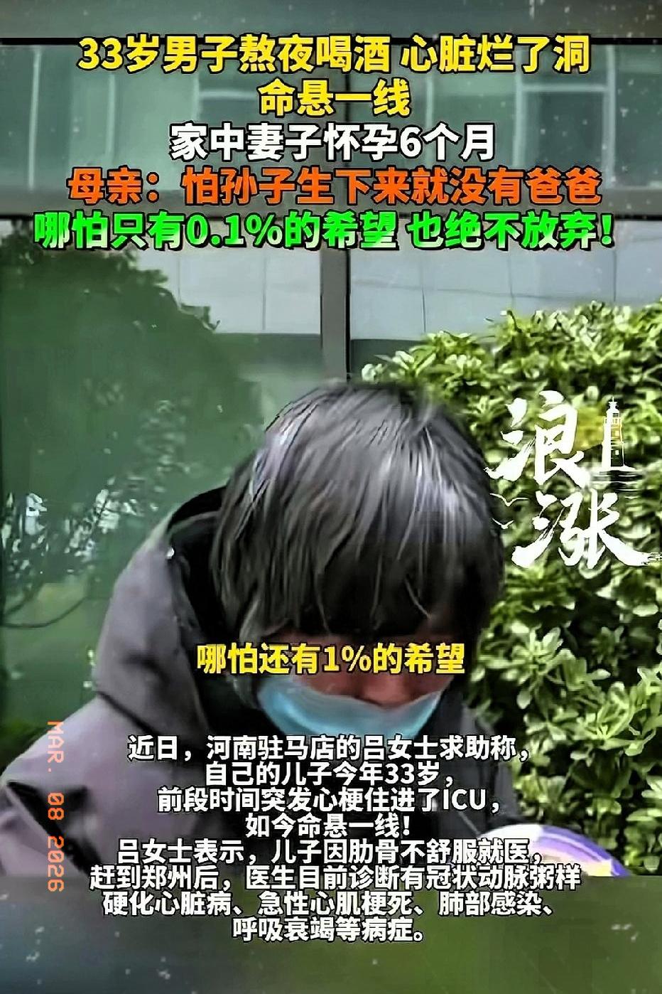 近日河南驻马店,一33岁男子长期熬夜喝酒,心脏“烂了洞”,命悬一线!家里还有怀孕6个月的妻子!母亲哭诉:孙子不能没爸爸,哪怕只有0.1%的希望,也绝不放弃! 男子平时工作忙,经常熬夜加班,还爱喝点酒。前段时间突然胸痛倒地,送医后被诊断为心脏室间隔穿孔——简单说,就是心脏“烂了个洞”。情况危急,随时有生命危险。 家里瞬间天塌了。妻子挺着6个月孕肚守在病房外,整夜不敢合眼。母亲红着眼圈跟医生说:儿媳妇怀孕6个月了,孙子还没出生,不能没有爸爸。哪怕只有0.1%的希望,我们也治,绝不放弃! 视频发到网上后,网友破防了:这就是妈妈,只要还有一口气,她就得给孩子撑下去。也有网友心疼妻子:挺着大肚子扛这种事,太难了。更多人劝:熬夜喝酒,真的在拿命开玩笑。 话说,你身边有没有因为生活习惯生大病的?健康面前,真别侥幸。