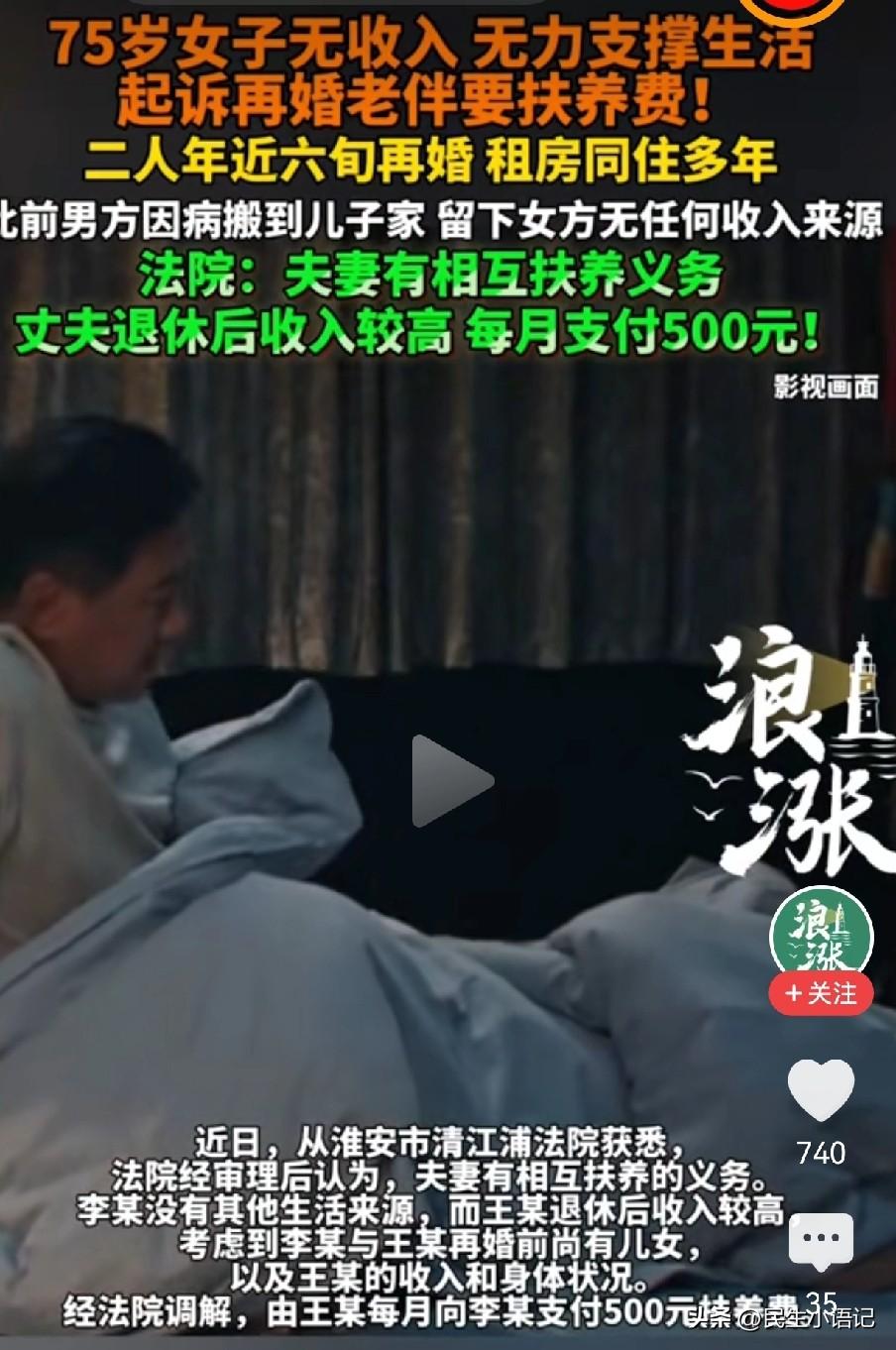 万万没想到!就算不在一起生活,只要还是夫妻,就得养你!江苏淮安最近出了一件让人长见识的真事。 一位75岁的老奶奶,没有退休金、没有任何收入,生活都难以为继。她的再婚老伴由于身体原因,去了儿子家养病,两个人已经二年没有生活在一起了。但结婚证还有法律效力,婚姻关系依然存续。 走投无路之下,老人直接把已经没有再居住在一起的老伴起诉到法院,要求对方支付抚养费。男方觉得很委屈,觉得她有自己的子女,应该让子女赡养,跟我有什么关系呢?两个人已经分居生活这么多年了,怎么还让他出钱照顾。 但法院说得很明白:只要没离婚,夫妻就有相互扶养的法定义务。不管是不是再婚、不管有没有分居,只要一方年老无收入、生活困难,另一方有能力,就必须管。 最终调解结果:有收入的老伴每月支付没有收入的另一半500元。 这事儿给所有人提了个醒: 结婚证不是一张废纸,婚姻不是搭伙就散,法定义务,躲不掉、推不了。 对此你怎么看?欢迎评论区留下您的宝贵意见 (图片来自网络视频)