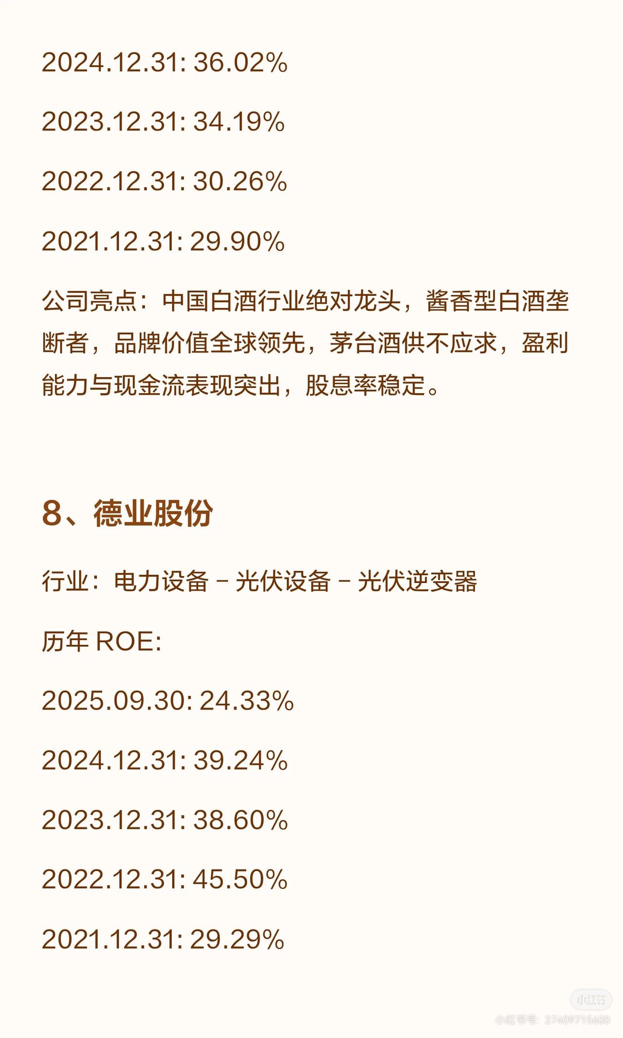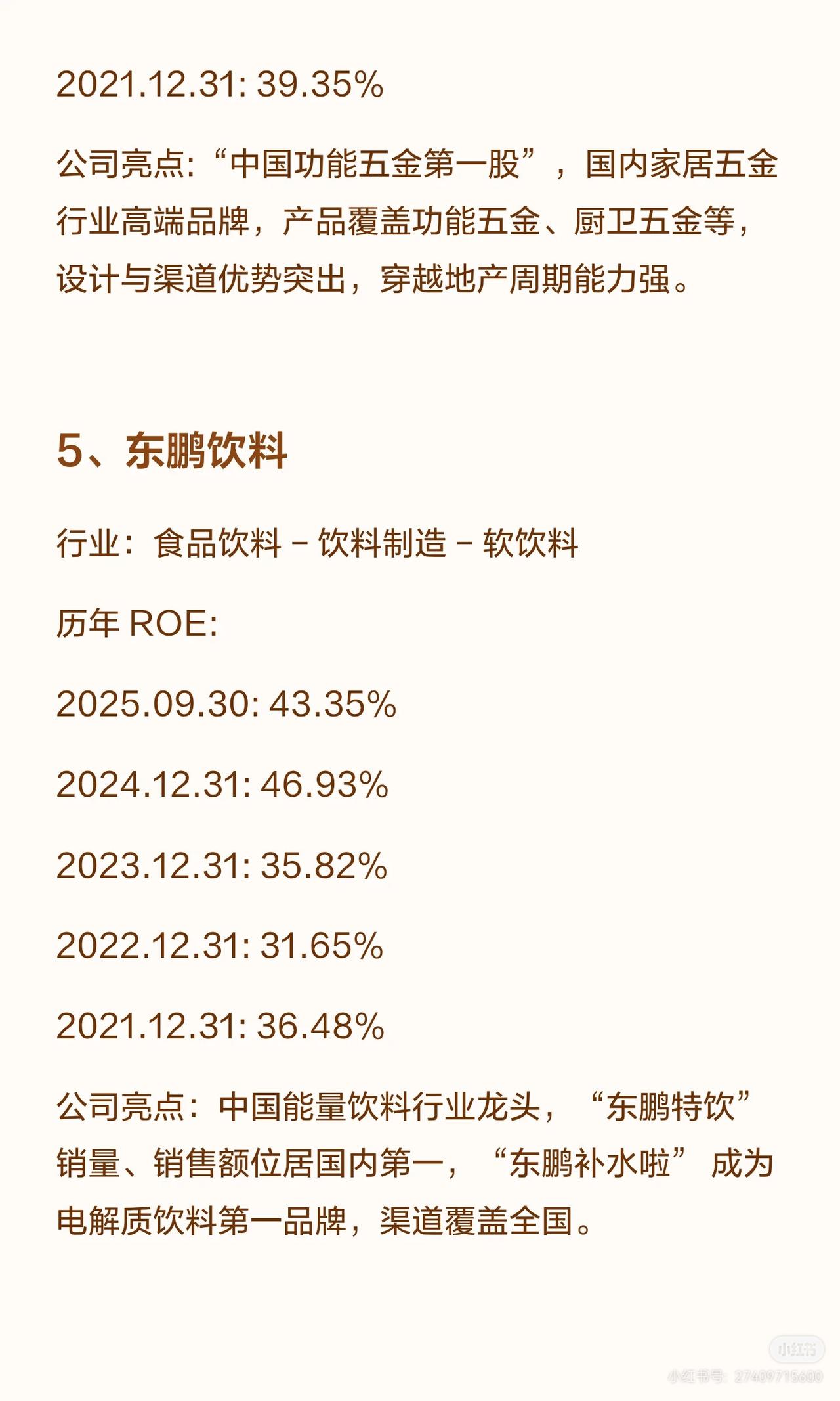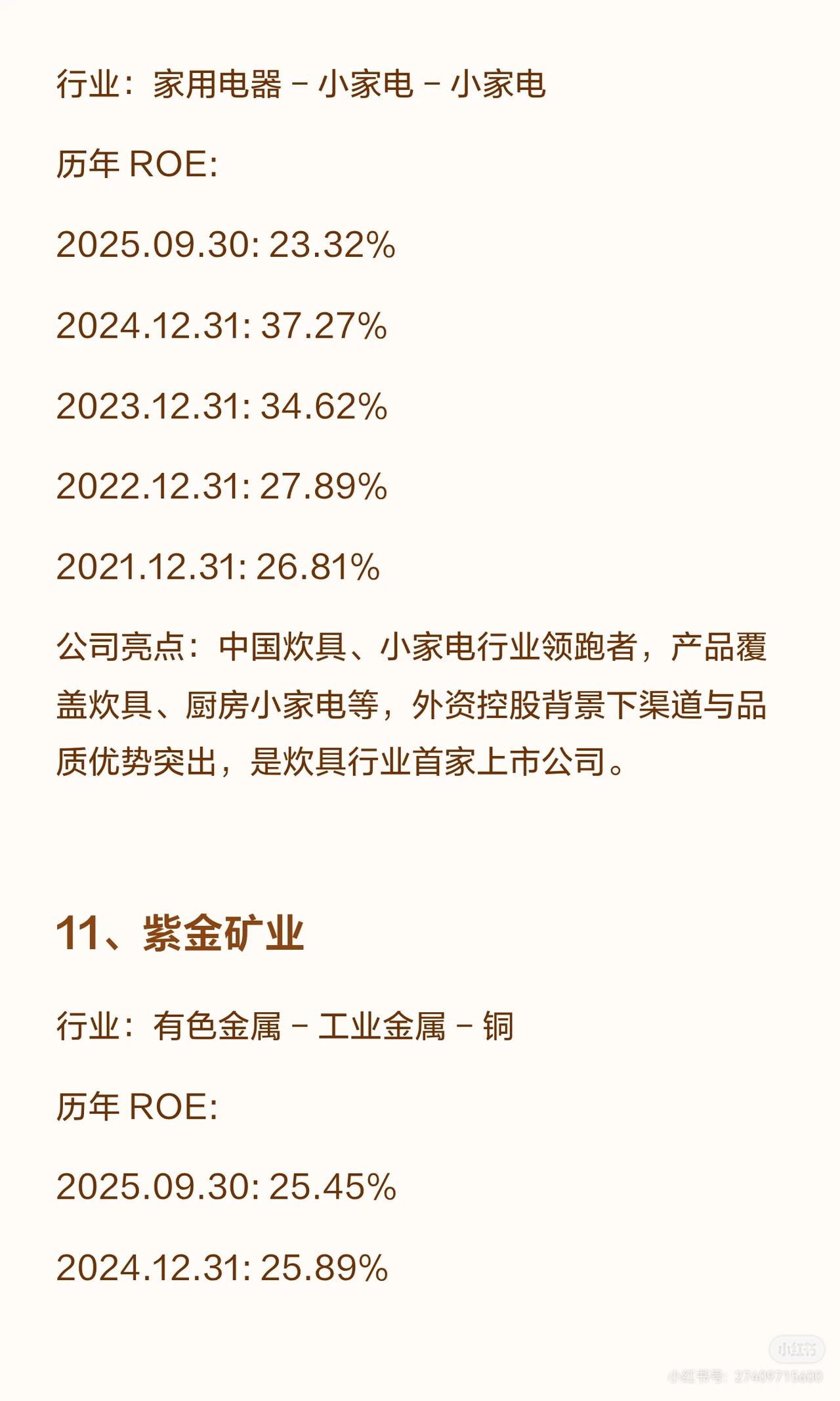 A股连续5年ROE(净资产收益率)超20%的公司共12家,涵盖食品饮料、轻工制造、电力设备、通信、家电、有色金属、医药生物等行业,各公司亮点如下: 1. 重庆啤酒:啤酒行业,嘉士伯在华核心平台,高端化领先(8元以上产品占比近50%),西南市占率突出,ROE连续五年超60%(2025.09.30达76.69%)。 2. 汾酒(清香型白酒龙头):青花汾酒带动量价齐升,全国化布局成效显著,营收居白酒三甲,ROE连续五年超39%(2025.09.30为31.82%,略降但保持高位)。 3. 悍高集团:家居五金高端品牌,设计与渠道优势突出,穿越地产周期能力强,ROE连续四年超23%(2025.09.30为23.01%)。 4. 东鹏饮料:能量饮料龙头(东鹏特饮销量/销售额国内第一,补水啦成电解质饮料第一品牌),渠道覆盖全国,ROE连续五年超31%(2025.09.30为43.35%)。 5. 泸州老窖:浓香鼻祖(1619口百年窖池,国窖1573筑壁垒),白酒行业首家国家级智能制造标杆,ROE连续五年超22%(2025.09.30为22.00%)。 6. 贵州茅台:白酒绝对龙头(酱香垄断,品牌全球领先),盈利与现金流突出,股息率稳定,ROE连续五年超24%(2025.09.30为24.64%,近年持续回升)。 7. 德业股份:全球户用储能逆变器龙头(2024年全球收入第一),新兴市场优势显著,ROE连续五年超24%(2025.09.30为24.33%)。 8. 亿联网络:全球SIP话机市占率第一,视频会议终端全球前五,毛利率长期65%+,AI赋能+全球化渠道,ROE连续五年超21%(2025.09.30为21.39%)。 9. 苏泊尔:炊具、小家电领跑者,外资控股下渠道与品质优势突出,ROE连续五年超23%(2025.09.30为23.32%)。 10. 紫金矿业:全球跨国矿业集团(黄金资源亚洲第一、全球第三,铜产量中国及亚洲唯一破百万吨),受益新能源需求,ROE连续五年超21%(2025.09.30为25.45%)。 11. 百洋医药:医药流通领域,ROE连续五年超20%(2025.09.30为20.25%,近年略有波动但保持达标)。 这些公司多为行业龙头,凭借品牌、渠道、技术或资源壁垒实现持续高ROE,覆盖消费、制造、能源、通信等多赛道。