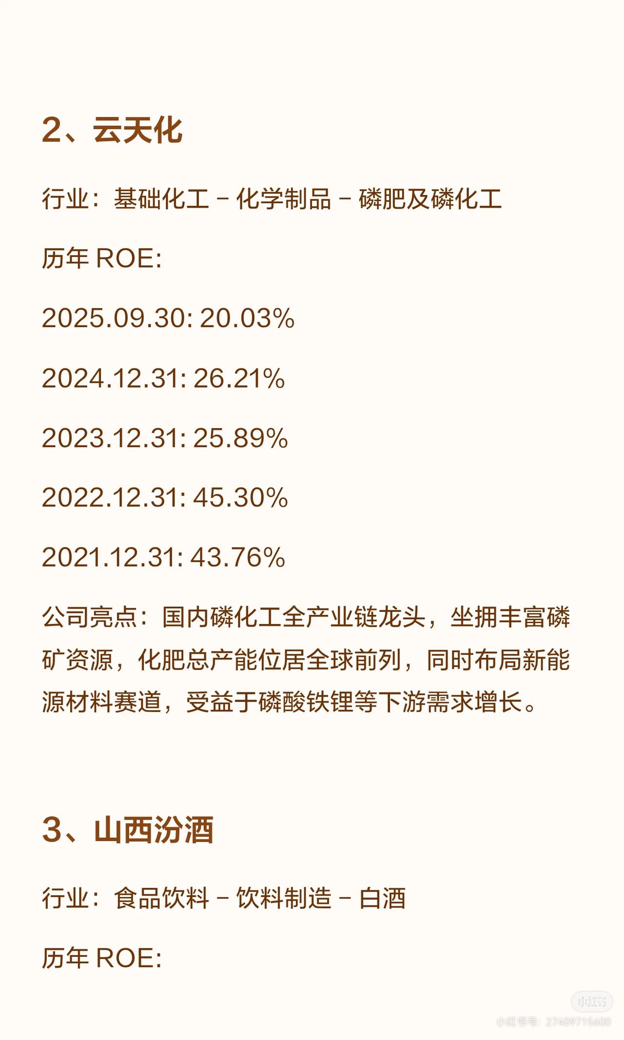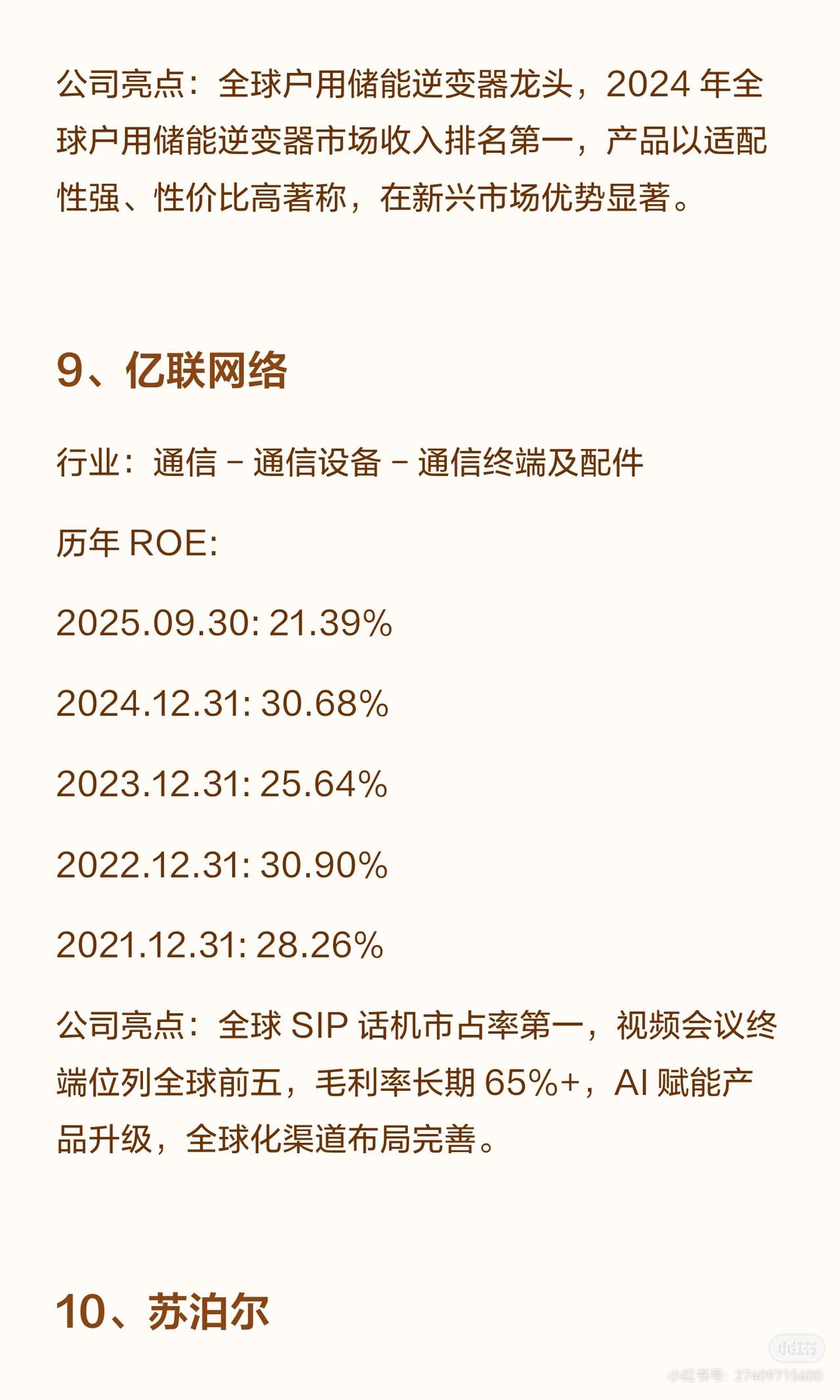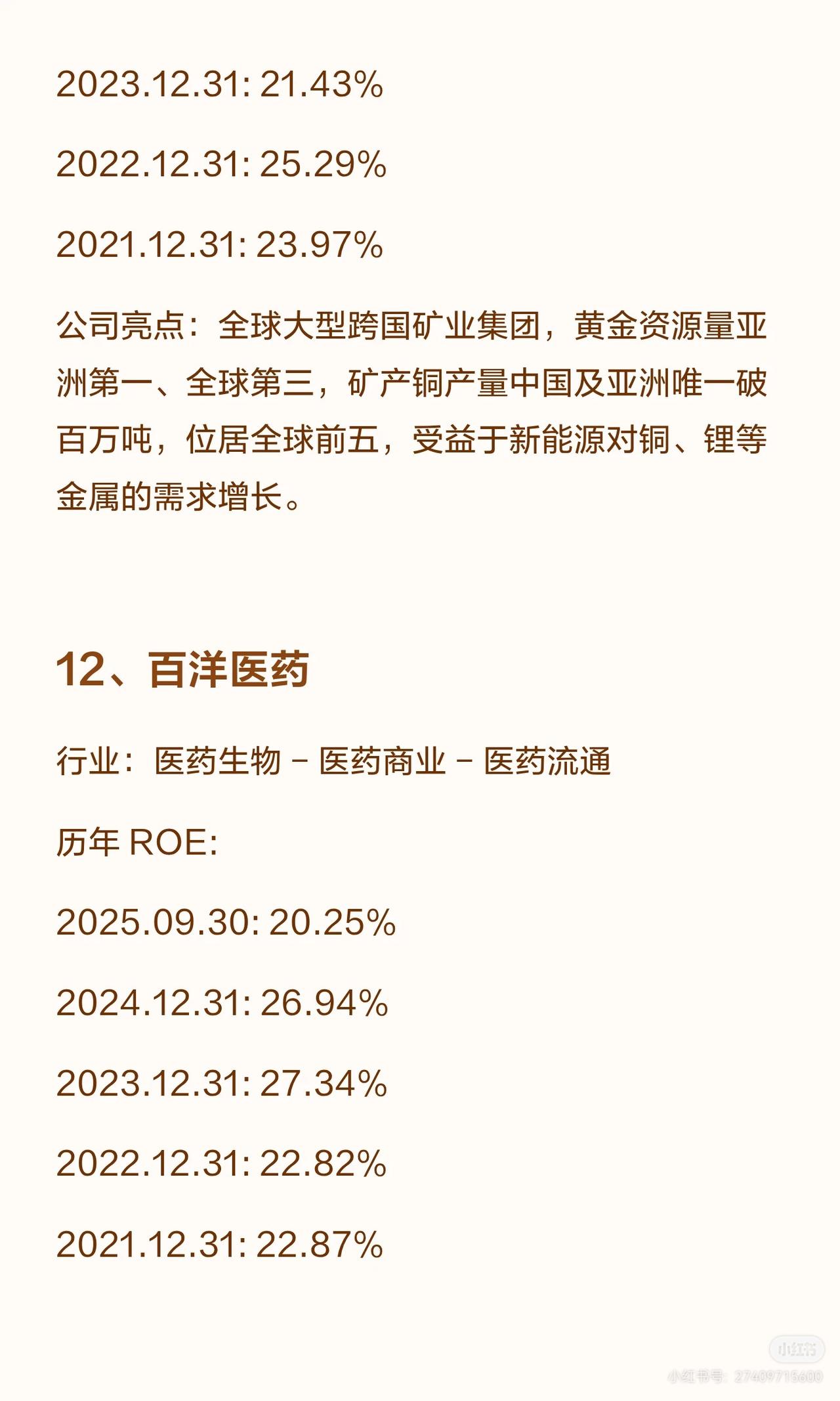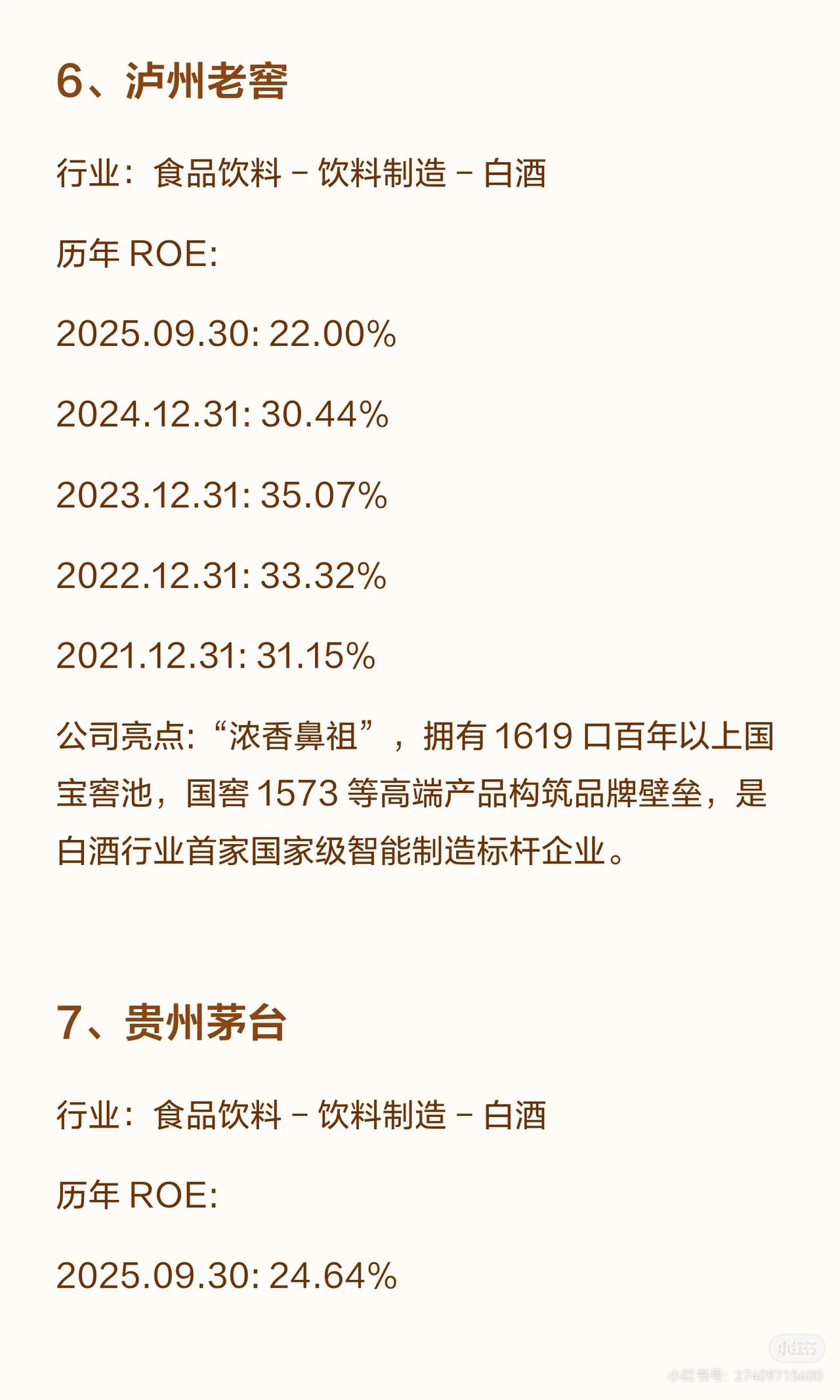 A股连续5年ROE(净资产收益率)超20%的公司共12家,涵盖食品饮料、轻工制造、电力设备、通信、家电、有色金属、医药生物等行业,各公司亮点如下: 1. 重庆啤酒:啤酒行业,嘉士伯在华核心平台,高端化领先(8元以上产品占比近50%),西南市占率突出,ROE连续五年超60%(2025.09.30达76.69%)。 2. 汾酒(清香型白酒龙头):青花汾酒带动量价齐升,全国化布局成效显著,营收居白酒三甲,ROE连续五年超39%(2025.09.30为31.82%,略降但保持高位)。 3. 悍高集团:家居五金高端品牌,设计与渠道优势突出,穿越地产周期能力强,ROE连续四年超23%(2025.09.30为23.01%)。 4. 东鹏饮料:能量饮料龙头(东鹏特饮销量/销售额国内第一,补水啦成电解质饮料第一品牌),渠道覆盖全国,ROE连续五年超31%(2025.09.30为43.35%)。 5. 泸州老窖:浓香鼻祖(1619口百年窖池,国窖1573筑壁垒),白酒行业首家国家级智能制造标杆,ROE连续五年超22%(2025.09.30为22.00%)。 6. 贵州茅台:白酒绝对龙头(酱香垄断,品牌全球领先),盈利与现金流突出,股息率稳定,ROE连续五年超24%(2025.09.30为24.64%,近年持续回升)。 7. 德业股份:全球户用储能逆变器龙头(2024年全球收入第一),新兴市场优势显著,ROE连续五年超24%(2025.09.30为24.33%)。 8. 亿联网络:全球SIP话机市占率第一,视频会议终端全球前五,毛利率长期65%+,AI赋能+全球化渠道,ROE连续五年超21%(2025.09.30为21.39%)。 9. 苏泊尔:炊具、小家电领跑者,外资控股下渠道与品质优势突出,ROE连续五年超23%(2025.09.30为23.32%)。 10. 紫金矿业:全球跨国矿业集团(黄金资源亚洲第一、全球第三,铜产量中国及亚洲唯一破百万吨),受益新能源需求,ROE连续五年超21%(2025.09.30为25.45%)。 11. 百洋医药:医药流通领域,ROE连续五年超20%(2025.09.30为20.25%,近年略有波动但保持达标)。 这些公司多为行业龙头,凭借品牌、渠道、技术或资源壁垒实现持续高ROE,覆盖消费、制造、能源、通信等多赛道。