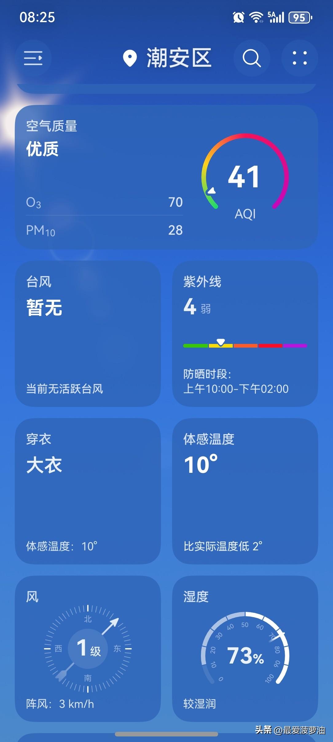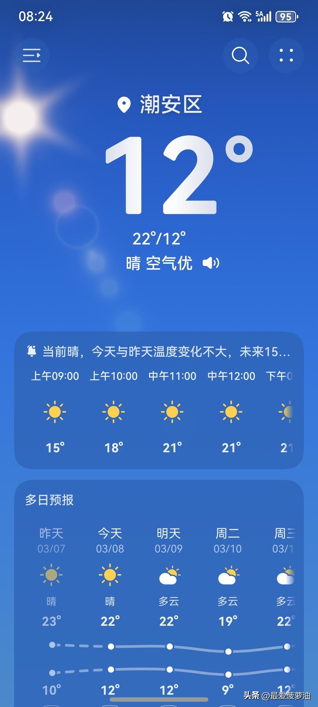 周末遇上女神节,广东人喜提一波晴暖好春光! 今天(8日),广东全省大部晴到多云,昼夜温差较大;9~10日受短波槽和弱冷空气影响,大部分市县日平均气温小幅下降1~3℃,粤西北、珠三角部分市县多云到阴天,有分散零星小雨。 今天(8日),潮州再次喜提一个大好晴天!气温12~22℃,此刻气温12℃,体感温度10℃。 昨天的晴朗天气在今天得到延续,依然是晴暖的好天气,气温比昨天还略有上升,又暖了一点点! 一起来看看今天的天空吧!跟昨天一样,一大早就喜提一波阳光灿烂!看来,今天的天气还是非常棒的! 天气晴朗,暖阳宜人,恰逢周末遇上了女神节,适合赴一场户外之约,让我们开启活力满满的一天吧! 笑一笑,去和大自然拥抱。跳一跳,绚美的舞步星光闪耀。闹一闹,把所有烦恼都甩掉。我的主意妙不妙,你的节日最重要。祝美女们三八妇女节快乐! [送自己一朵花][送自己一朵花][送自己一朵花][送自己一朵花][送自己一朵花][送自己一朵花][送自己一朵花][送自己一朵花]