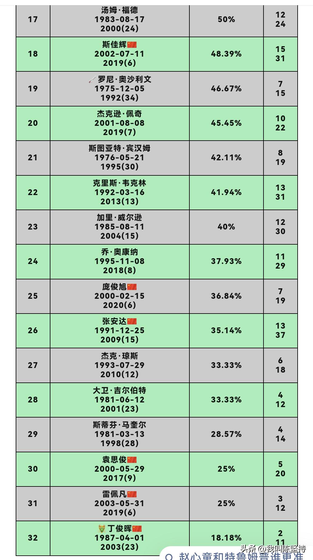 排名前32的高手,相互比赛的胜率,谁最高? 以威尔士公开赛后的排名为准,前32位选手,相互间进行了423场比赛。 胜率第一的是马克塞尔比,66.67%的胜率,打了42场,赢了28场。 胜场最多的是赵心童,打了51场,赢了32场,胜率是62.75%,排名第4。 中国选手,还有周跃龙、吴宜泽和肖国栋胜率达到5成。 副班长是丁俊晖,打了11场,赢了2场,胜率是18.18%。晖哥加油,争取早日拿到世锦赛冠军,拿下大满贯!
