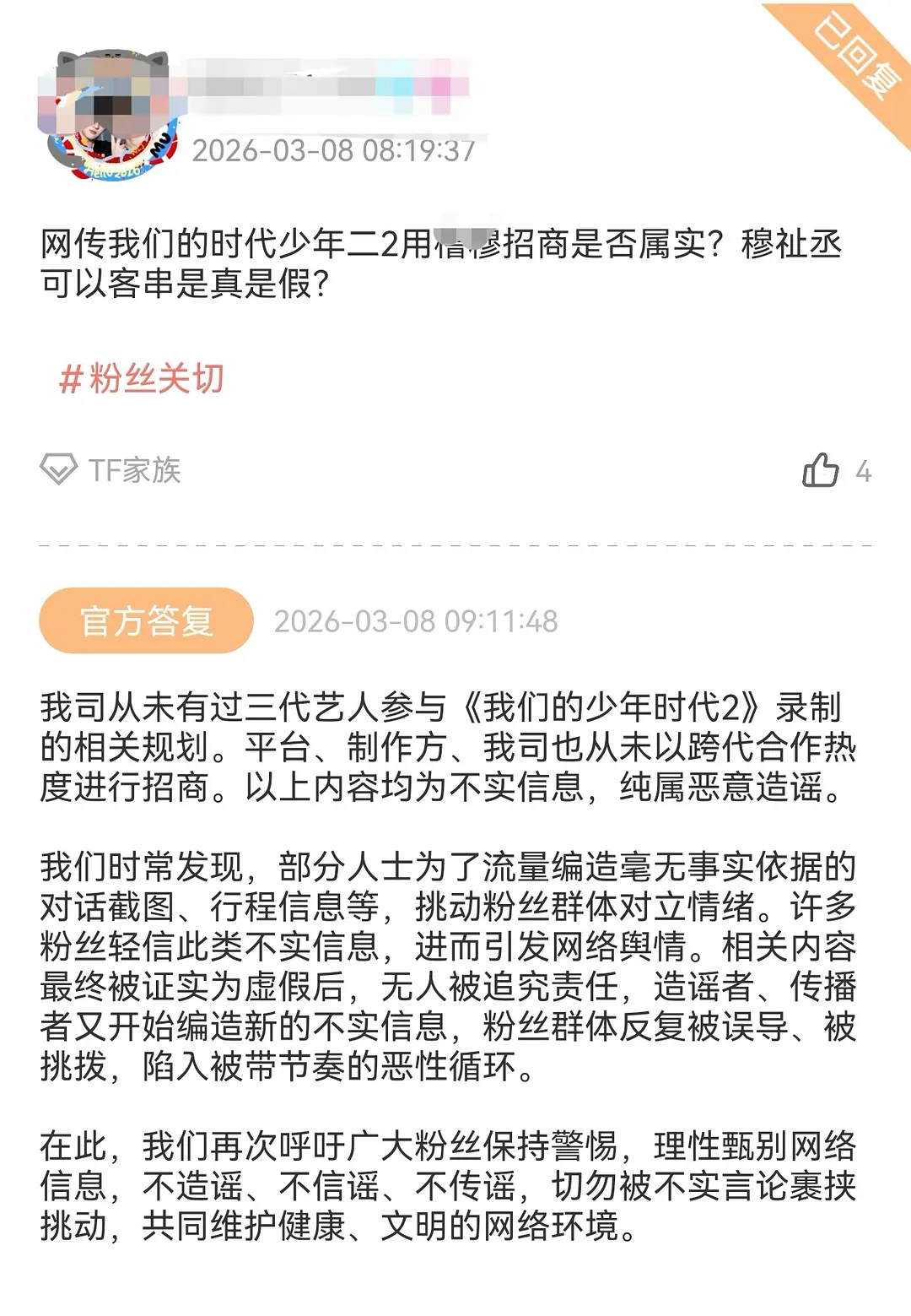 “网传三代艺人参与《我们的少年时代2》录制、用跨代合作热度招商等信息均为不实信息,纯属恶意造谣。公司从未有过相关规划。”