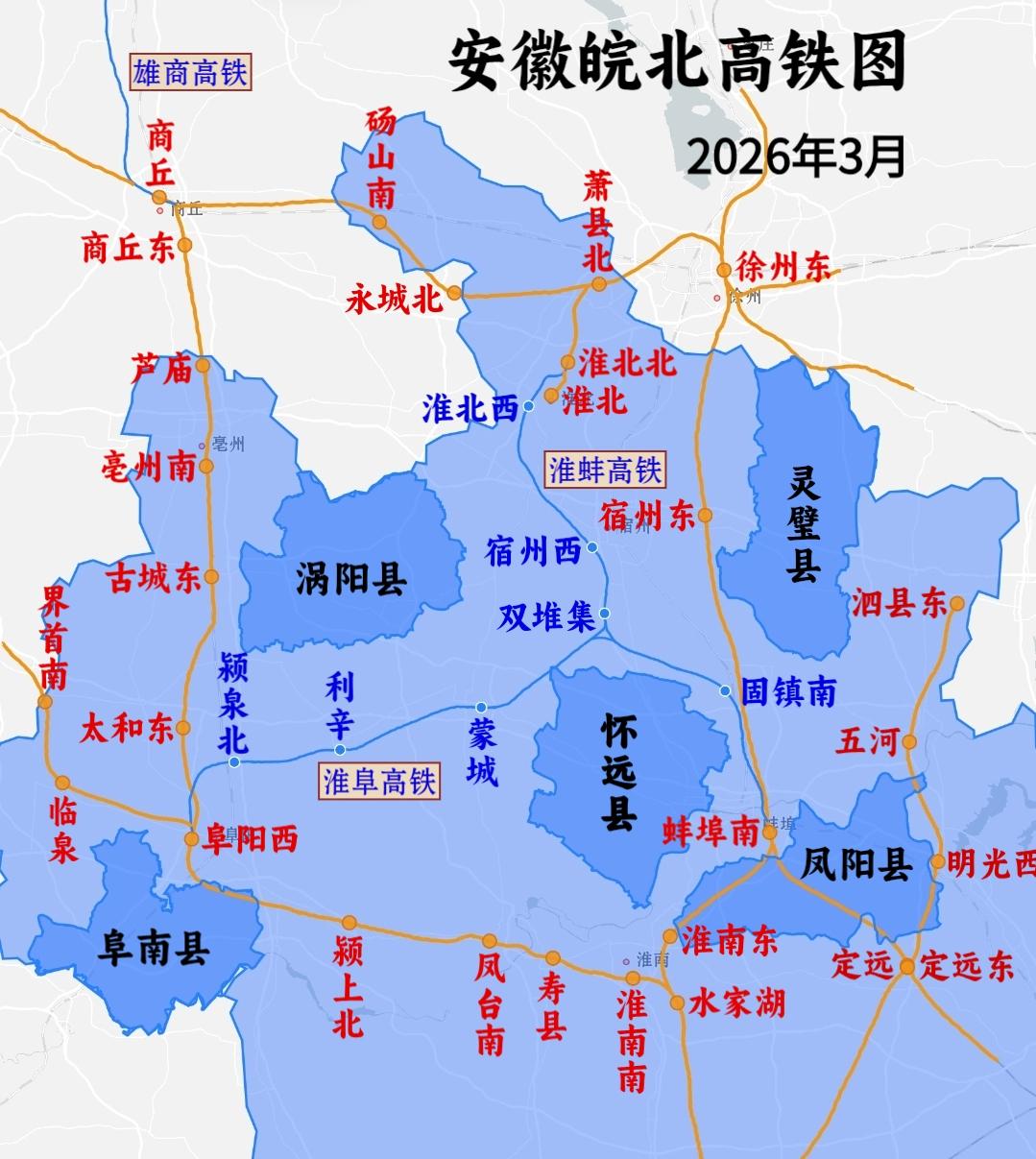 安徽皖北高铁图 2026年淮阜高铁、淮蚌高铁将开通运营 届时皖北高铁网也将形成 打破皖北之间无高铁互通的局面