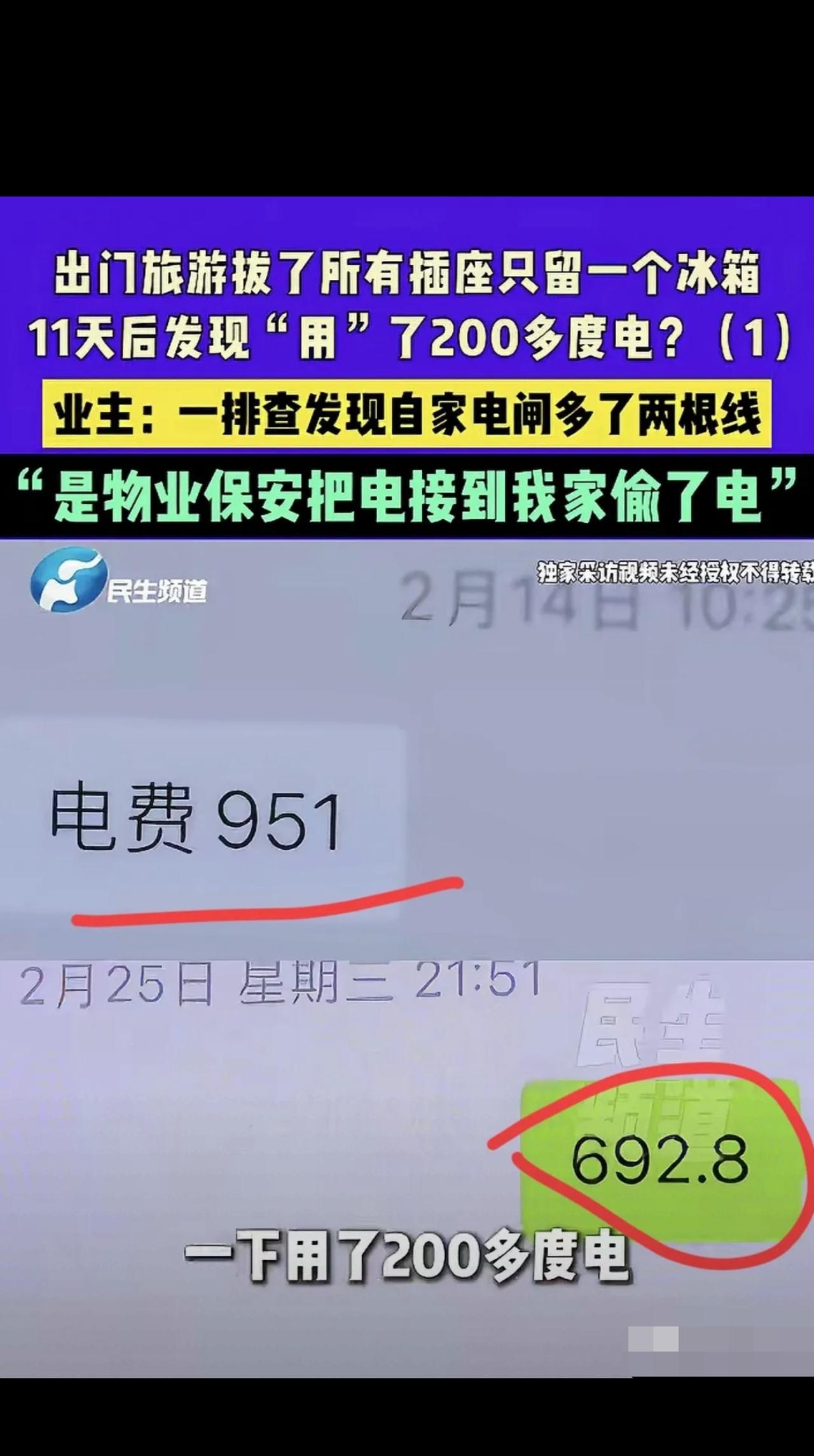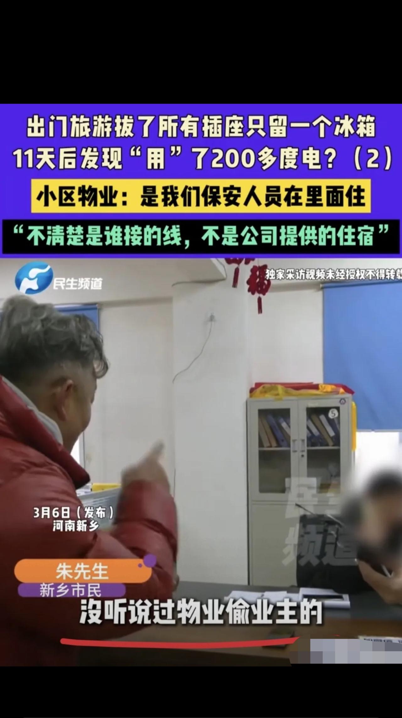 河南新乡,男子和妻子大年二十七去旅游,把家里所有插座拔掉,只留一冰箱,11天后回家发现,竟用了200多度电,找电工一排查,发现家里电闸多了2根电线,男子气的报警,发现是物业保安把电接到他家里偷电,男子找物业要说法,物业说:保安看闲置屋房门开着,见有电就住进去了,但不知道是谁接的电。双方协商结果令人无语。 朱先生和妻子大年二十七出门旅游, 临走前特意把家里所有插座全拔了,只留一台冰箱通电, 还专门去物业充了500块电费,电表清清楚楚显示951度。 夫妻俩开开心心玩了11天回家, 一对电表直接傻眼: 只剩692.8度! 凭空少了200多度电! 一台冰箱,就算24小时转, 10天也就几十度电, 200度?纯纯被人偷了! 找物业电工一查,真相直接震碎三观: 他家电闸被人偷偷多接了两根电线! 顺着线一查,居然连到小区一套空置房里。 一开门,屋里热得像澡堂子, 没人住,暖气片、电锅全开着, 两台大功率取暖器24小时不停转! 而住在这里的,不是别人, 正是小区的两名保安! 偷偷霸占空置房三个月, 私接业主家电线,白嫖电费过日子! 朱先生当场气到报警, 找物业要说法,结果物业的操作更下头: ❶ 经理躲去郑州,不见人 ❷ 甩锅:保安个人行为,和物业无关 ❸ 装傻:不知道谁接的电,连保安电话都没有 ❹ 嘴硬:全世界的事都是巧合,不巧合没故事 网友看完直接炸锅: “监守自盗!第一次见保安偷业主电的!” “电表箱常年敞开,物业一月巡查一次走形式?” “住三个月说不知情?把业主当傻子耍!” 真的越看越气! 保安偷电已经违法《电力法》, 补缴电费+5倍罚款跑不了,金额够大直接刑拘! 物业更别想甩锅! 电表箱不锁、员工违规住空房三个月, 全程失职、全程敷衍,必须连带赔偿! 朱先生说:我要的不是钱,是态度! 物业从头到尾推卸责任,真的寒了所有业主的心。 好好的家,出去旅个游, 被自家小区保安偷电占便宜, 换谁能忍? 你们遇到过这么离谱的物业吗? 评论区聊聊!👇