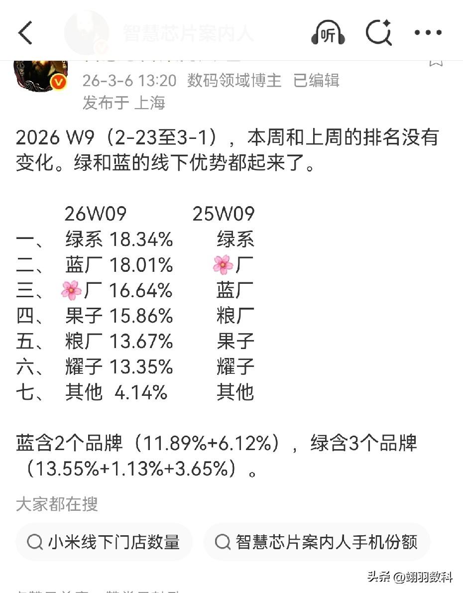 华为的市场占有率有所下滑,这样的结果着实有些出人意料,毕竟在2025年年底,华为推出了Mate 80系列以及Nova 15系列等重磅产品,其中Mate 80系列至今仍处于抢购热潮中。 从市场情况来看,2026年其市场占有率理应有所提升,然而实际结果却是出现了一定幅度的下降,不过下降幅度极小。 实际上,主要原因在于蓝厂和绿厂拥有两到三个子品牌,像IQOO和真我都是颇具性价比的品牌。 华为自回归市场以来,并未推出真正意义上的子品牌,华为或许也意识到,国内手机市场竞争过于激烈。 推出子品牌,短期内很可能成为众矢之的,这也是华为一直未推出子品牌的原因,想必之后也不会推出了。