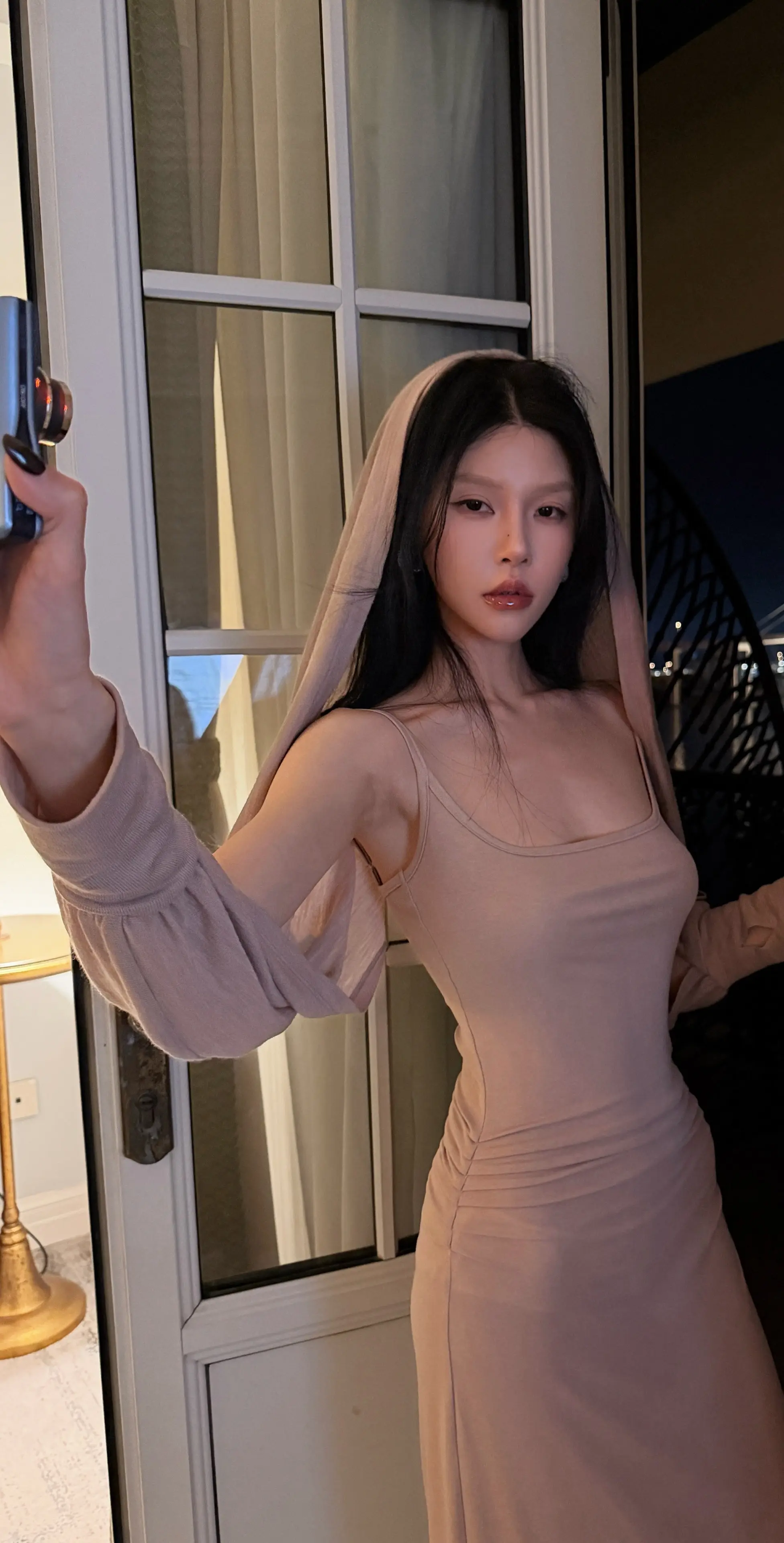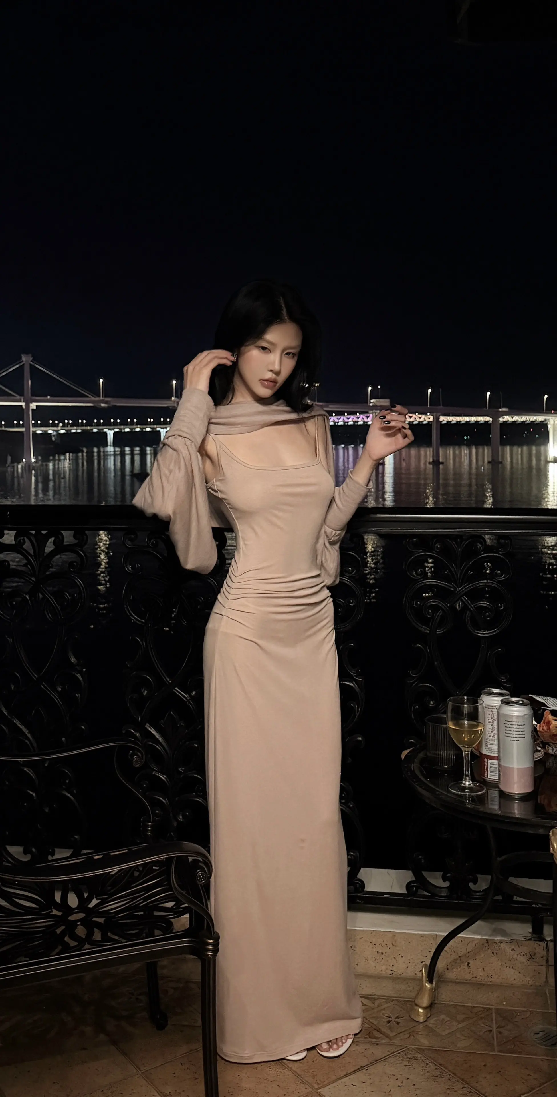 竖条纹旗袍的开叉恰到好处,衬得腿型修长,线条舒展而柔和;肤色均匀且细腻,姿态优雅