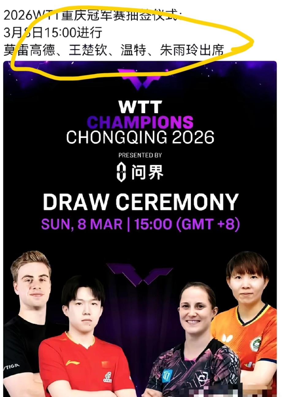 莎莎今天不抽签了!哪来那么多阴谋论,莎莎不抽签就不抽呗,也许她有其他重要的活动!3月8日,重庆冠军赛抽签仪式,由楚钦,朱雨玲,小莫和温特进行,原来公布说有卫冕冠军莎莎,临时换成了小朱!比赛这么频繁,莎莎不抽签也是好事,虽然,我喜欢看莎莎和楚钦一起参加活动,但是热度太高了,总有莫名其妙的人,搞乌七八糟的事情!这样也好,各自参加活动! 今日三八国际劳动妇女节, 祝莎莎和所有女性朋友们 做飞鸟 做大树 做自己想做的事 成为最好的自己[比心] 记录我的2026 乒乓球