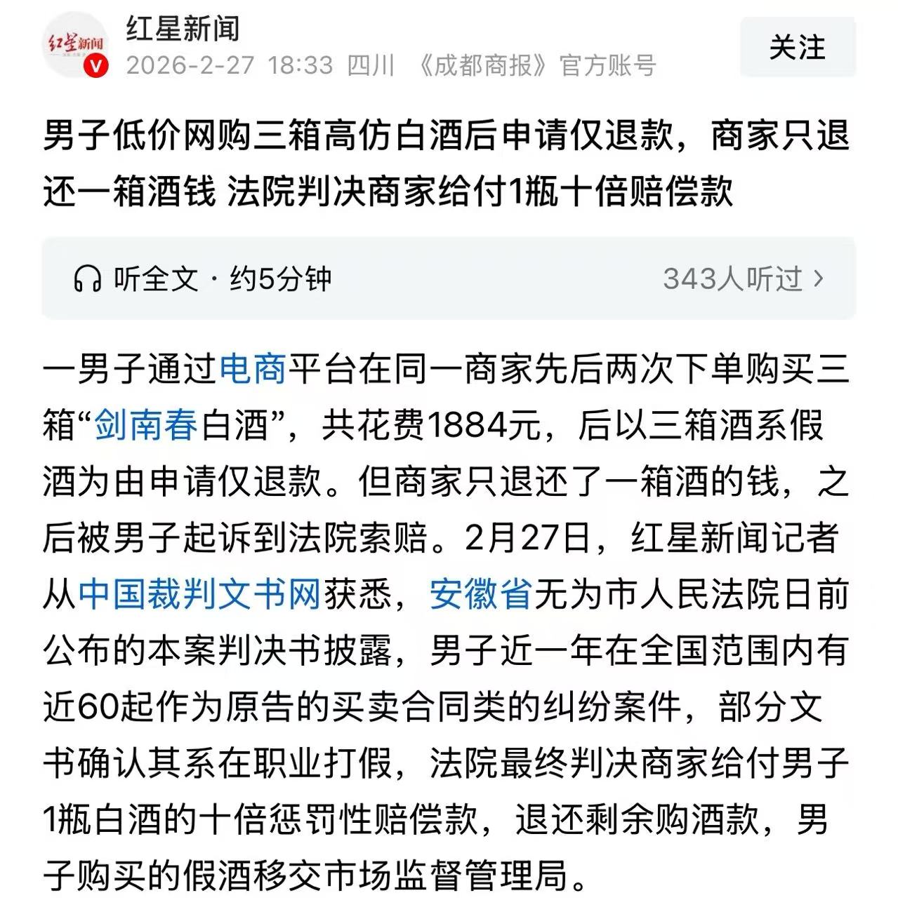 安徽,男子在网上发现商家售卖假的剑南春白酒,分两次买了3箱,打算让商家赔偿吐血!可是他把商家告上法庭索赔13816元时,法院的判决却让他傻眼!法院:男子是“职业打假人”,近一年打了近60起官司!明知是假的,还执意购买,不是正常的消费者!
