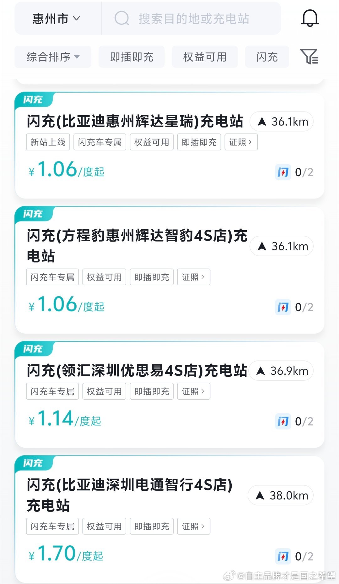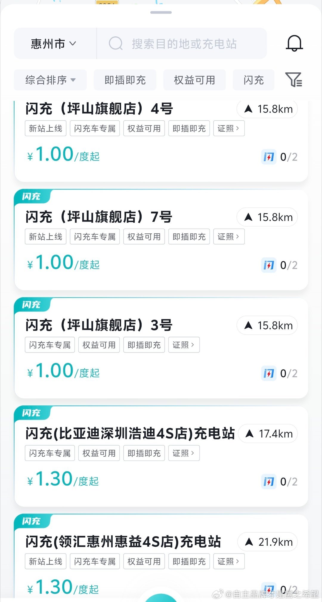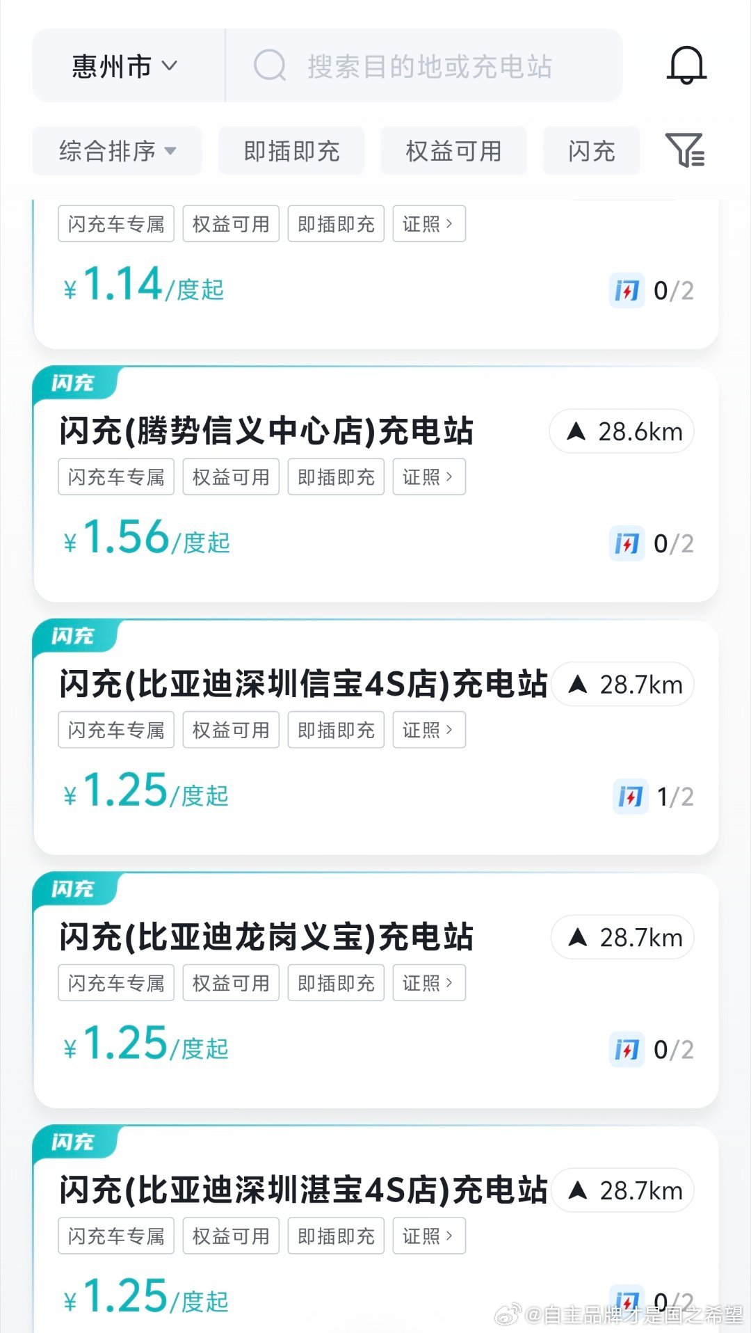 2 说闪充的价格整体是1块5不便宜,这违背了基本的事实,他甚至不敢展示app 截图,我替大家展示了,一线城市深圳以及隔壁惠州价格,有1块5的,个别甚至1块7,1块8。但总体是多少?大家看截图,心里自然有数。节奏就是这么带的。至于什么动机 懂得都懂。