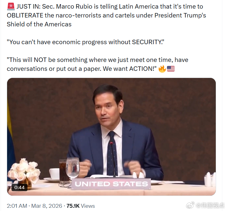 美国务卿马可·鲁比奥告诉拉丁美洲,现在是时候在特朗普总统的“美洲保护伞”下彻底消灭毒品恐布分子和贩毒集团。
