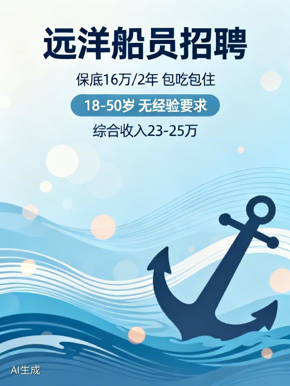 最近看到一公司招聘200名远洋船员,2年保底16万还包吃包住,而且不需要技能和文化,这条件听起来很诱人。像浙江金辉海洋科技有限公司就有类似招聘,面向全国招远洋渔业船员普工,18 - 50岁,无经验、技术、学历要求,身体健康就行。在船上主要负责捕捞、鱼种分类等工作,按保底加产量提成算工资,多劳多得。还有大连远洋公司也在招工,两年保底16万,有提成,综合收入能到23 - 25万。不过远洋工作也有苦处,要能吃苦,耐得住海上的寂寞。但对没技能又想多赚钱的人来说,是个机会。