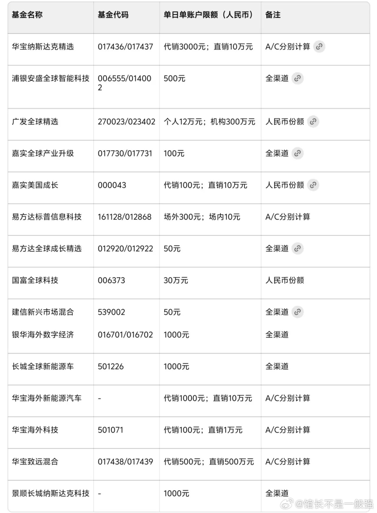 华宝纳斯达克精选浦银安盛全球智能科技广发全球精选嘉实全球产业升级嘉实美国成长易方达标普信息科技易方达全球成长精选国富全球科技建信新兴市场混合汇添富全球移动互联华夏全球科技先锋银华海外数字经济长城全球新能源车华宝海外新能源汽车华宝海外科技华宝致远混合景顺长城纳斯达克科技最新购买限额如下