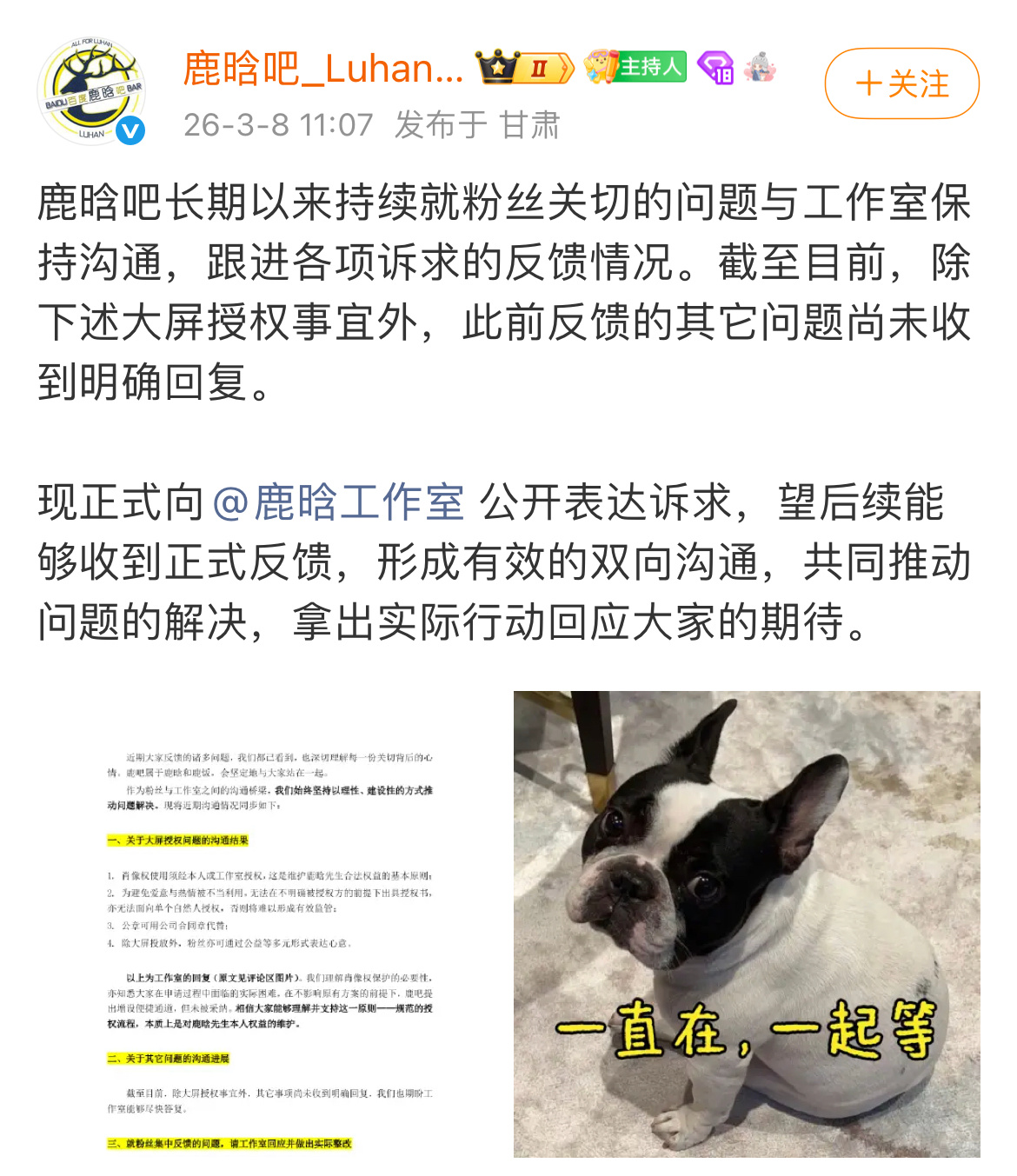 鹿晗大吧发文诉求鹿晗大吧发文诉求工作室,希望得到有效沟通,拿出实际行动。