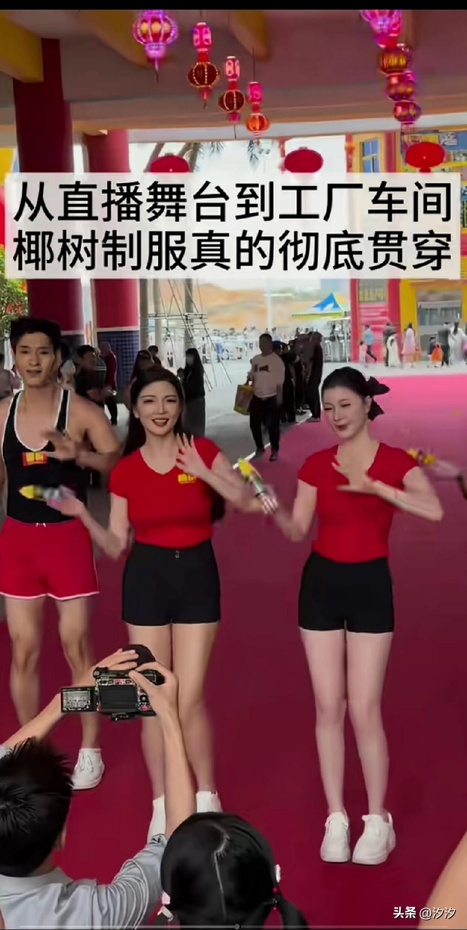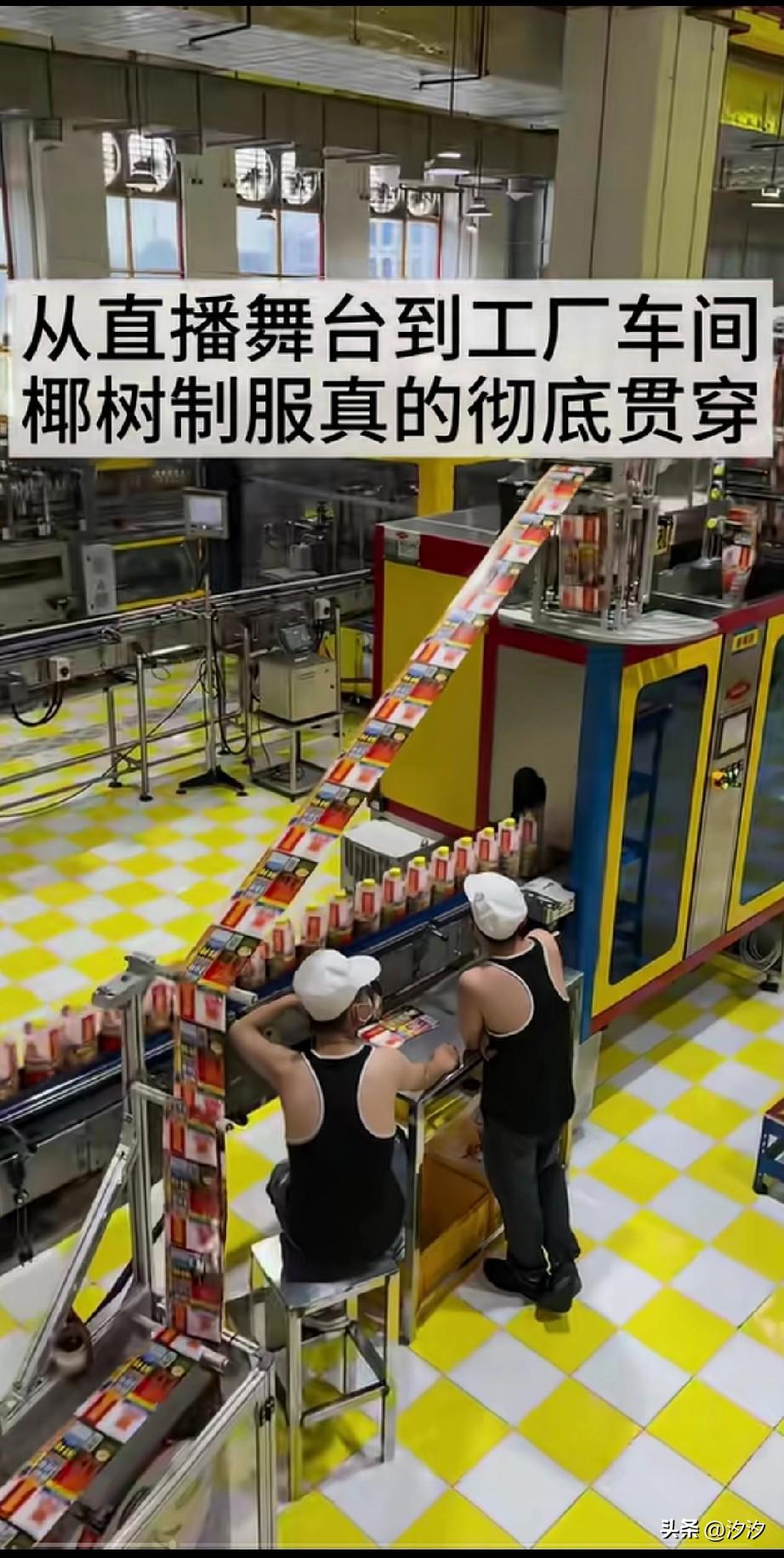 椰树这个企业真的很神奇, 每年都会因为广告而出圈, 不是40万的罚款交不起, 而是40万上热搜真的很划算, 比掏了上百万广告费还管用, 健身帅哥穿着背心儿和短裤, 再配上美女的红背心儿,黑色短裤, 动感音乐一响起, 看这跳舞爽不爽? 谁看谁上头? 就这样就把广告打了。 关键是主播舞台上穿着就算了, 他们还让自己的工厂员工也穿这样的服装,还真是把椰树制服贯彻到底, 你想想整个工厂的员工, 穿的都这么的性感, 属实有点儿搞笑了, 人家主播是身材好, 普通人穿个这感觉就是买家秀, 互相见面估计都得憋出内伤, 在这样的流水线工作, 是不是也很好玩? 椰树海报 椰树营销鬼才 甜椰树广告 椰树牌椰树牌 椰树公司