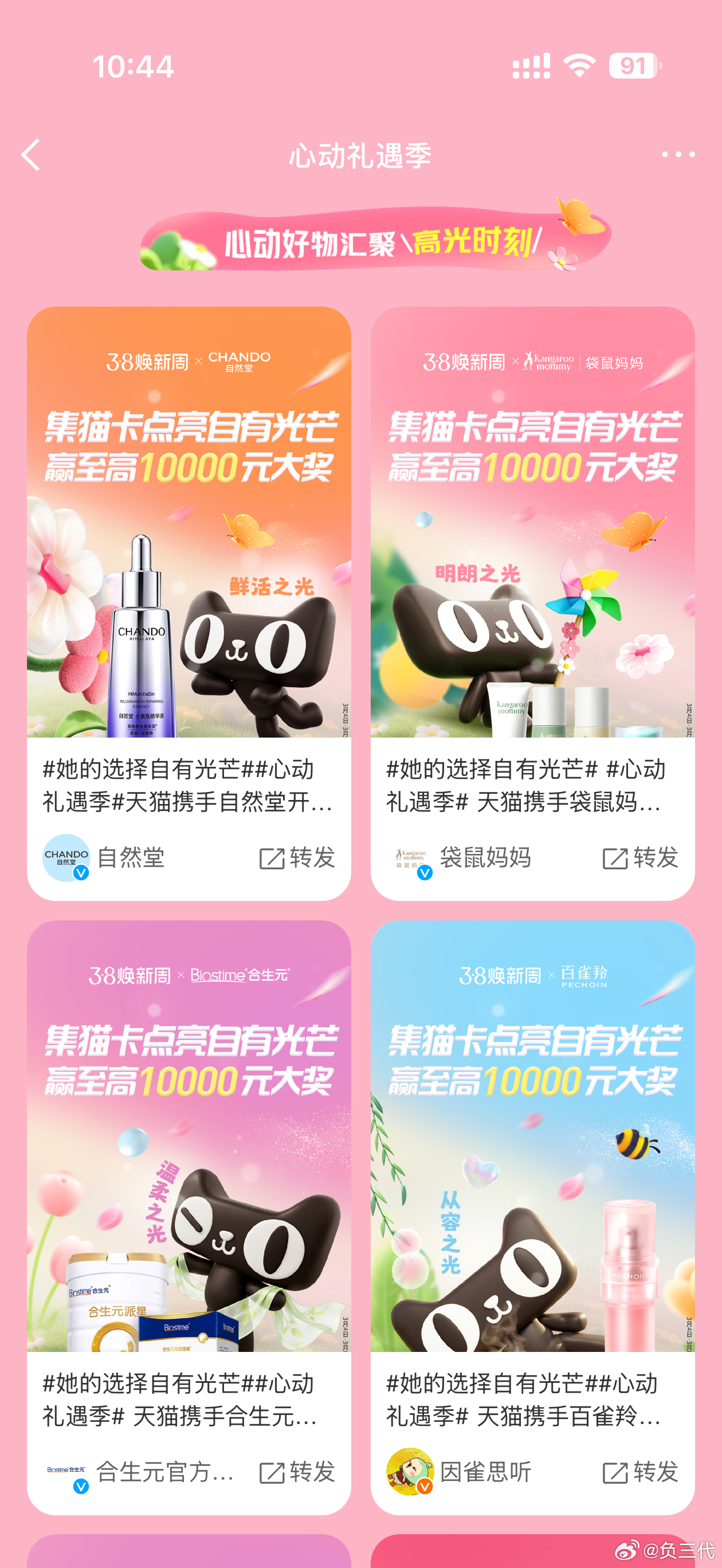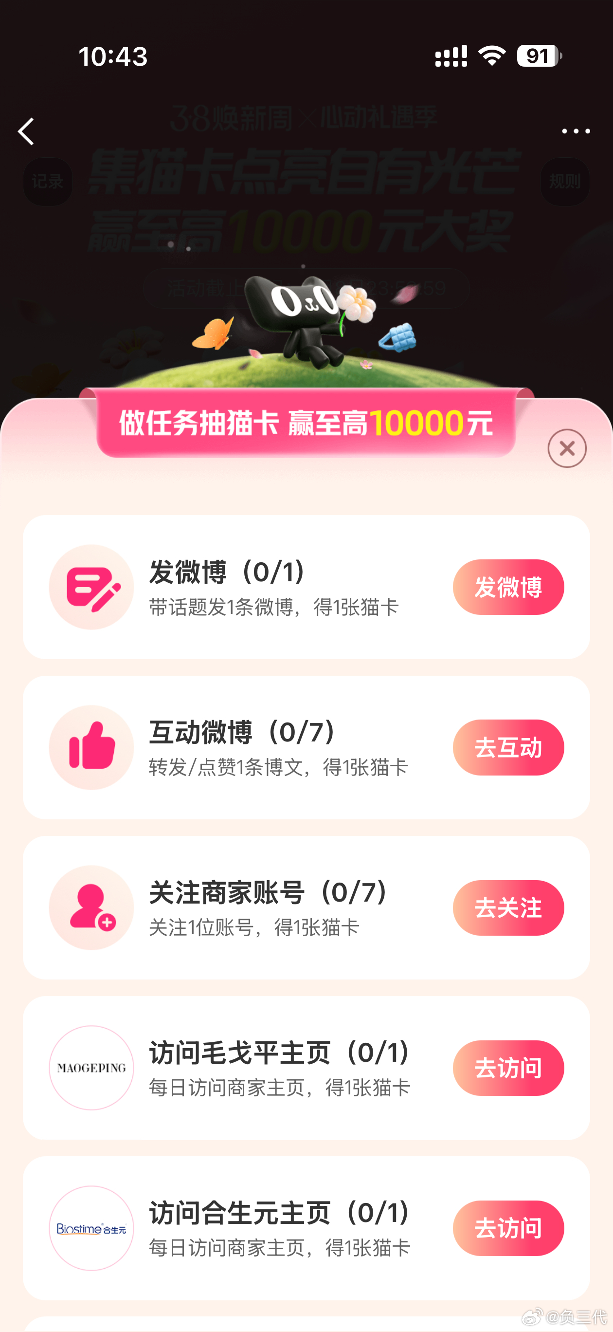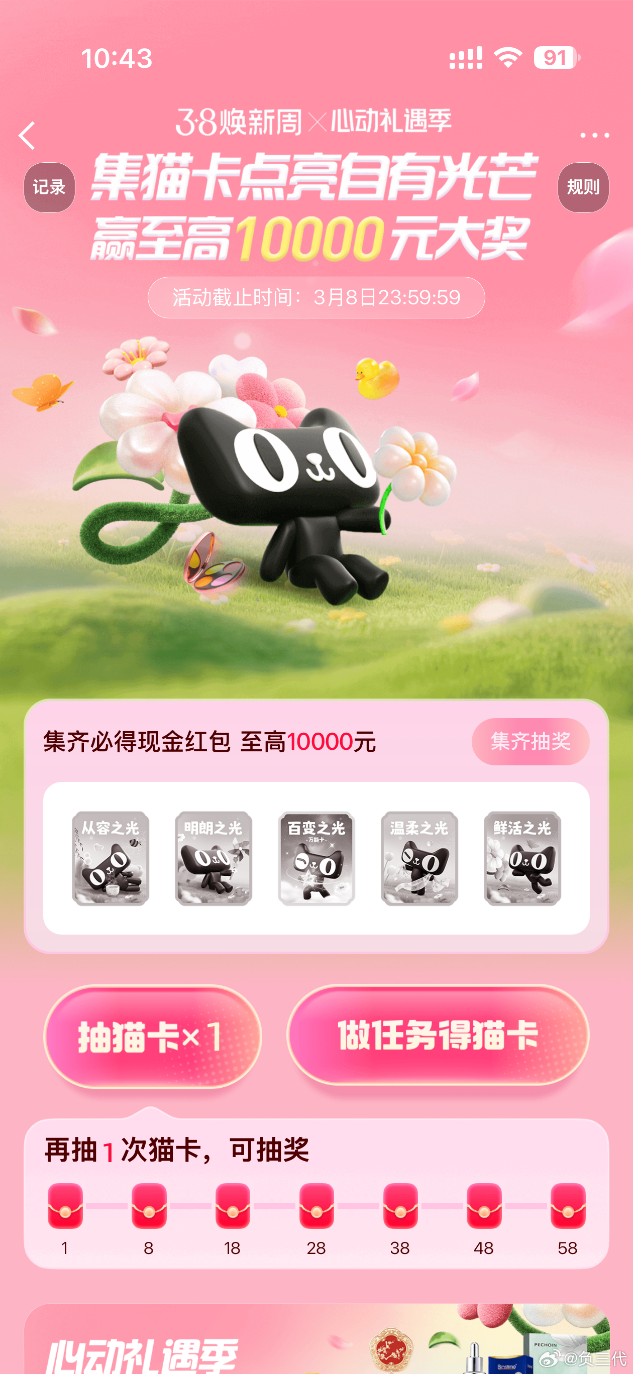 全微博开抢百变之光妇女节快乐朋友们!今天微博和天猫还合作了集卡活动,从下午1点到8点全天8轮整点开奖。集齐从容之光、明朗之光、温柔之光、鲜活之光必得红包。获得猫卡的方式也很简单,进入活动页面就能先抽一卡,发微博,访问品牌主页都能获得。整点抽锦鲤有机会获得2026元,20:00最大红包1万元,还有16位明星会轮番现身发红包。动动你的小手指,也许你就中奖了呢?网页链接