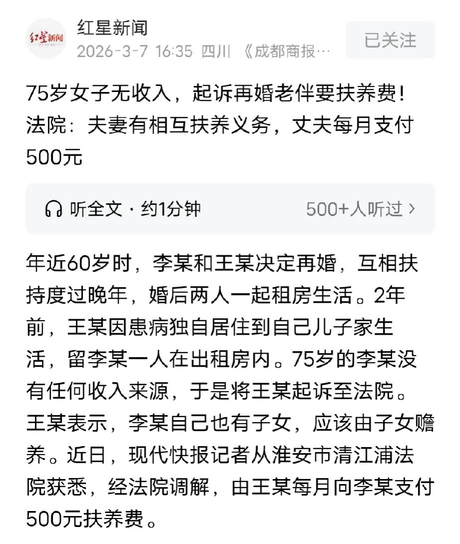 江苏淮安,60岁女子嫁给有高退休金的同龄大爷,两人领证后到外租房同居,不料,13年后大爷生病难自理,无奈的大爷独自搬回儿子家生活,大爷离开了,留下女子无收入没有生活来源,女子多次跟大爷要生活费被拒后,把他告上法庭。法院判决让人意外。 2010年年近60岁的王大爷经人介绍认识单身的李大妈,李大妈跟他年龄相仿,有共同话题。 因为两人都是单身,相处中渐渐有感情,不久后,王大爷和李大妈决定领证结婚,晚年相伴到老。 在他们结婚前李大妈和王大爷原本是跟各自的儿女住,但由于结婚后老人的生活习惯和年轻人不一样,渐渐有了小矛盾。 王大爷无奈,就带着李大妈到外面租房生活,两人在一起后,每天一起做饭菜,一起出门散步,小日子倒也过得平静而安稳。 本以为,两位老人能相伴到老,相互扶持,幸福到晚年。 不料,随着年龄越来越大,王大爷的身体开始出现各种各样的毛病。 2023年的一天,75岁的王大爷感觉身体不舒服,在吃了几天药没有好转后,他决定到医院检查,最终查出,他身体的各项指标都出现了异常。 大爷生病后,原本平静的生活彻底被打乱,有时隔几天他就得跑医院,有时身体实在不舒服,生活上都需要人打理。 李大妈年龄也渐渐老了,打理自己都困难,照顾起王大爷来,实在是力不从心。 无奈的王大爷思考了一段时间,决定搬回儿子家,可李大妈毕竟不是王大爷孩子的亲妈,而且那么多年都没住一起,突然搬过去也不合适。 最终,王大爷独自搬回儿子家,留李大妈一个人在租房生活。 李大妈本来就没退休金,这么多年没上班了,平时也很少跟自己的孩子有往来,王大爷离开后,李大妈没了生活来源,一下子陷入了窘境,吃饭都成问题。 李大妈多次跟王大爷沟通,要求支付生活费,可王大爷却不乐意了,他的退休金也不算高,生病需要用钱,住到儿子家要给生活费,所剩无几,他也无能为力。 李大妈在多次被拒绝后,把王大爷告上法庭,要求他支付生活费。 法院经过审理认为,李大妈跟王大爷是领证的合法夫妻,夫妻有相互扶持的义务,王大爷拥有高额退休金,而李大妈没有退休金,不过她有儿女,最终经过调解,王大爷每月支付李大妈500元生活费。 此事一经曝光,网友们的议论瞬间炸开了锅。 有网友心疼李大妈:“真心陪伴了13年,最后落得无依无靠,每月500块连基本生活都难,太让人心寒了。” 也有网友站在大爷这边:“大爷自己都重病不能自理,还要治病养身体,实在没多余能力再负担别人。” 还有人感慨:“晚年再婚看似是作伴,可一旦一方病倒,感情和现实立马就露馅,真是既现实又无奈。” 《民法典》第1059条规定,夫妻有相互扶养的义务,需要扶养的一方,在另一方不履行扶养义务时,有要求其给付扶养费的权利。 李大妈和王大爷是合法夫妻,婚姻关系一直存续,李大妈没有退休金无收入来源,生活困难确实需要扶养,王大爷有退休金具备扶养能力。 所以法律规定他必须履行扶养义务,同时李大妈有子女也有赡养义务,法院结合双方实际情况,没有判高额费用。 最终调解让王大爷每月支付500元,既符合法律规定,也贴合两人的实际经济状况。 对此,大家怎么看?