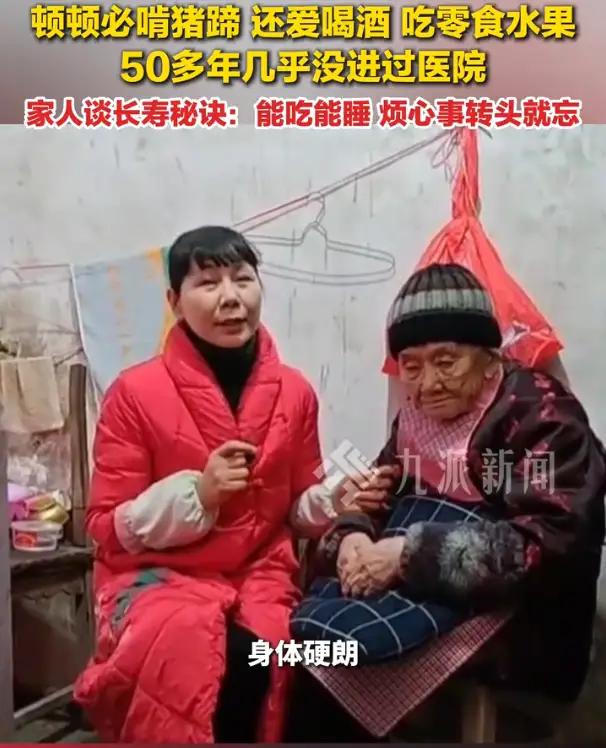 浙江台州,一位102岁阿婆火了,她已经有接近50年没有进过医院,不少人纷纷打听长寿秘诀,家人的回应很简单,能吃+能睡!可即便如此,很多网友也表示根本做不到。 据家人讲述:“能吃,能睡”。看似普通的八个字,藏着阿婆数十年如一日的生活节奏。饮食上,阿婆顿顿要盛满一碗饭,肉食是餐桌常客,尤其钟爱猪蹄,每顿必啃两三块,一天能吃下半斤 。早餐标配肉包、肉馅水饺或馄饨,还会搭配鸡蛋、橘子,偶尔喝上几口自酿果酒,胃口好得让年轻人都羡慕。 睡眠方面,她每天早上9点多自然醒,晚上7点准时上床,中午还会补一两个小时午觉,一天累计睡眠达15小时。睡醒后,她会坐在院子里晒太阳,偶尔还会自己缝补袜子、纳鞋底,手脚依旧灵活。家人坦言,除了能吃能睡,阿婆豁达大度、从不与人红脸的好心态,也是关键。 网友们纷纷感慨“根本做不到”。在快节奏的当下,有人为工作熬夜失眠,有人因焦虑食欲不振,看似简单的吃好睡好,实则是最难坚持的生活智慧,长寿从无标准答案,顺应本心、保持规律,才是最适合自己的养生之道。