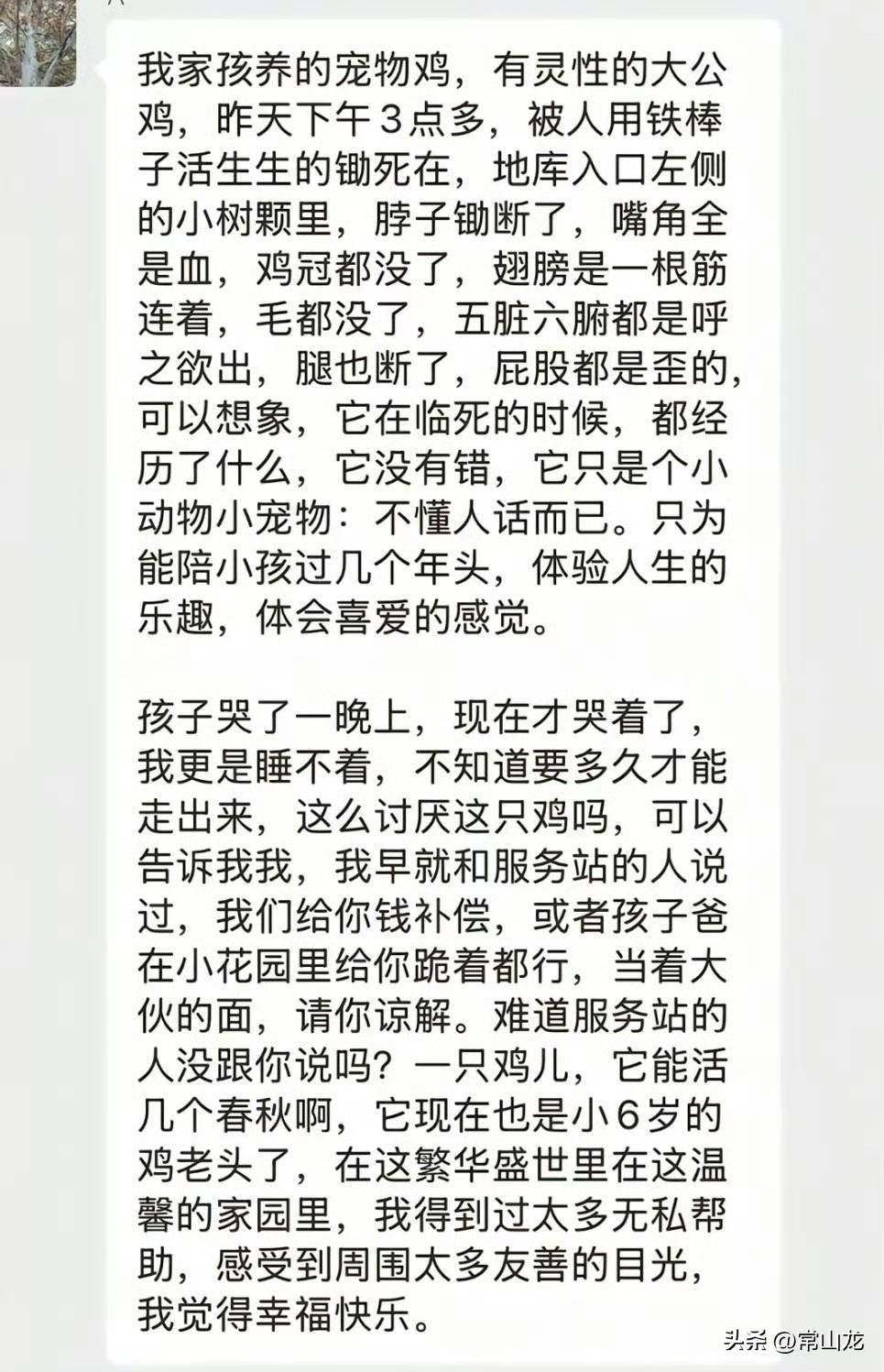 公鸡被打死已经有好几天了,公鸡主人还没有走出悲伤,每天早晚不定,只要一有时间,大妈就拿着扩音喇叭在小区里悲愤地喊:“谁杀死了我的大公鸡,警察在找你。” 这只公鸡大妈饲养了6年,早已视作亲人,平时就是散养,放任它四处溜达,每天早上三四点就打鸣,在电梯里拉屎撒尿,还会攻击宠物和路人。 邻居不堪其扰,向其投诉,但大妈置若罔闻,未采取任何约束和管理措施。 3号那天早上,这只大公鸡被发现在地下车库旁边离奇死亡,死状相当凄惨,脖子被打断了,鸡冠也不见了,内脏裸露,嘴角全是血。 看到公鸡的惨状,大妈一下子崩溃了,就跟失去自己的亲儿子一样,如丧考妣。 现在,大妈已经陷入了魔怔,白天黑夜都拿着扩音喇叭,在小区内游荡喊话,寻找“杀鸡凶手”。 大妈说,如果有人对公鸡不满,她可以给予补偿,或者叫孩子他爸跪着,当着大伙的面请求谅解。 也是醉了,为什么自己不跪,要叫孩子他爸跪? 孩子他爸也太惨了,家庭地位还不如一只公鸡。 小区居民感慨,以前“鸡打鸣时嫌吵,现在人喊冤时更吵,以前是公鸡打鸣,现在换成大妈了。” “干脆我们众筹给公鸡办场白事,送它一只大大的花圈吧。” 物业已经安排保安去劝阻,社区也派工作人员跟大妈沟通,但大妈依然故我,沟通无效。 目前,喇叭声依然在社区内循环回响。 (素材来源:百姓关注)