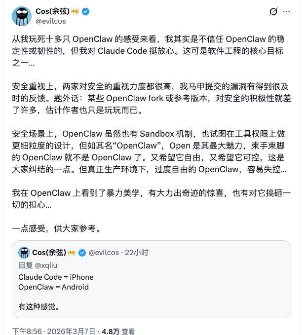传统 Claude Code /CodeX 用户,就很像早期的 iPhone 用户,看着一堆安卓机,头皮发麻,你这些功能我都有,我还比你安全,有点子瞧不上的感觉。