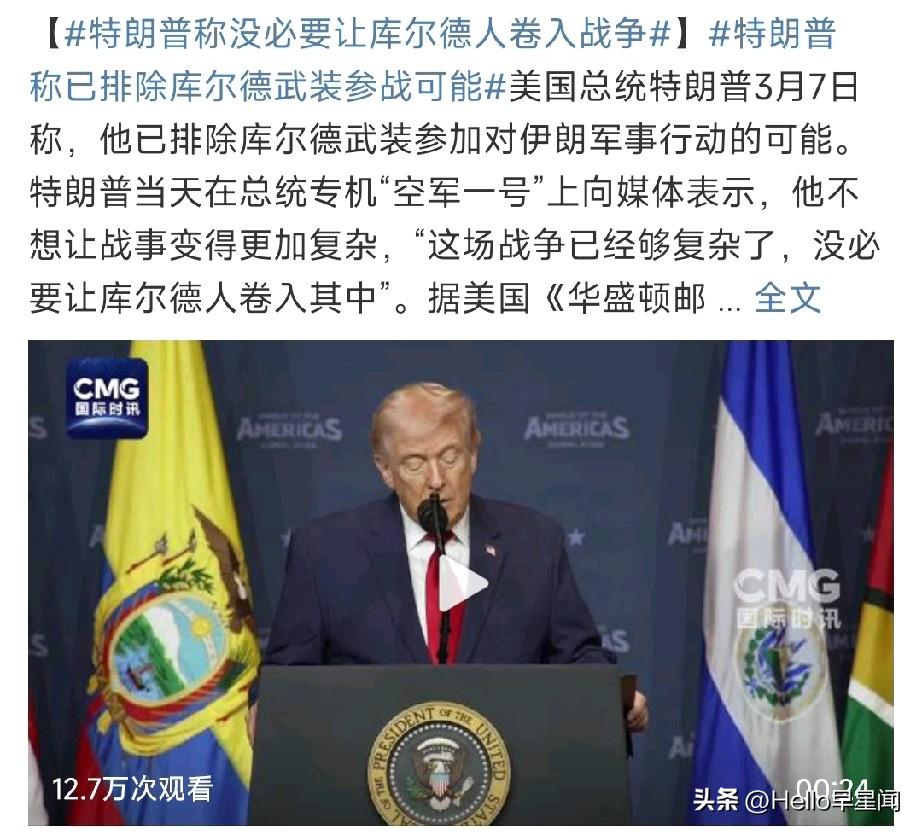 特朗普扛不住了! 3月7日,特朗普说了句软话: 这场战争“已经够复杂了”,没必要再让库尔德武装参战。 这是自开战以来,特朗普首次低调表态,同时说明,特朗普已淡化了派出地面部队从后方夹击伊朗而陷入长期战争泥潭的冒险计划。 在美以仅靠空袭无法颠覆伊朗政权,以及拉里贾尼、伊朗司法部长、伊朗军方日益强硬的表态下,尤其是伊朗一轮比一轮凶猛的攻击下,并且每天8.91亿美元的巨额军费更是特朗普政府的一颗雷…… 现在的特朗普已切实感受到了阵阵寒意: 特朗普扛不住了!