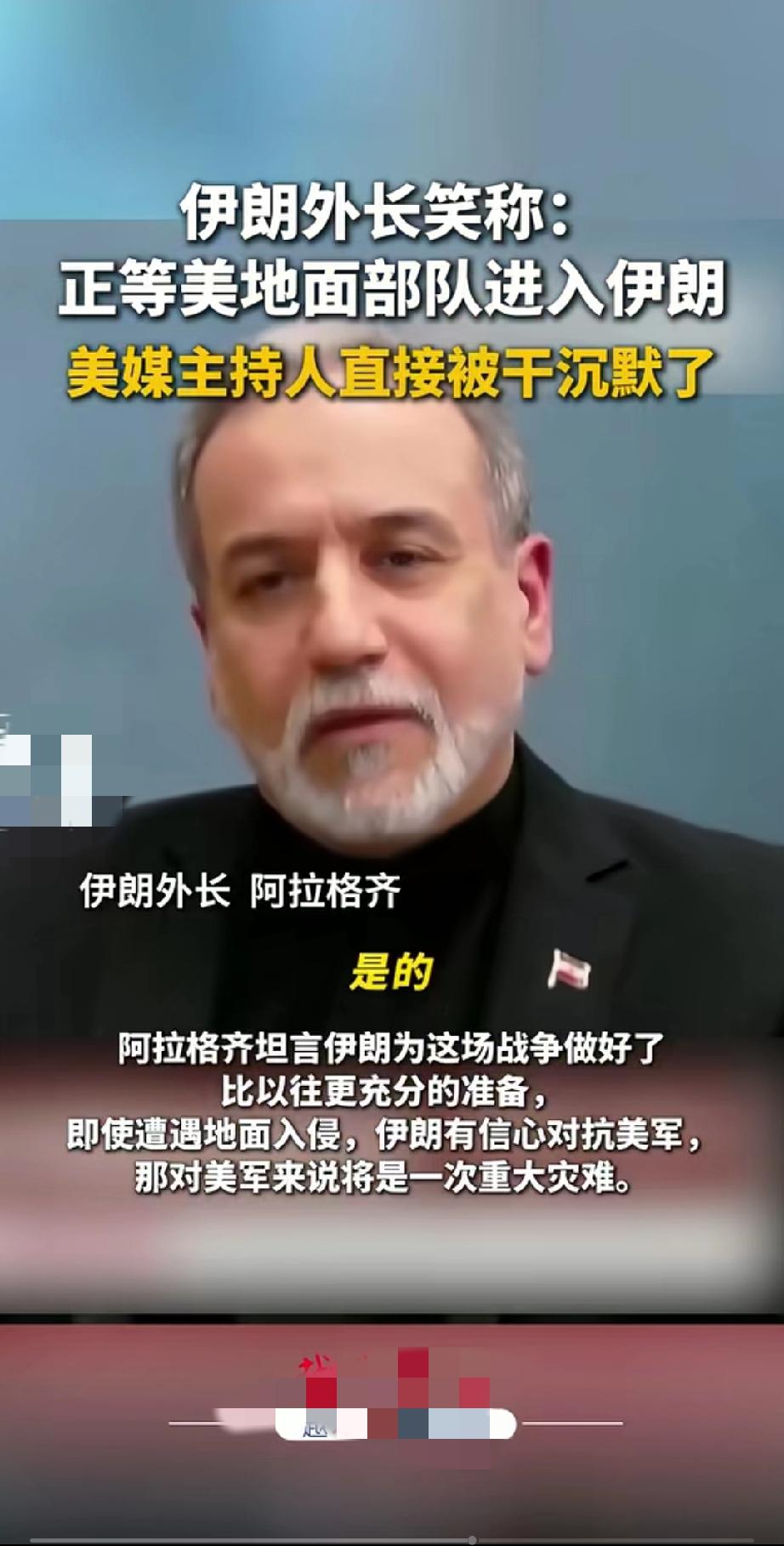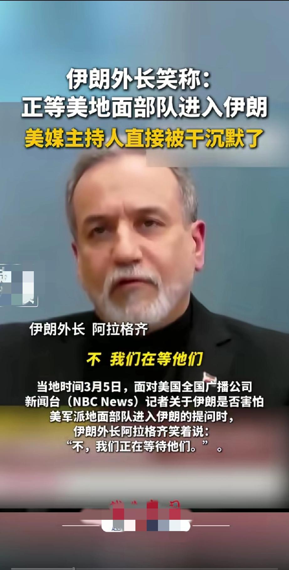 美国当地时间3月5号NBC NEWS记者连线采访伊朗外长,上来就趾高气昂的逼问: “你害怕美国入侵你的国家吗?” 没想到的是,伊朗外长表情冷漠,随后的一句话更是把直播间的美国主持人给干沉默了! 伊朗外长: “不!我们在等他们!” 美国主持人直接懵逼了,沉默了好一会儿百不可置信的问到: “你是说你们在一定美国地面部队的入侵?” 伊朗外长: “是的,因为我们有信心可以对抗他们,这对他们来说将是一场大灾难!” 因为已经多少年没有哪个国家的官员胆敢如此对美国说话了,可我觉的伊朗外长还是不够霸气,他应该好好看看还1965年我们的陈毅元帅在记者会上拍如何着桌子把美国人怼的屁滚尿流的!