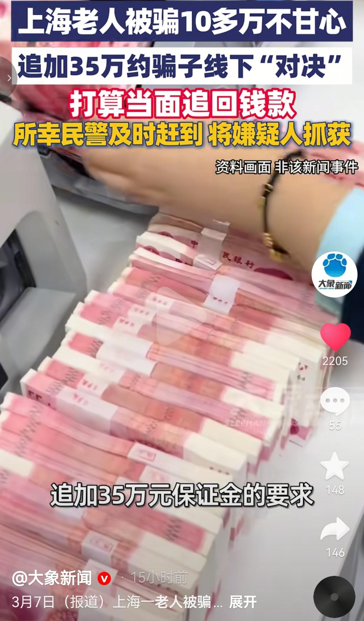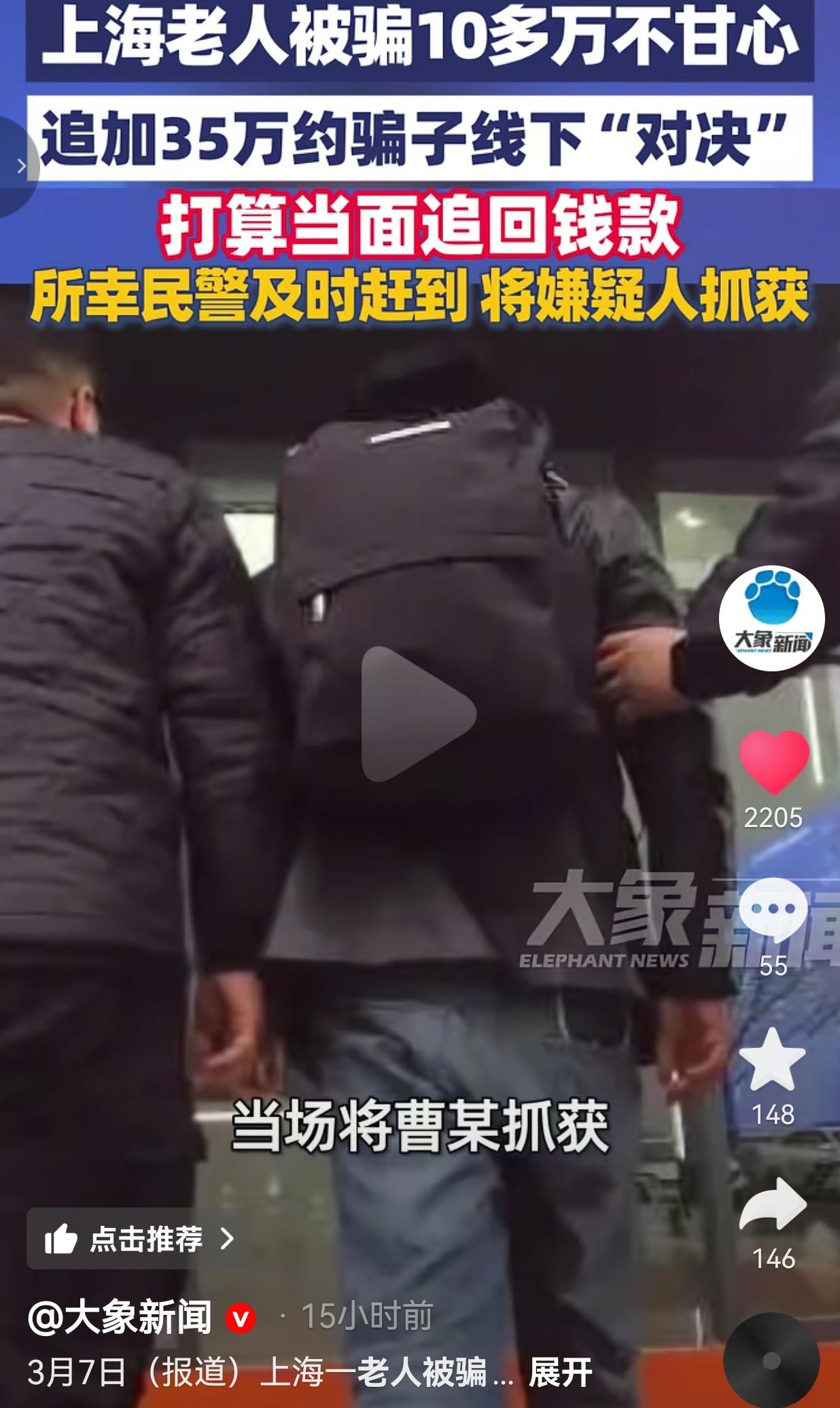 上海阿姨被骗10多万,竟追加35万约骗子线下对决! 上海的瞿阿姨,因为下载非法理财软件被骗了10多万,换做是谁,这养老钱、血汗钱被骗子骗走,心里都得堵得慌。 但瞿阿姨的操作,真的让我又佩服又后怕——她居然没有选择报警,而是琢磨着“将计就计”,假意答应骗子追加35万保证金的要求,主动约对方线下见面,打算当面把被骗的钱要回来! 这波“线下对决”的勇气,说实话,我一开始还觉得阿姨脑子转得快,是个硬茬,可了解完后续,才惊出一身冷汗。 2月13号那天,浦东警方接到反诈预警,说瞿阿姨疑似遭遇诈骗,正准备去赴约。 民警赶紧往她店里赶,结果人已经走了,电话也打不通,联系家属才知道,阿姨带着老伴,正往沪南公路靖海路口赶,满心想着要跟骗子“掰扯掰扯”,把钱要回来。 民警火急火燎赶去约定地点埋伏,等瞿阿姨夫妇到了,来接头的根本不是什么幕后骗子,只是个负责转移涉诈资金的“车手”曹某。 曹某发现阿姨没带35万现金,立马叫车想跑,还好民警及时出现,当场把他抓获。 事后民警跟阿姨科普,诈骗团伙分工精得很,幕后主谋大多躲在境外,根本不会露面,瞿阿姨见的只是最外围的“小喽啰”,别说要钱,就算把这“车手”扣下,也根本碰不到真正骗钱的人,反而自己老两口的人身安全,随时可能出危险。 网友看到后评论说:“阿姨这股子倔劲儿我服!但真替她捏把汗,咱们老年人哪懂骗子的套路啊,还好警察来得及时,不然真要吃大亏!” 也有的网友说:“换我我也急!那可是养老钱啊!不过阿姨这招“引蛇出洞”太险了,还是得听警察的,咱们普通人哪是骗子的对手啊。” 还有的网友说:“我觉得阿姨不是傻,是不甘心!被骗了谁能甘心啊,但硬刚真的不可取,警察叔叔才是咱们的靠山,千万别学阿姨冒险,直接报警最靠谱!” 我看完真的五味杂陈。先说说阿姨的心情,我太能理解了——10多万,对咱们普通人来说,是攒了多少年的辛苦钱?是养老看病的底气,是给儿孙准备的应急钱。 被骗之后那种不甘心、不服气,恨不得立马找骗子算账的念头,换谁都有。这不是傻,是咱们老百姓对自己血汗钱的执念,是不想吃这个亏的倔劲儿。 但冷静下来想,阿姨这步险棋,真的太危险了。咱们想想,骗子是什么人?是专门钻空子、玩套路的职业团伙,他们手里可能有同伙,可能藏着家伙,咱们普通人一对一去见面,哪怕是两个人,面对一群别有用心的人,根本没有还手之力。 万一曹某不是一个人来,万一发现阿姨没带钱恼羞成怒,万一发生冲突,老两口的安全谁来保障?到时候钱没要回来,再把自己搭进去,那才是真的得不偿失。 而且还有个点,很多人被骗后都有顾虑——觉得被骗是丢人的事,不想报警,不想让家人知道,不想让别人知道自己看走眼了。 瞿阿姨也是,她宁愿自己冒险去追钱,也没第一时间找警方求助。可咱们要知道,警察才是最专业的,他们有技术、有手段,能快速冻结账户、追踪资金链,比咱们单打独斗靠谱一万倍。 现在的养老诈骗,真的防不胜防。骗子会打着“高回报理财”的幌子,先让你赚点小钱试水,等你放下警惕,就一步步让你投大钱。会抓住老人想多攒点养老钱的心理,画“稳赚不赔”的大饼。甚至会用“黄昏恋”“认干亲”的套路,先给你点温暖,再骗光你的积蓄。 就像这次的非法理财软件,看似正规,其实后台全是假数据,等你想提现,就各种理由卡着你,直到把你榨干。 我特别想跟家里的长辈说一句:遇到诈骗,千万别抱有侥幸心理,更别自己硬刚。被骗了第一时间报警,保存好聊天记录、转账凭证,这才是最安全、最有效的办法。 咱们的钱是血汗攒的,咱们的命是自己的,别让骗子的阴谋,既骗了钱,又伤了咱们的安全。 对此,你怎么看?欢迎大家评论区讨论留言。