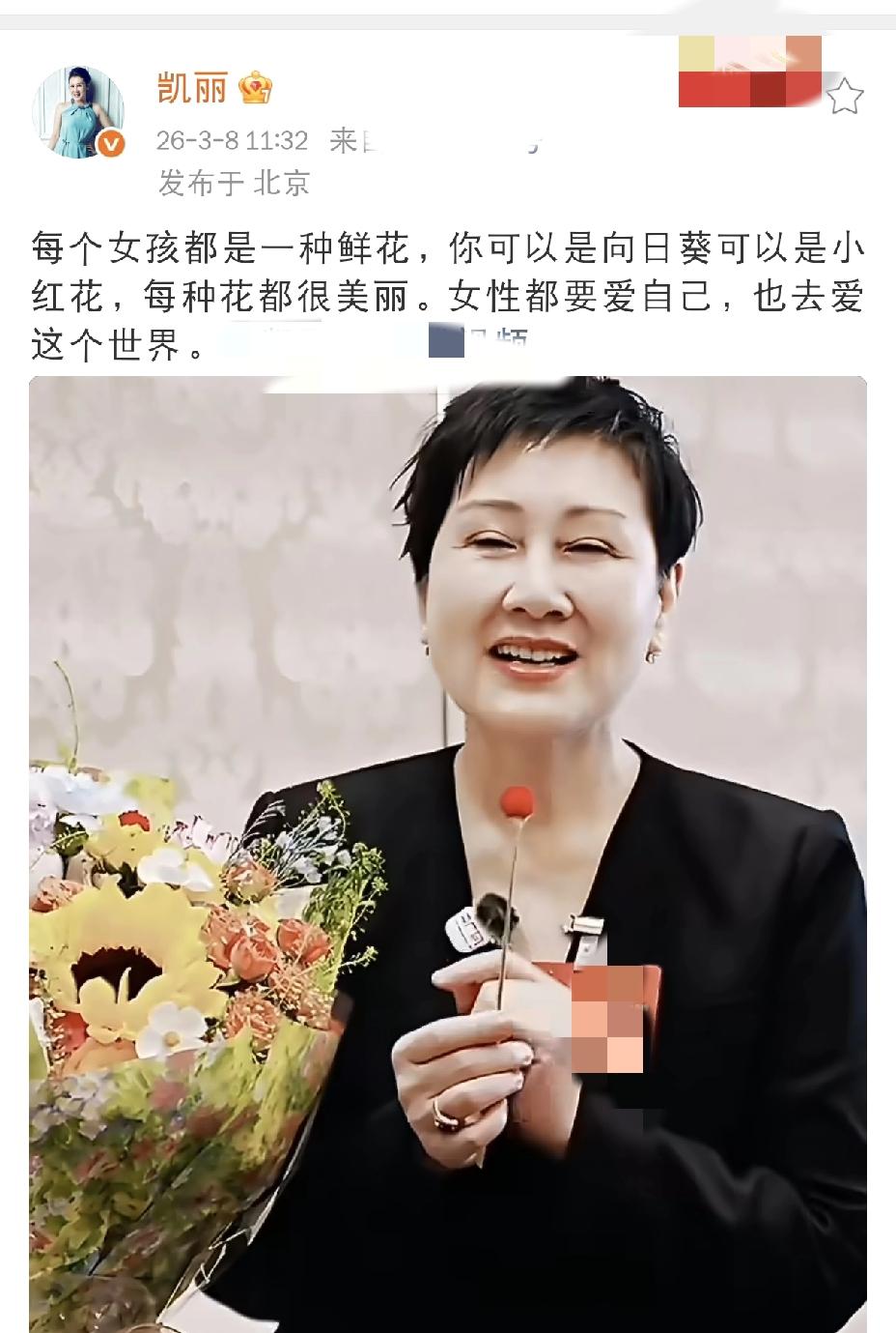 张凯丽说得漂亮! 3月8日上午,妇女节如期而至,娱乐圈的明星们纷纷为女性发声,不过看了那么多祝福,还是觉得张凯丽说得漂亮。 她在视频里温柔地说道:“每个女孩都是一种鲜花,你可以是向日葵,可以是小红花,每种花都很美丽。”,这话一出,瞬间戳中了不少人的心,不得不说,张凯丽说得漂亮,没有华丽的辞藻,却句句都说到了点子上。 她接着说:“女性都要爱自己,也去爱这个世界。”简简单单一句话,却道出了妇女节真正的意义,不是比谁更耀眼,而是无论你是哪种花,都值得被尊重,被珍视。张凯丽说得漂亮,漂亮在她说出了无数女性的心声。 评论区一片点赞:“这话太温暖了!”“听完眼眶有点湿。”,确实,张凯丽说得漂亮,她用最温柔的方式,给了所有女孩一份最好的节日礼物。 在这个特别的日子里,张凯丽说得漂亮,而更漂亮的是,每个女孩都在努力绽放成自己喜欢的模样。