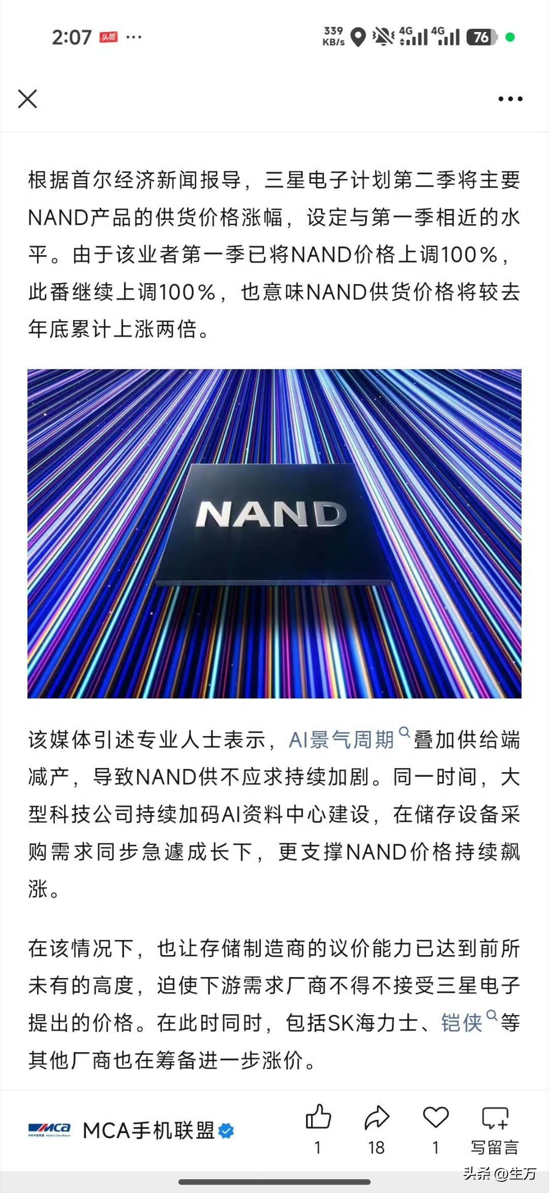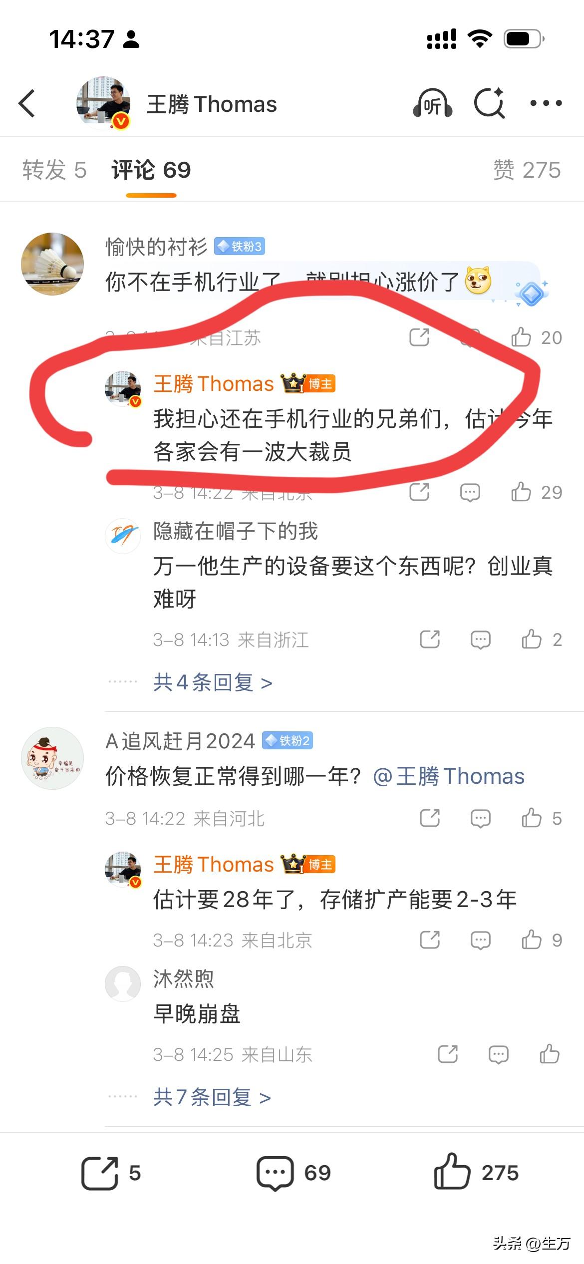 王腾:估计今年各家会有一波大裁员! 就在刚才,王腾在社交网络上感慨,今年对于手机行业的兄弟们来说可能比较难!而且预测可能会有裁员的风险。 因为现在已经是三月份了,已经有行业内内存供应商预测,第二季度价格还会继续上涨,大家都知道,马上四月份五月份就是许多品牌发布新手机的时候,这个时候手机原材料,尤其是内存继续上涨的话,那么无疑会给这些厂家,在本来就增加成本的基础上继续成本上涨。 所以在这个时候真的就是考验大家的库存能力了,前几天卢伟冰在接受采访的时候也表示他们小米是没问题的,因为他们的内存库存足够,能够扛住一段时间,所以可以预测,他们接下来马上发布的那几款新手机以及平板可能不会涨价。 但是如果现在第二季度内存的价格继续上涨的话,对于同行应该就有压力了,如果小米这种大品牌没有压力,那么同行的压力就会清晰地感知的,因为不是每一个品牌在都准备的这么充分,再加上小米华为Oppo Vivo等这些大品牌马上要发布新产品,他们把这一波市场占据之后 ,如果其他的品牌准备的不够充分,面临成本持续上涨,那么接下来的市场冲击就会更加直接,如果内存上涨的趋势继续这样延下去的话,那么结果可能会像王腾说的那样会有裁员的可能性。 所以这样看的话,他的担心还是有理由的,毕竟他在这个行业干得这么多年,这点市场的敏锐度和相关的专业预测能力专业还是在的。