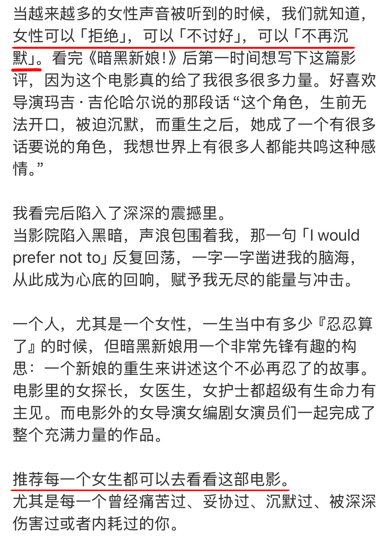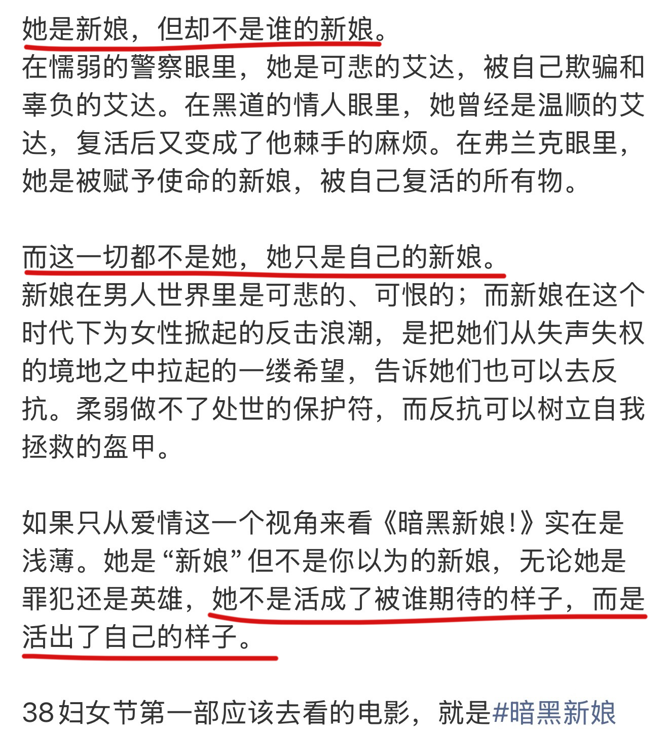 女性从失语到呐喊太戳心 第 一 时 间 看 完《暗黑新娘!》,我 的 内 心 久 久 不能 平 静,这 不 是 一 部 简 单 的 朋 克 惊 悚 片,而是 一 场 献 给 所 有 女 性 的 觉 醒 宣 言。玛吉·吉伦哈尔 自 编 自 导,用 自 己 的 理 解 为《弗兰肯斯坦》赋 予 女 性 视 角,将 原 作 中 曾 经 出 现 过 的那 个 无 名 无 姓 的、极 度 边 缘 的 弗兰肯斯坦 的 新 娘,塑 造 这 次 的 主 角“新娘”,也 想 给“新娘”一 次 开 口 说 话 的 机 会。艾达 生 前 是 被 噤 声 的 底 层 女 性,死 后 被 复 活,沦 为“被 创 造 的 伴 侣”。她 没 有 过去、没 有 名 字、没 有 选 择 权,所 有 人 都 想 定 义 她、占 有 她。只 有 她 的 黑 唇 与 脸 上 的 墨 迹 成 为 了 她的 标 志,而 这 也 同 样 是 导 演 为 两 百 年 前 的 玛丽·雪莱 未 能 开 口 的 巧 思,想 要 借 由 新 娘 之口,说 出 女 性 的 挣 扎 与 觉 醒。从 手 术 台 上 的茫 然 失 语,到 看 清 真 相 后 的 颤 抖 质 疑,再 到撕 碎 枷 锁、直 面 强 权 的 嘶 吼 反 抗,她 的 蜕 变真 实 又 戳 心。她 不 做 谁 的 救 赎,不 做 实 验 室 的 标 本 ,更不 做 依 附 他 人 的 新 娘。她 用 最 决 绝 的 方 式,夺回 为 自 己 发 声 的 权 利、找 回 自 己 真 正 的 名 字 而 非 新 娘、更 有 不 做 任 何 人 的 新 娘 的 选 择。当 她 在 黑 暗 中 喊 出 那 句“我 不 是 任 何 人 的 新娘”, 全 场 都 被 这 股 力 量 击 中。影 片用 暗 黑 美 学 包 裹 温柔内核:失 语 是 过 往,呐 喊 是 新 生。每 一 个 曾 被 规 训、被 忽 视、被 要 求 沉 默 的 人,都 能 在 艾达 身 上 看 见 自 己 。这 不 是复 仇,是 女 性 对 自 我 主 权 的 宣 告——我生 来 自 由,不 为 取 悦 谁,只 为 成 为 我 自 己。三 月 必 看 的 女 性 力 量 神 作,答 应 我,一 定 要 去 影 院 感 受 这 场 从 无 声 到 震 耳 欲 聋 的 觉 醒 风 暴。