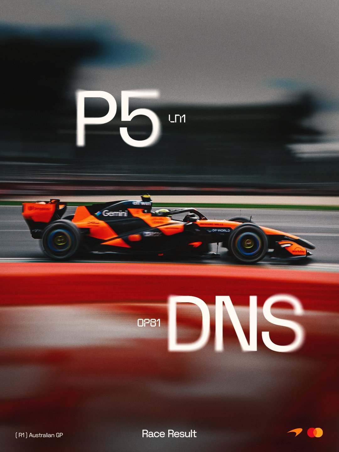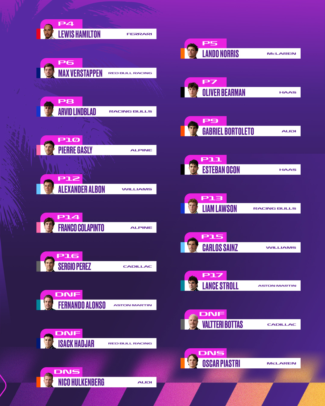 汉密尔顿第四,诺里斯排名第五,维斯塔潘排名第六,他凭借提升14个名次成为当日最佳车手。科拉平托因受罚最终排名第14,佩雷斯排名第16。皮亚斯特里在暖胎圈发生撞车事故,未能发车🏁