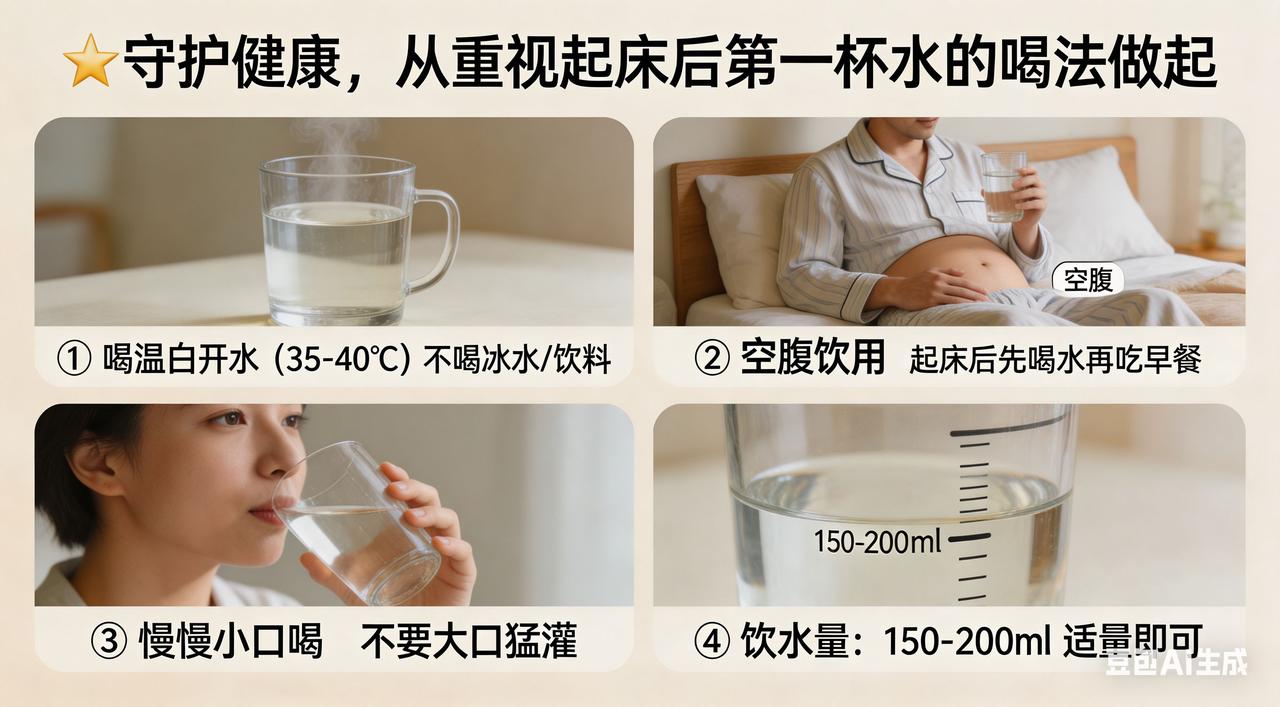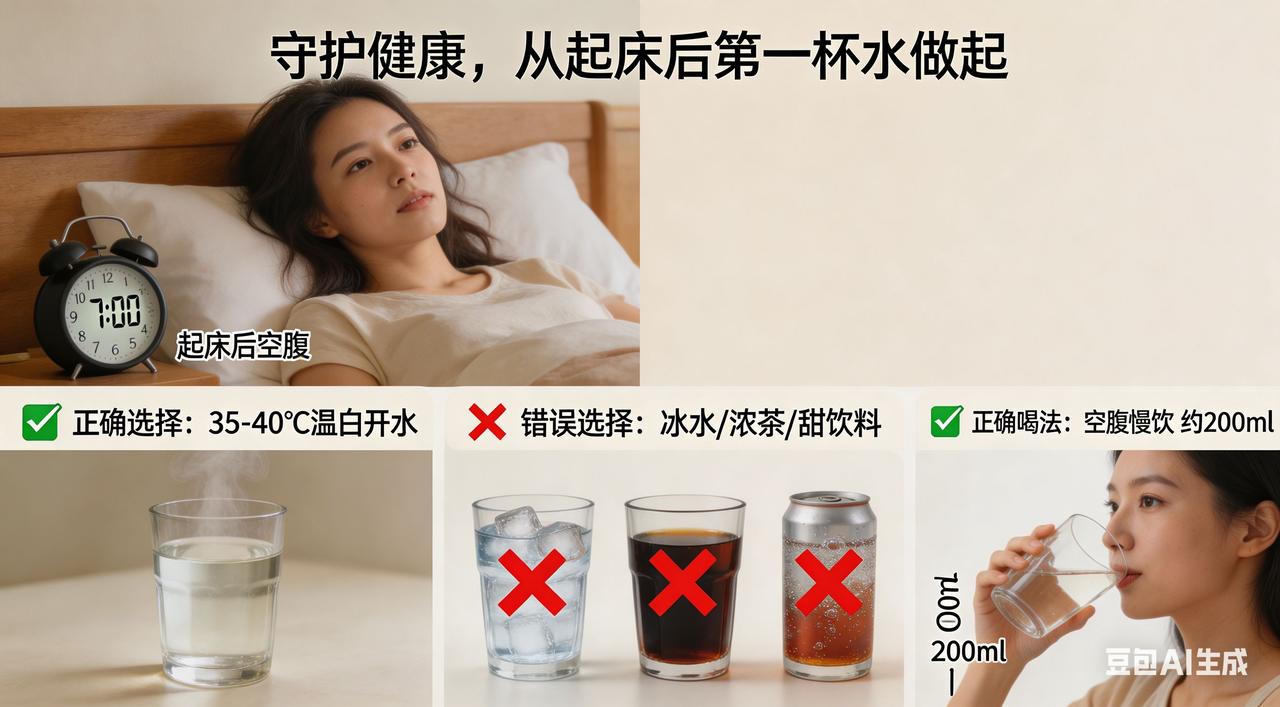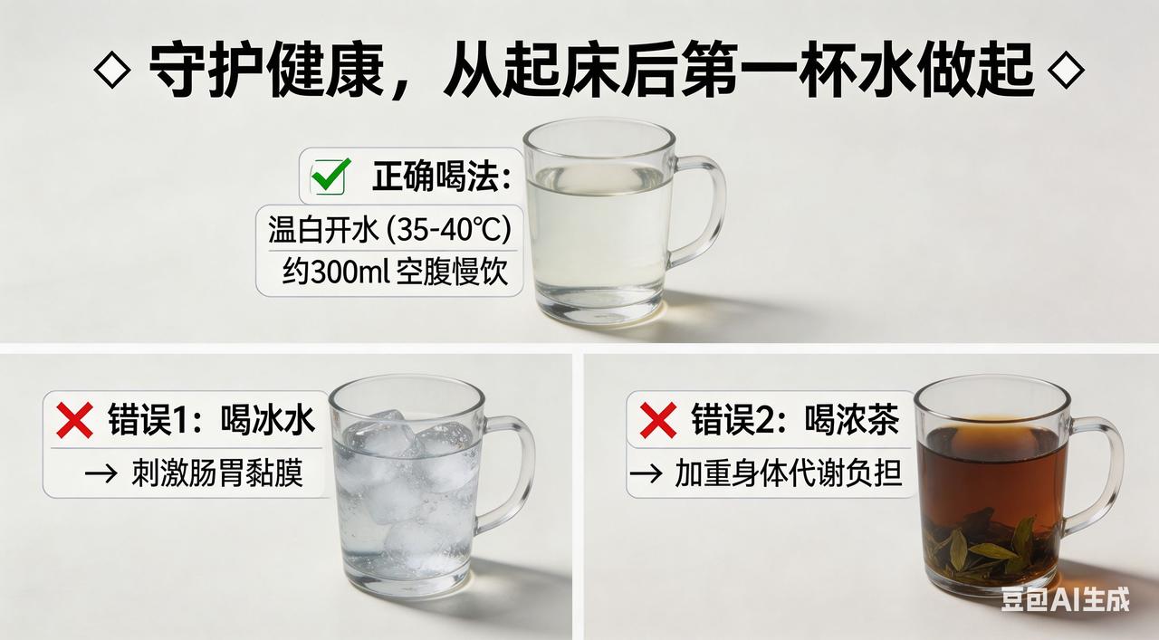 守护健康,从重视起床后第一杯水的喝法做起晨起第一杯水: 喝对是“仙丹”,喝错变“毒药”! 你是否想过,当我们沉醉在梦乡,身体却像个勤劳的“小工匠”,在悄无声息地忙碌着。呼吸、排汗、新陈代谢……每一个动作都在消耗着体内的水分。等清晨的第一缕阳光洒进房间,我们的身体已然成了一片干涸龟裂的“荒漠”,急切地盼望着一场清润的“甘霖”来拯救。而这“甘霖”,就是起床后的第一杯水!可别小瞧这杯水,它就像一把神奇的钥匙,能开启健康一天的大门;又似一位隐形的健康卫士,默默守护着我们的身体。但要是喝错了,它也可能摇身一变,成为危害健康的“毒药”! 水温:肠胃的“温柔杀手”还是“贴心暖宝”? 很多人晨起喜欢猛灌一杯冰水,那冰爽刺激的感觉,仿佛能把全身的疲惫和困意都瞬间驱散。可你知道吗,这看似畅快的举动,对肠胃来说却是一场“灾难大片”!想象一下,在冰天雪地中,你突然把双手伸进冰水里,那种刺骨的寒冷会让你忍不住浑身颤抖。肠胃也是如此,过冷的水就像一把把锋利的小冰刀,强烈刺激胃肠黏膜,让血管瞬间收缩,胃肠痉挛随之而来。肠胃敏感的人,可能不一会儿就会腹痛如绞、腹泻不止,美好的早晨就这样被“冰”得支离破碎。 而过热的水则是另一个极端,它就像熊熊燃烧的“火焰”,轻易就能烫伤口腔和食道黏膜。长期频繁饮用,就像在食道上不断“烙印”,大大增加患食道癌的风险。所以,35℃ - 40℃的温水才是肠胃的“贴心暖宝”,它接近人体体温,温柔地滋润着肠胃,就像妈妈轻轻抚摸孩子的脸庞,既温暖又舒适,让肠胃在清晨就能感受到满满的关爱。 水量:身体的“滋润秘籍”还是“沉重负担”? 喝水太少,就像给干涸的土地只洒了几滴“毛毛雨”,根本无法满足身体的需求。身体就像一台精密的机器,缺了水,各个零件就会运转不畅,新陈代谢变得迟缓,毒素也难以排出体外。而喝水太多,则如同给肠胃灌了一桶“洪水”,会加重肠胃负担,让胃液像被稀释的墨水一样,消化功能大打折扣。 一般来说,起床后先喝200 - 300毫升的水最为适宜。喝的时候要像品味一杯珍贵的红酒一样,小口慢饮,让身体有足够的时间吸收水分。就像给干涸的土地慢慢浇水,让每一寸“土地”都能充分吸收水分,让身体从内到外都焕发出勃勃生机。如果是老年人或患有某些疾病的人,可根据自身情况适当调整饮水量,避免给身体带来不必要的麻烦。 喝水时间:健康的“仪式感”还是“细菌盛宴”? 喝水的时间也有大学问,最好在洗漱完毕后喝。经过一夜的睡眠,口腔就像一个细菌的“狂欢派对现场”,滋生了大量细菌。如果未洗漱就喝水,这些细菌就会像一群饥饿的“小怪兽”,随着水流欢快地涌入肠胃,引发肠胃不适。洗漱后再喝水,就像给身体进行了一场干净卫生的“健康仪式”,能保证喝进去的水纯净无污染,让身体真正享受到清水的滋养,开启活力满满的一天。 水的种类:健康的“智慧之选”还是“甜蜜陷阱”? 白开水是最经济实惠、健康安全的选择,它不含热量,就像一股清澈的泉水,能直接被人体吸收利用,为身体注入纯净的能量。而淡盐水并不适合大多数人,尤其是高血压患者。喝淡盐水就像给已经“高压”的身体又加了一把“盐”,会使血压升高,增加健康风险。蜂蜜水则不适合糖尿病患者和肥胖人群,因为蜂蜜中含有大量糖分,喝多了容易导致血糖升高、体重增加,就像掉进了一个“甜蜜陷阱”。 起床后喝好第一杯水,是开启健康生活的“秘密武器”。掌握正确的喝水方法,让这杯水成为我们健康的“守护天使”,陪伴我们度过每一个充满活力的日子。从现在开始,用心对待这起床后的第一杯水,让健康与我们一路同行,拥抱美好的未来!