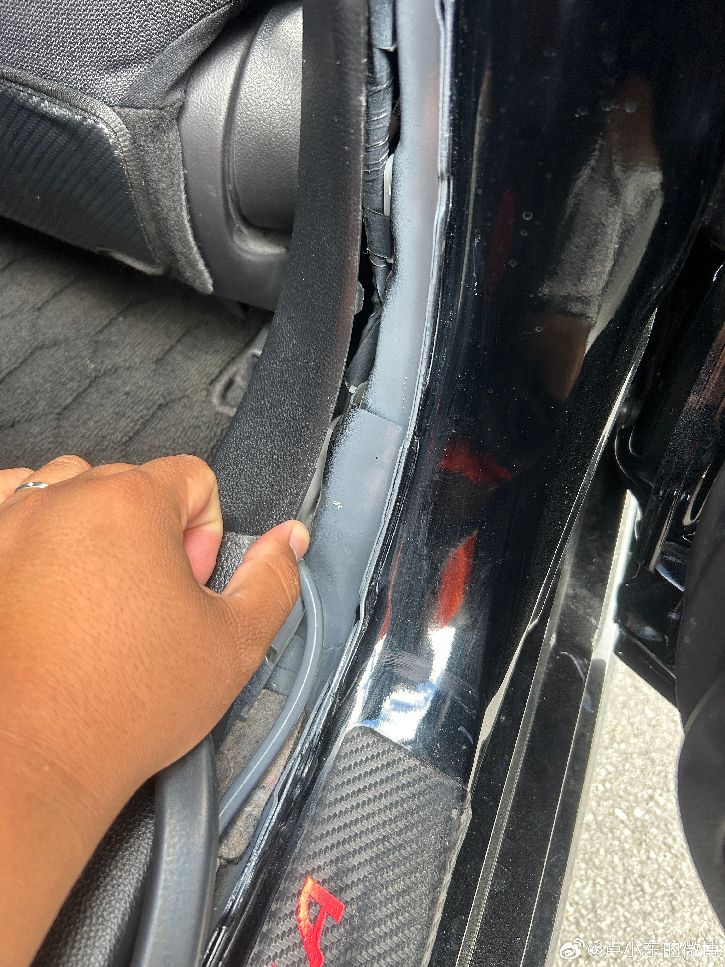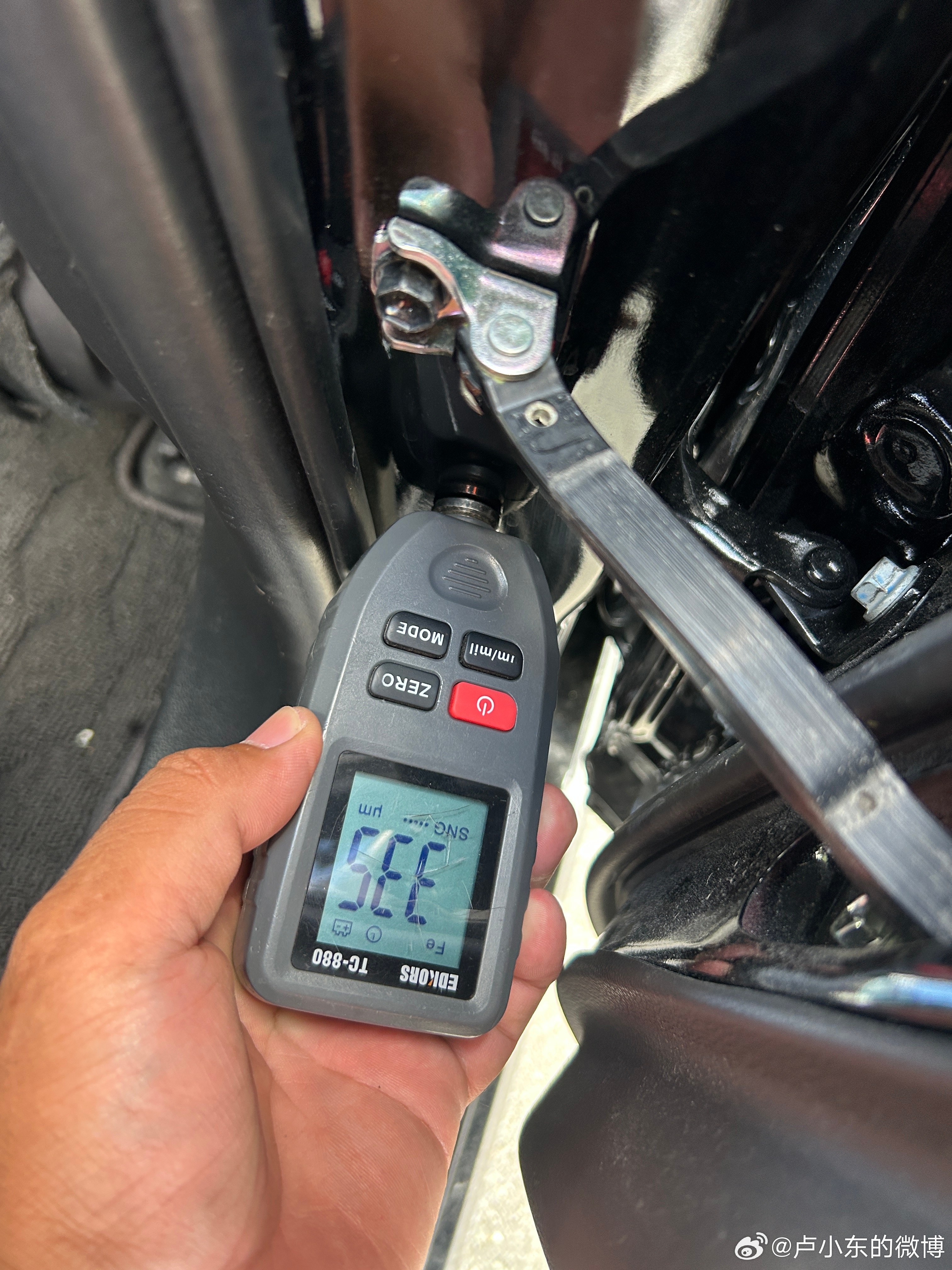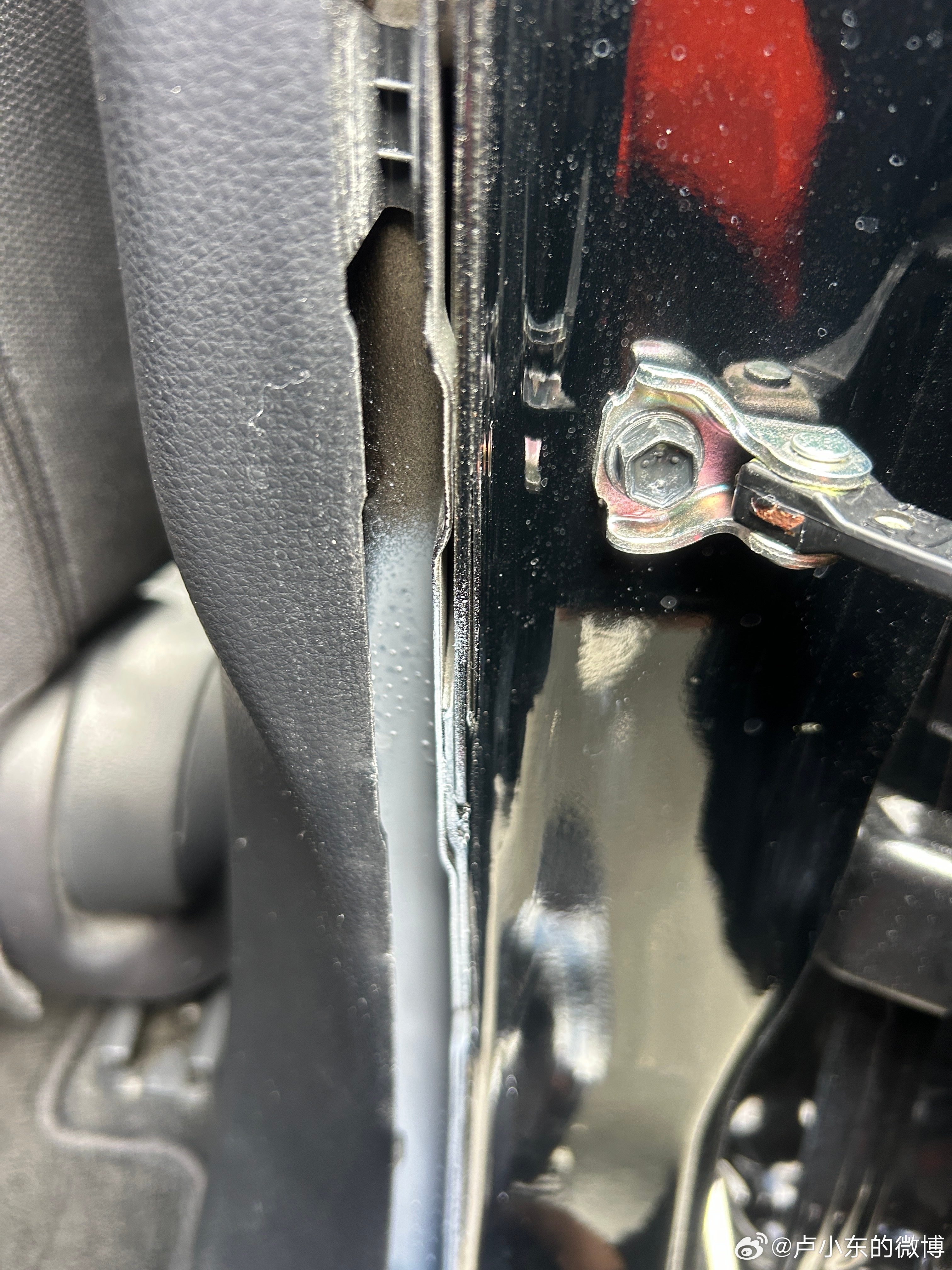 首先是覆盖件漆膜仪数值异常,进一步检查发现覆盖件有拆卸痕迹,在用漆膜仪检查里口漆面厚度的时候赫然发现 B 柱漆面数值高的不正常,遂扒胶条进一步查看。