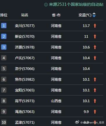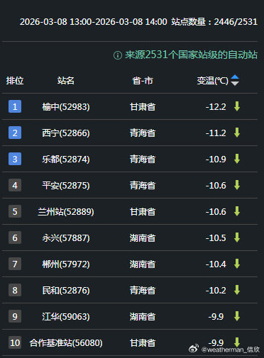 【气温波动】今天气温变化依然和光照(辐射因素)密切相关。青海甘肃湖南因为雨雪遮挡光照,气温下降明显。西宁降11.2℃,兰州降10.6℃,分别排在14时全国降温榜第二和第五。从东北到华北黄淮多地,晴天光照加热,气温回升。河南山西站点包揽了14时升温榜前十,河南栾川升13.7℃,排名第一。
