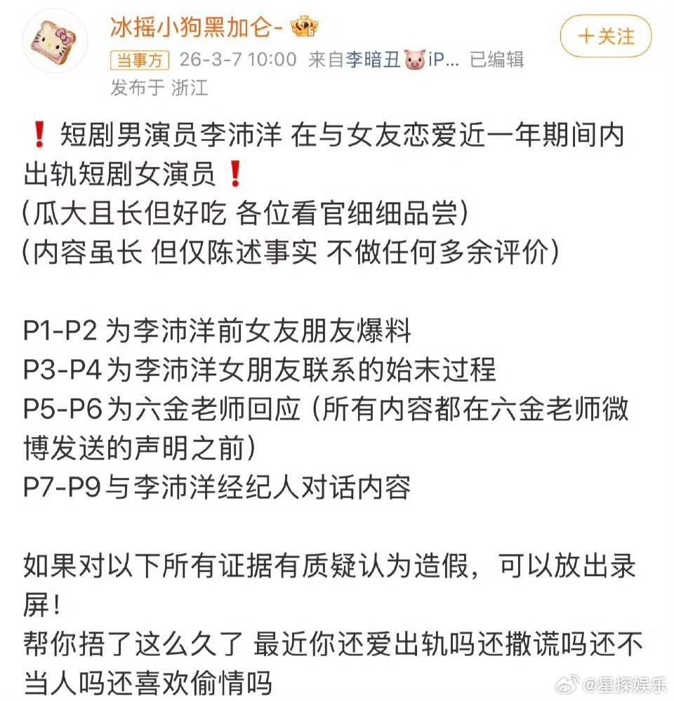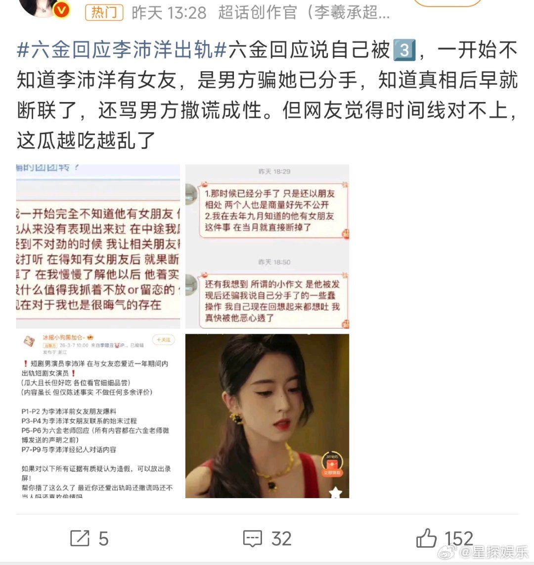 六金 被小三短剧圈这瓜真的越吃越离谱…李沛洋这操作也太绝了,一边跟女友绑定定位、家里装监控,一边还能无缝衔接往返杭州横店,把两个女生都蒙在鼓里。六金这边说自己是“被小三”,但时间线又跟郑元松那边对不上,到底谁在撒谎啊?现在连剧都延期了,只能说艺人私德真的太重要了,塌房率这么高,真的该好好管管了。