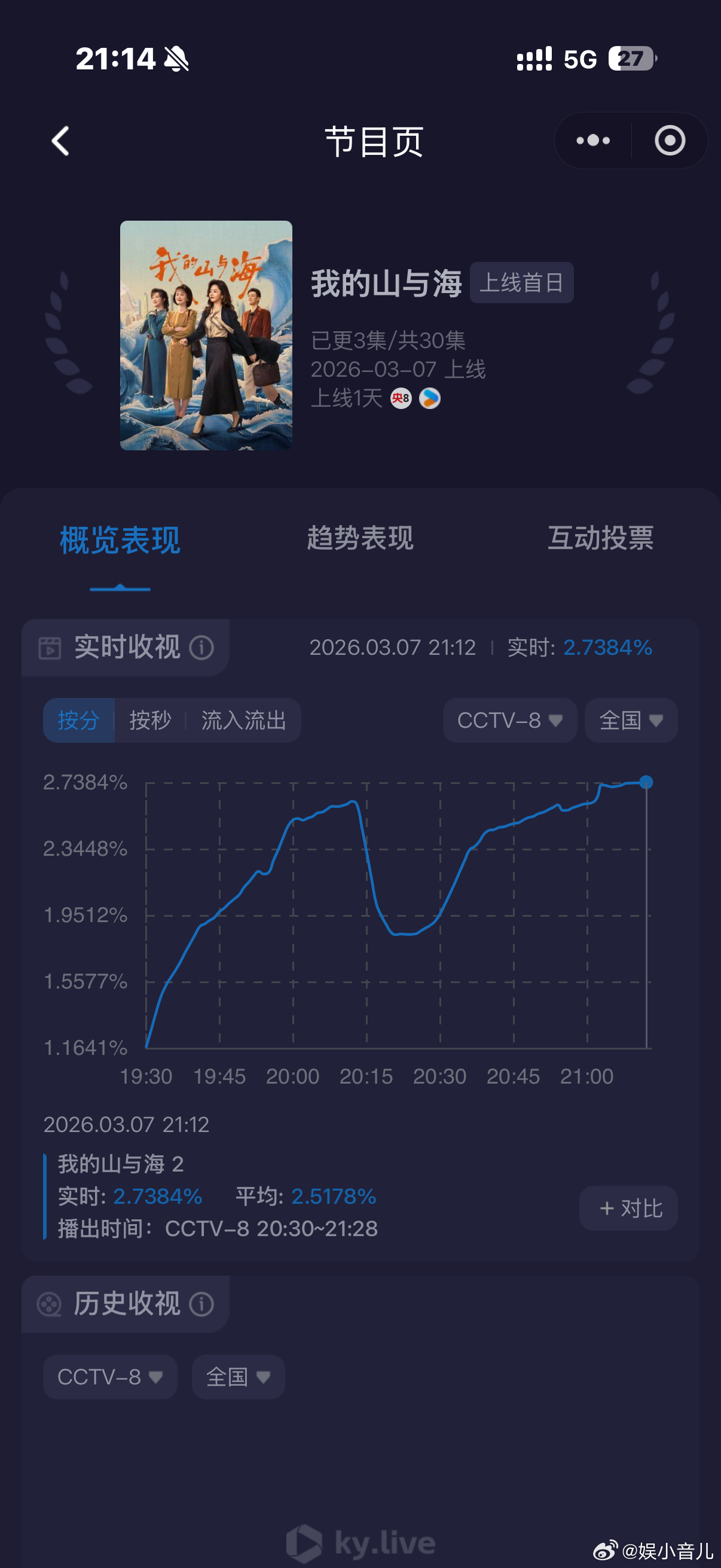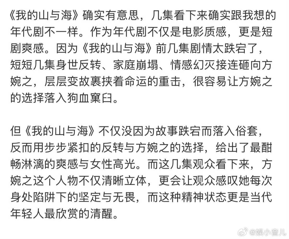 我的山与海欢网收视峰值破3 我的山与海已经成功加入我的必追剧清单中了,刚开播就一口气看过瘾了,剧情和节奏都拿捏的刚刚好,太上头了