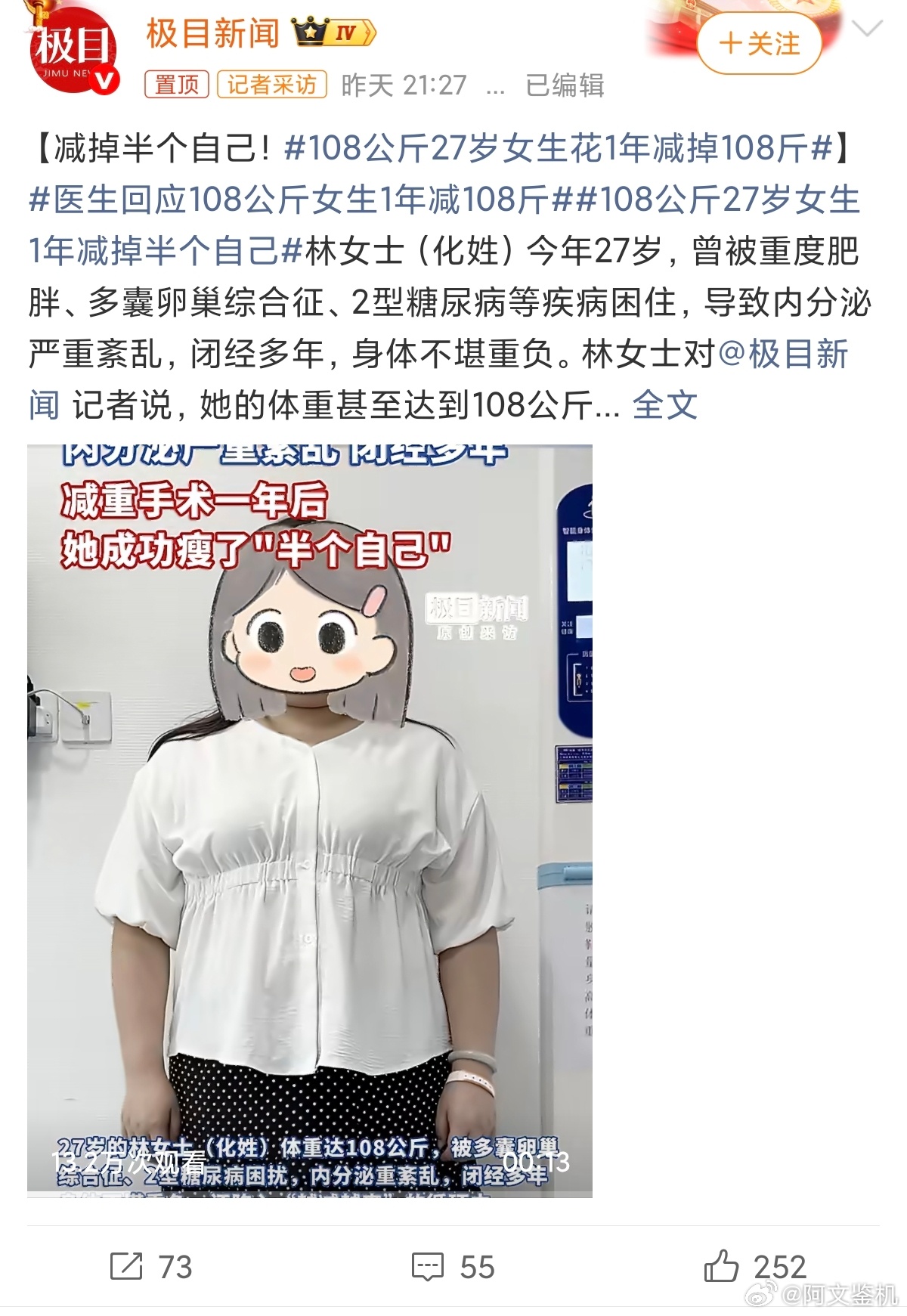 108公斤27岁女生花1年减掉108斤哎呀,我最近也一直被肥胖困扰,由于直播原因,每天晚上都要熬夜直播,白天睡觉,昼夜彻底颠倒,加上晚上直播完要吃夜宵,导致现在体重飙升到190斤,其实每天也就吃两顿饭,我也意识到该减肥了,但是不知道从何减起,这可如何是好啊?