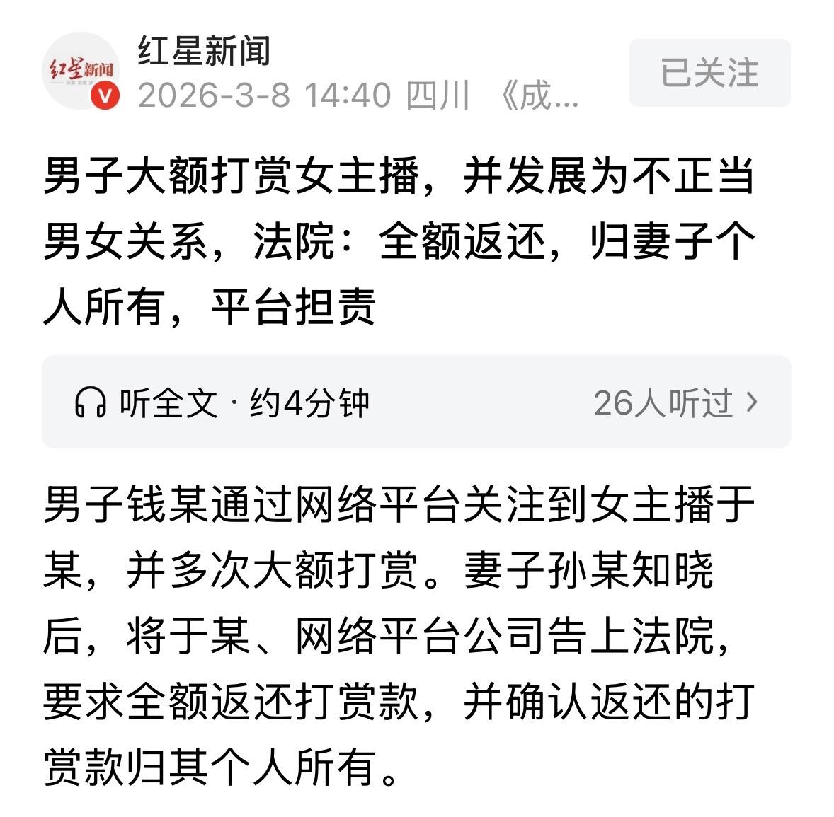 江苏,已婚男子被一女主播吸引,多次大额打赏,女主播看他有实力,和他线下见面,2人开始了婚外情,期间男子为了充大款,更加卖力砸钱,用的还都是夫妻共同财产,妻子发现后,气得直接把女主播和网络平台公司告上法院,要求全额返还打赏的钱,并且,这笔钱必须归她个人所有。法院判了! 2018年,钱某在网上刷到了女子于某的直播。 对方穿着清凉,动作妩媚,钱某看得眼睛都直了。 起初他还只是看看热闹,后来就开始打赏,再后来,两人互加了微信,线下一见面,直接搞起了婚外情。 钱某那时候是昏了头,为了在情人面前充大款、博欢心,也为了维系这段见不得光的关系,开始疯狂砸钱。 他用的可不是自己的私房钱,而是跟妻子孙某的共同财产。 平台有规矩,打赏的钱,主播于某拿四成,平台拿六成。 钱某不在乎,只要于某在屏幕前甜甜地喊一声,或者线下见一面,几万几万地刷出去,他眼都不眨。 纸终究包不住火。妻子孙某不是傻子,查银行流水、看微信账单,很快就发现了猫腻。 看着那一笔笔巨额的打赏记录,再看看丈夫手机里那些露骨的聊天记录,孙某气得浑身发抖。 但她没在家里大吵大闹,而是冷静地收集证据,一纸诉状把于某和那个网络平台公司告上了法庭。 孙某的诉求很硬:钱某给出去的钱,赠与行为无效,必须全额退回来,而且这钱得归我个人所有,没钱某的份儿! 法庭上,三方对峙,火药味十足。 钱某坐在被告席旁边,低着头,不敢看妻子的眼睛,心里虚得很。 他知道自己理亏,挥霍了家里的钱,还搞坏了名声。 于某却觉得委屈,辩解说:我开直播靠本事赚钱,他看我直播打赏,这是正常的服务交易,我又没逼他,凭什么说退就退? 平台公司更是觉得,我们只是提供技术服务,用户充值打赏,我们收点技术服务费怎么了?主播穿什么、说什么,我们也不能24小时盯着啊! 法院会怎么判呢? 《最高人民法院关于适用〈民法典〉婚姻家庭编的解释(二)》第7条第1款:夫妻一方为重婚、与他人同居以及其他违反夫妻忠实义务等目的,将夫妻共同财产赠与他人或者以明显不合理的价格处分夫妻共同财产,另一方主张该民事法律行为违背公序良俗无效的,人民法院应予支持并依照民法典第一百五十七条规定处理。 钱某在婚姻存续期间,基于与于某的不正当男女关系,擅自将大额夫妻共同财产用于打赏,该行为不仅侵犯了妻子孙某的财产权,更严重违背了公序良俗和夫妻忠实义务。 法官认为这根本不是什么正常的看直播打赏,而是典型的“拿钱养小三”。 钱某给于某大额打赏,目的只有一个,那就是维持不正当男女关系。 这不仅挥霍了夫妻共同财产,更是严重违背了社会的公序良俗。这种赠与,法律上直接定性为“无效”。 无效的意思就是,这事儿从一开始就不作数,拿了的就得吐出来。 对于于某,法官说了:你明知钱某有家室,还跟他搞婚外情,还诱导他大额打赏,你这钱拿得烫手,必须全额返还! 对于平台,法官也没放过。于某直播时穿着暴露、动作挑逗,平台不仅不管,连监管部门要求的“打赏限额提醒”都没做到,这就是监管不力。 虽然你收的是技术费,但你没尽到责任,酌情判你退还30%的收益。 最让钱某难受的是最后一条。根据最新的司法解释,这返还回来的钱,不属于夫妻共同财产了,全部归孙某个人所有。 这意味着,钱某不仅丢了人,还彻底失去了对这笔钱的支配权,算是对他挥霍行为的惩罚。 依据该法条,法院认定钱某的赠与行为无效。核心在于“目的违法”:钱某打赏并非为了正常娱乐,而是为了维系婚外情,这种基于不法原因的给付,法律不予保护。 法条明确赋予无过错方孙某主张无效的权利,一旦认定无效,依据民法典157条,因该行为取得的财产应当返还。 此外,该判决体现了对过错方的惩戒。法院依据相关规定,判决返还的款项归孙某个人所有,而非夫妻共有,这实际上是对钱某挥霍、转移共同财产行为的惩罚。 判决书下来,于某傻眼了,不仅到手的鸭子飞了,还得倒贴钱。 平台公司虽然只退了一部分,但也肉疼,还得整改。 判决下来,孙某虽然出了口气,但也不痛快,钱是追回来了,可被背叛的伤痕哪是一纸判决能抚平的? 对此,你怎么看? 关注@运良说法 学法律知识不迷路