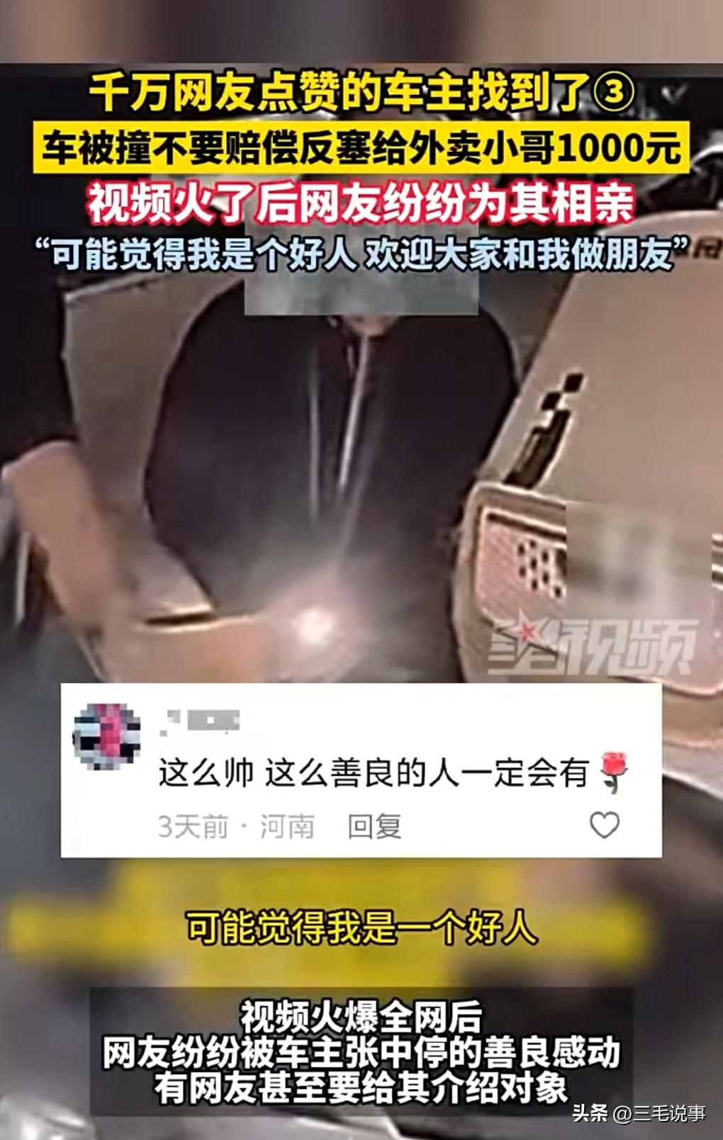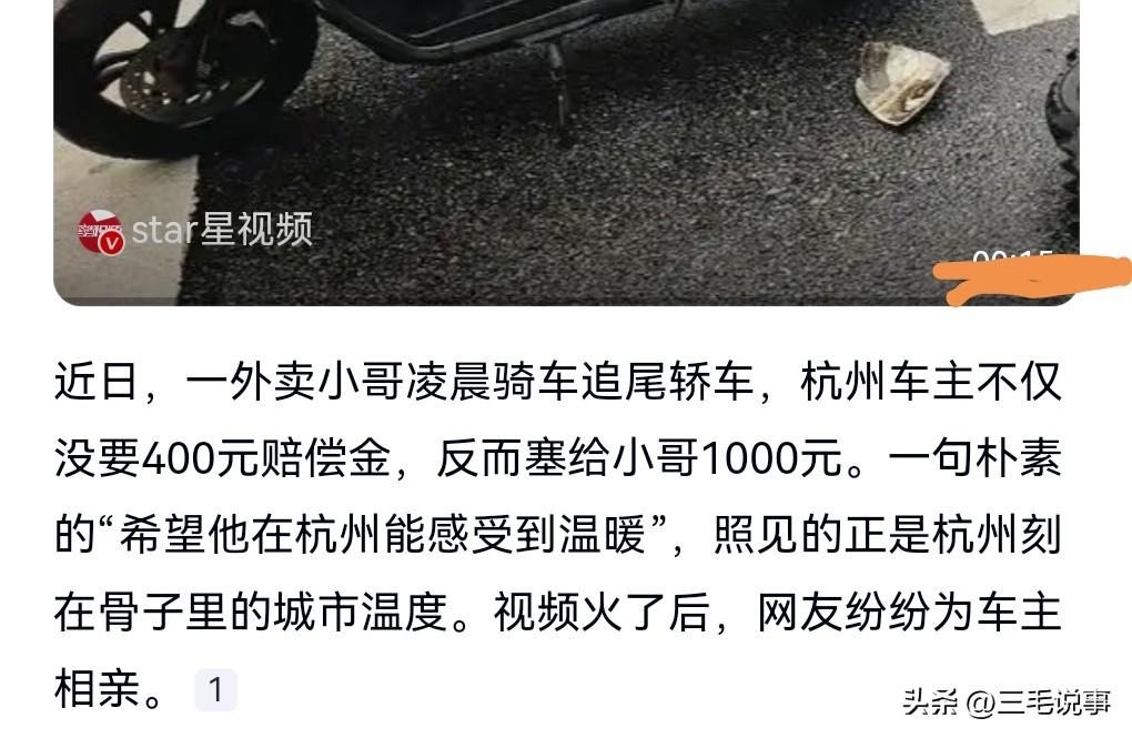 千金易得,好人难求。 这小伙子实在是太好了。 车被撞不要赔偿,反塞给外卖员1000元。 这就是善良啊,怪不得有网友要给他介绍对象。 谁能不喜欢一个善良的人呢? 近日,一外卖小哥凌晨骑车追尾轿车,杭州车主不仅没要400元赔偿金,反而塞给小哥1000元。 这真的是好人中的好人。 一句朴素的“希望他在杭州能感受到温暖”。